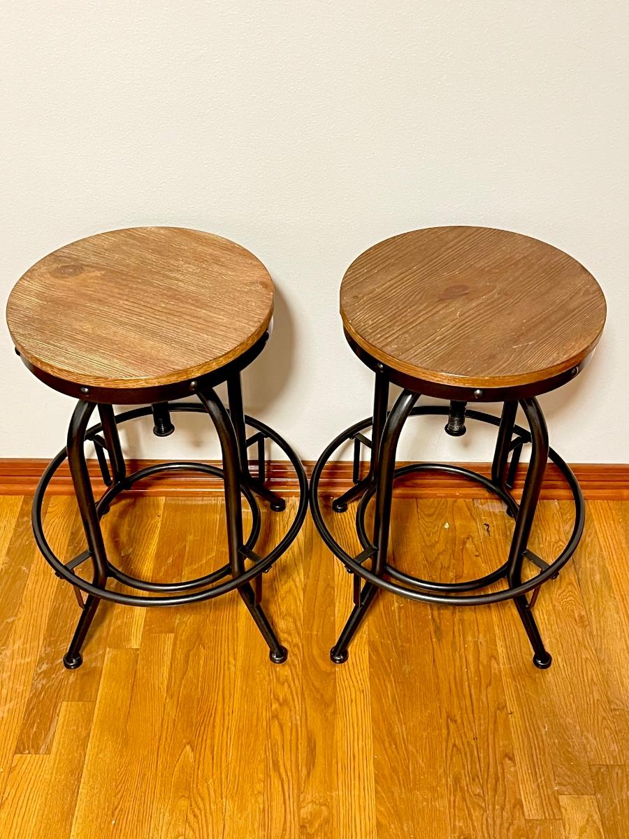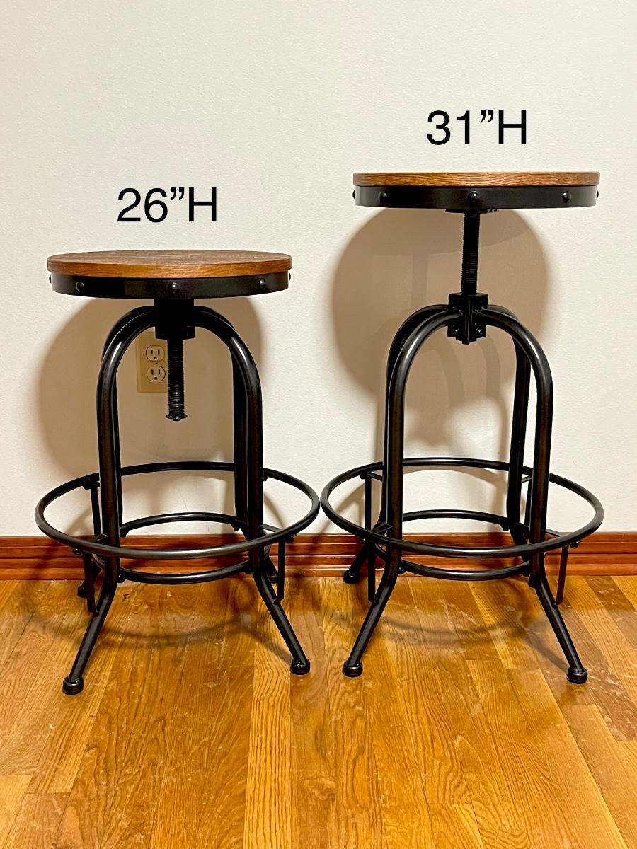 Heavy weight metal & wood stools height range from 26” to 31” H x 15” Round Seat ~ Base 18.5” Round