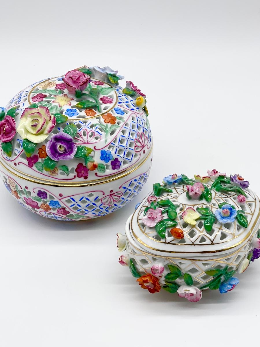 Big one = 5.5” H x 6” Round ~ Small one = 3.5” H x 5.5” x 4.5” ~ No chips, cracks or damage