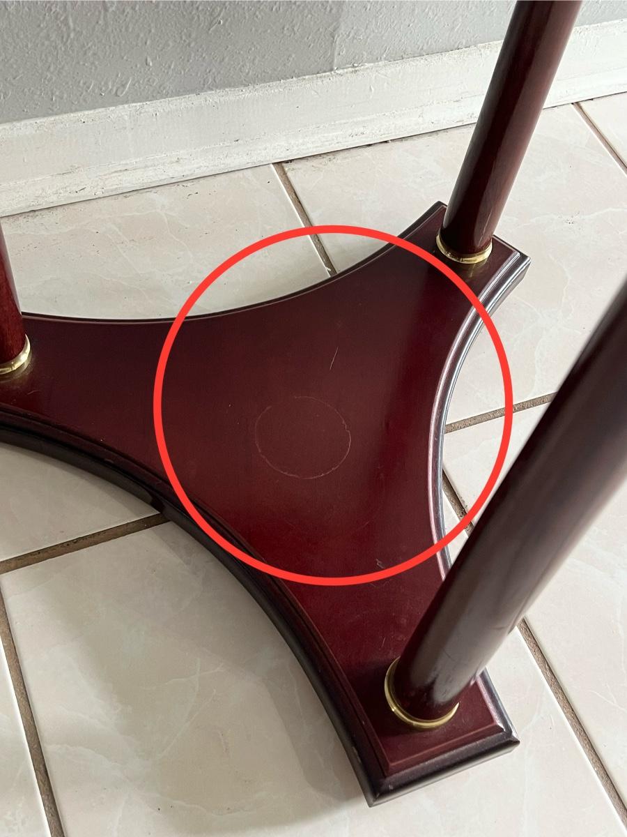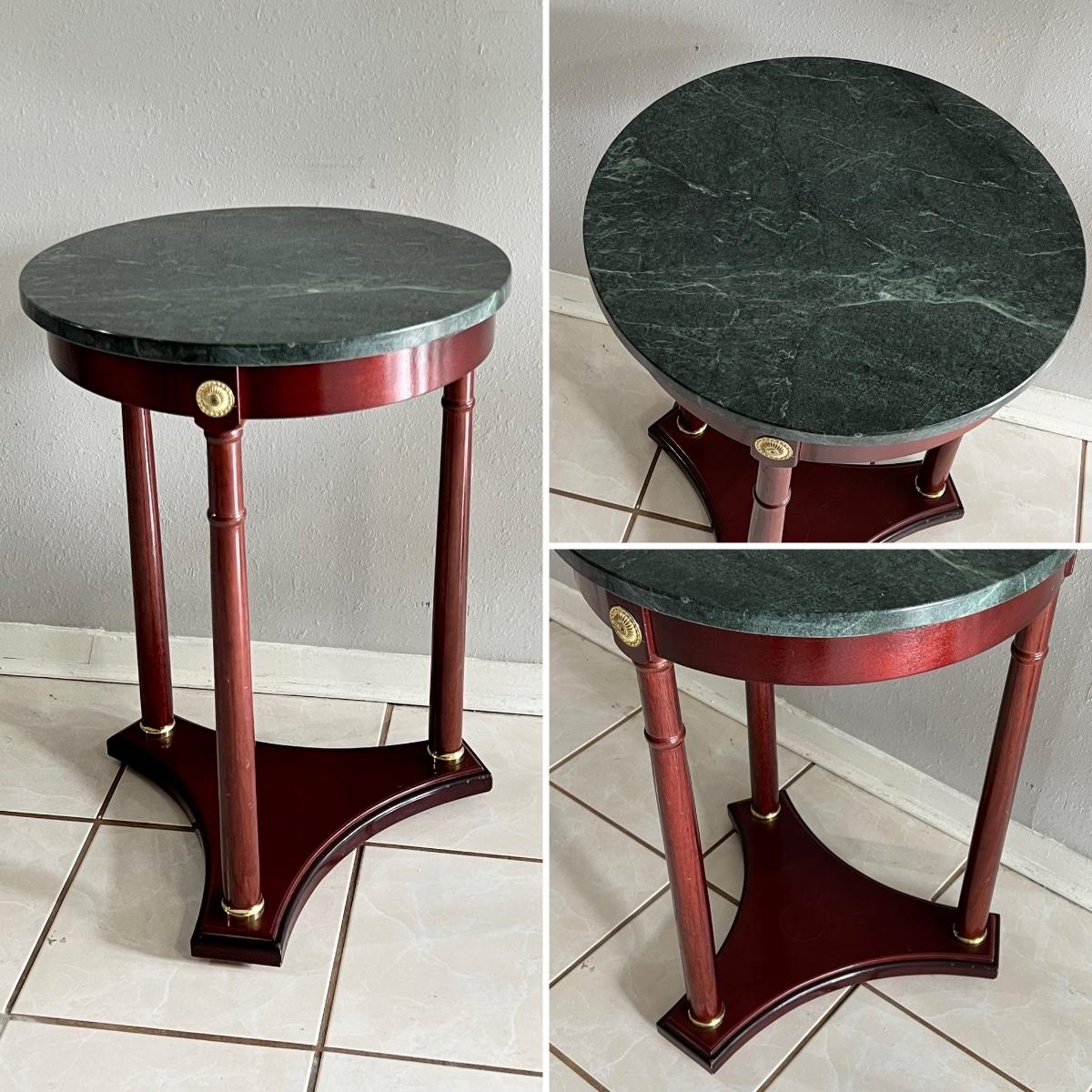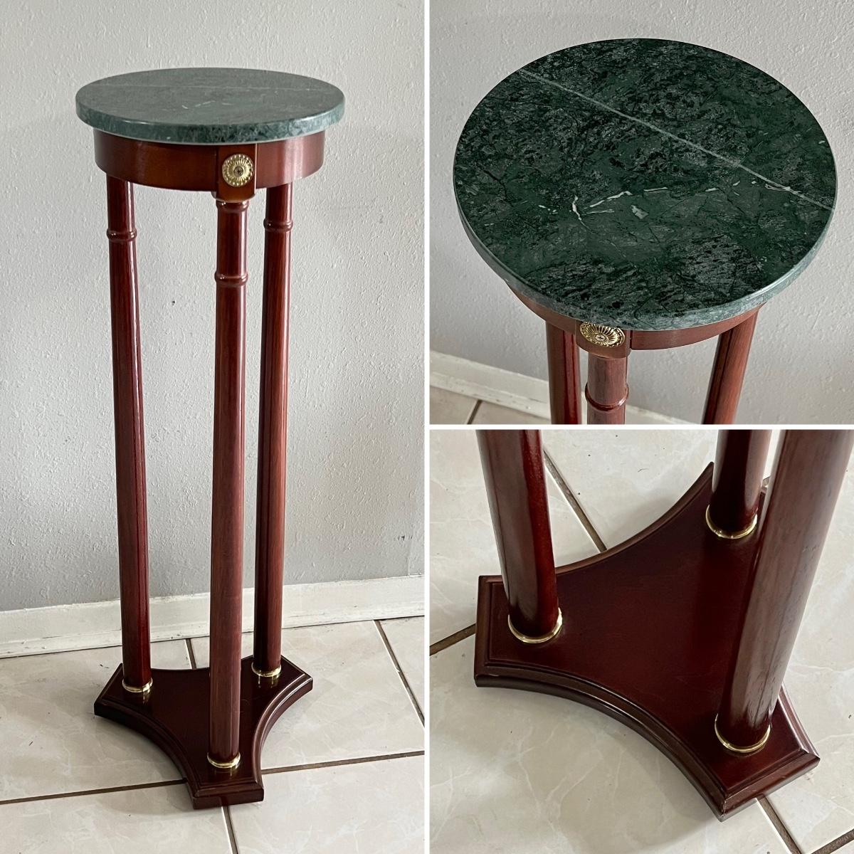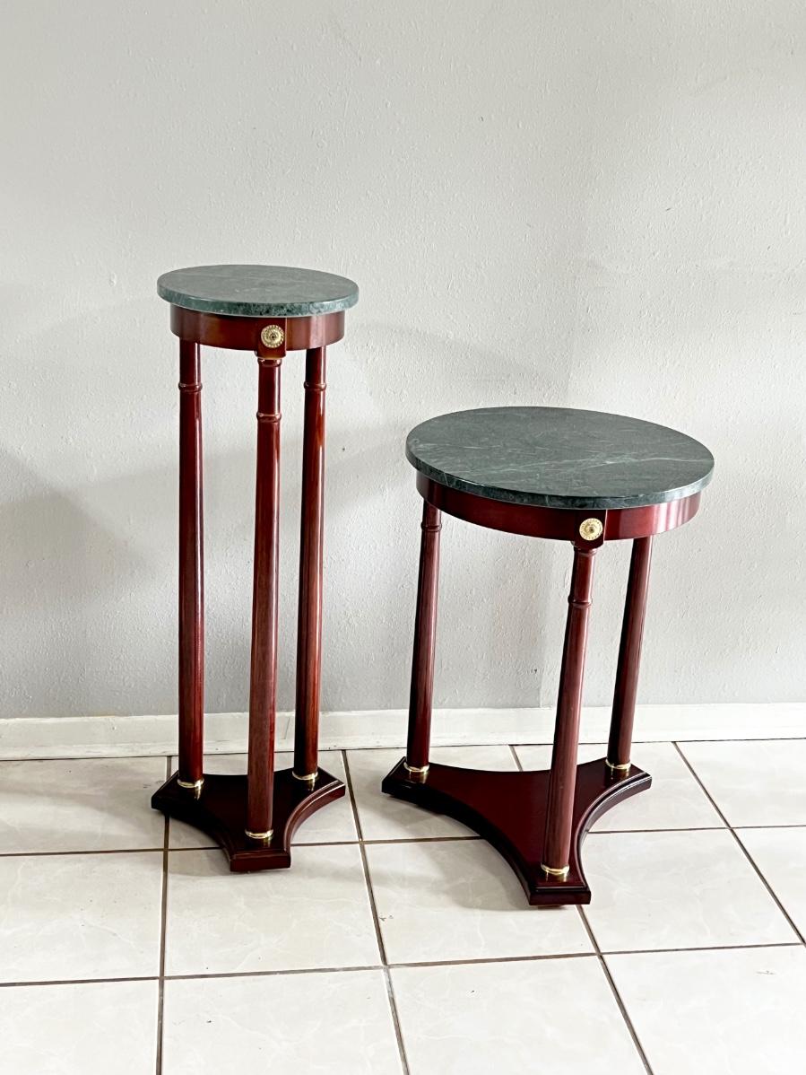 Taller table looks like the marble top has a crack but it’s just the design of the marble ~ Taller table = 35” H x 11” Round ~ Shorter table = 25.5” H x 18” Round ~ Shorter table has a minor ring spot on the bottom, see photos ~ No brand found