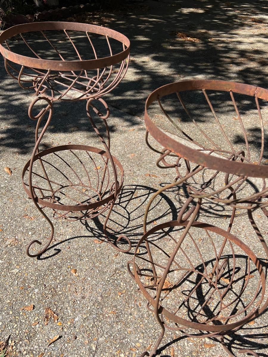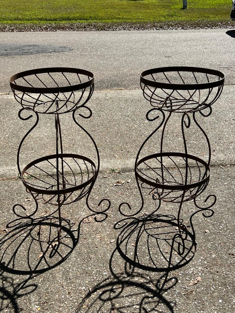They have been outside. Has minor surface rust. 33” H x 16” Round. Both plant holders = 16” Round