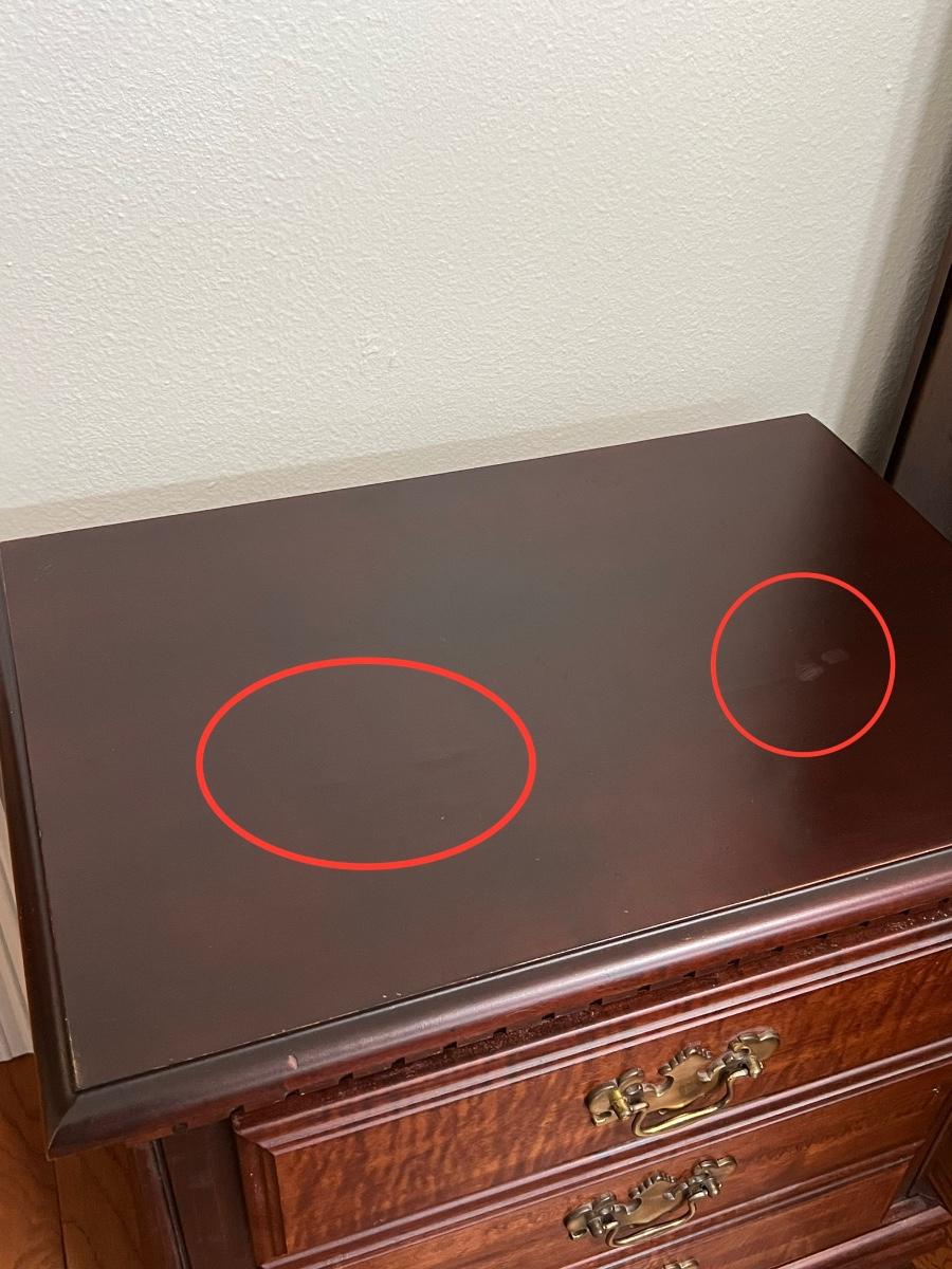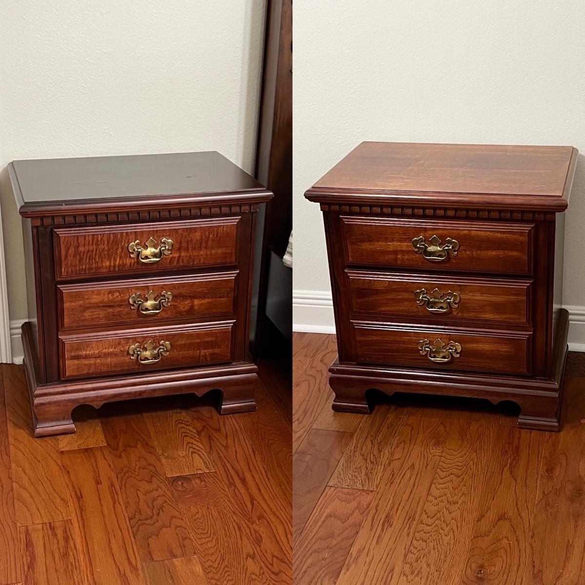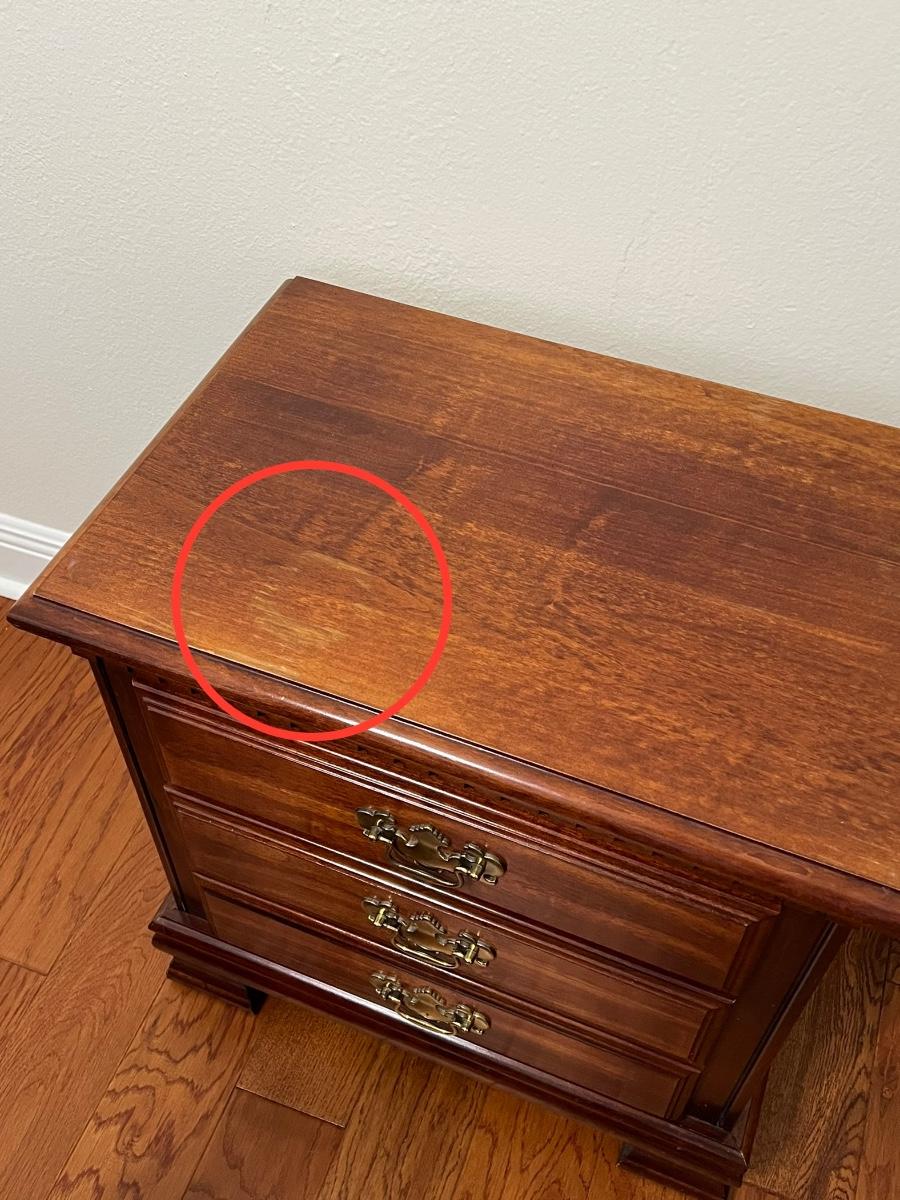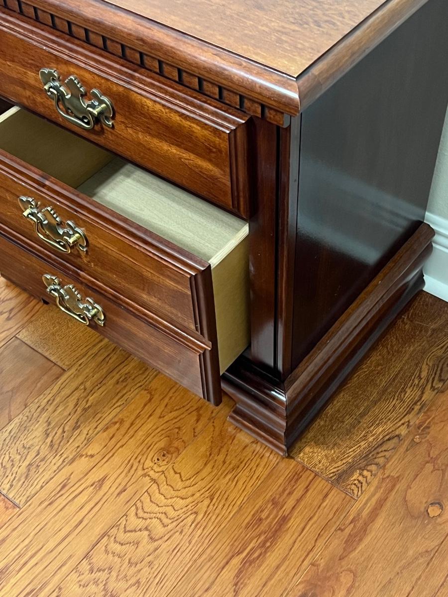 Drawers slide in & out easily ~ No name brand found ~ The tops on both have some minor water spots from cups ~ The top of 1 night stand is faded from the sun, see photos ~ Both = 25” H x 24” W x 16” D