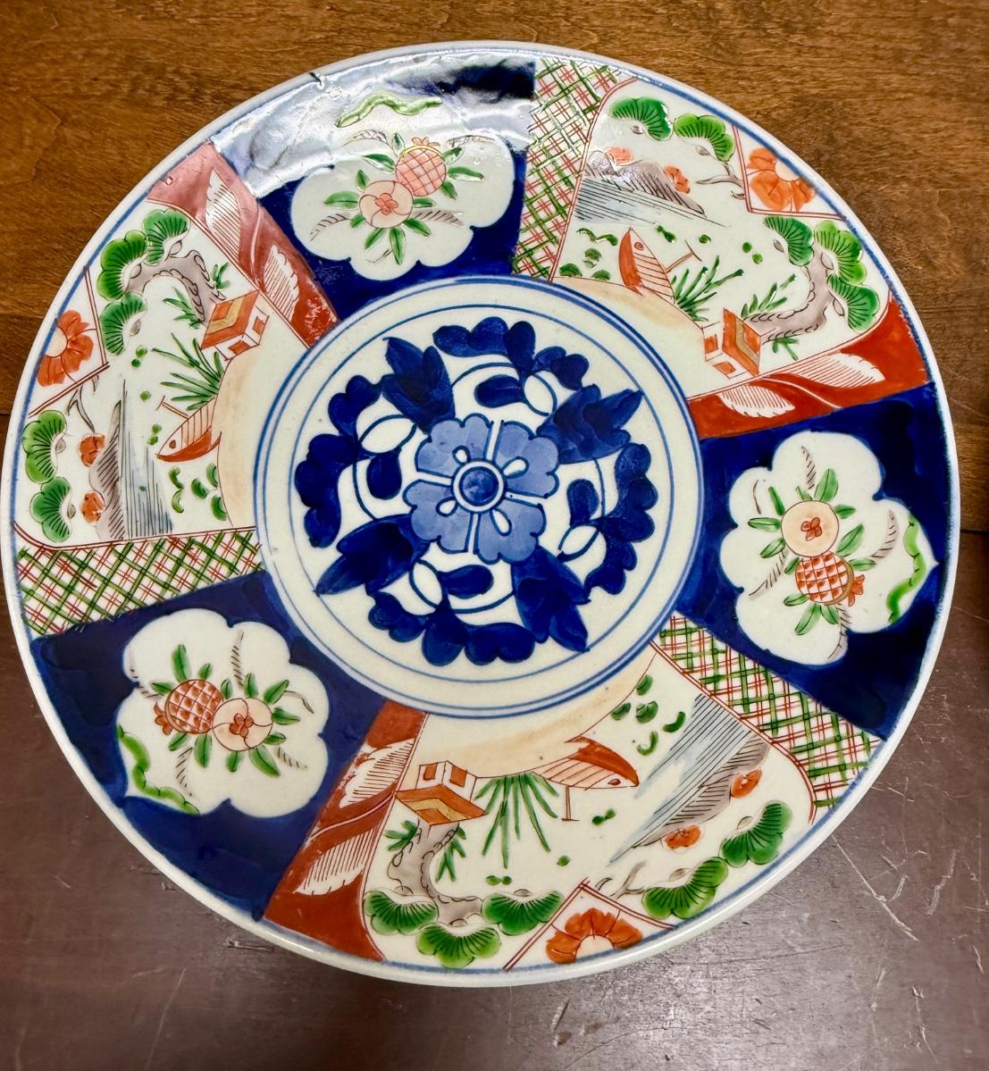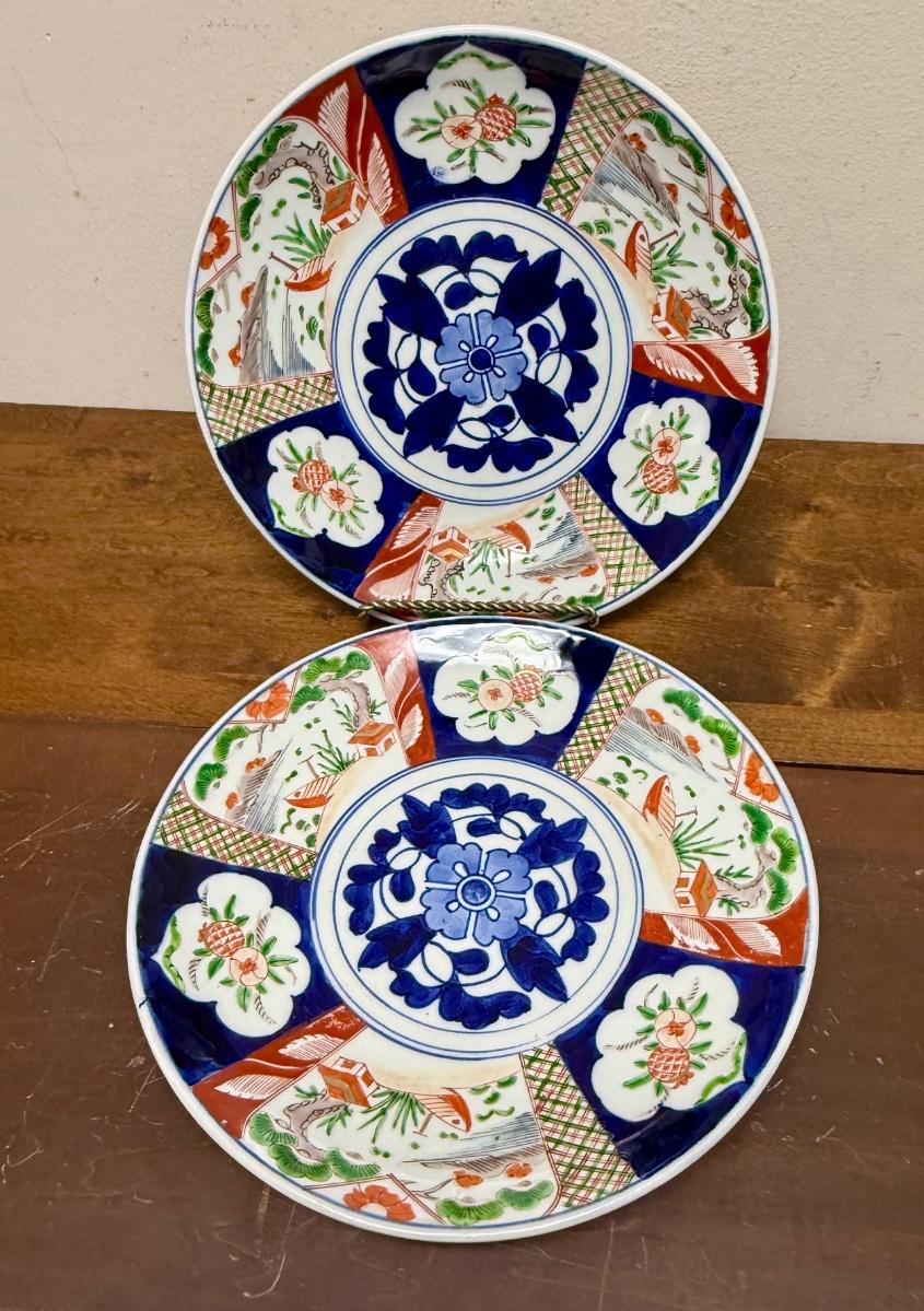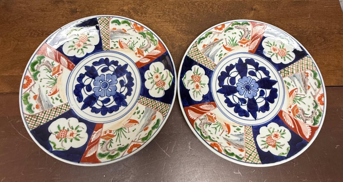 Pair (2) of large Plate Charger Platter Japanese Imari Porcelain Cobalt Blue Red 12" diameter