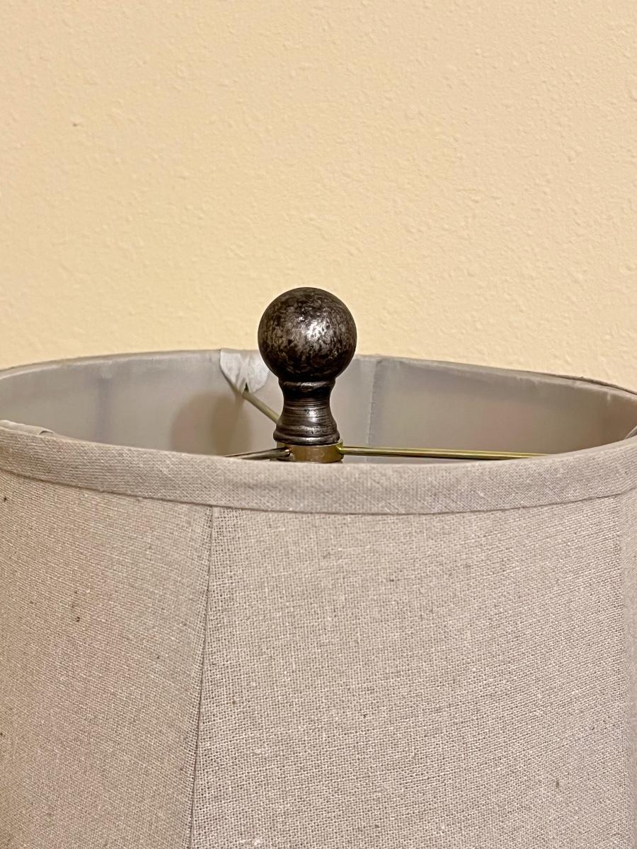 Base is made of a resin type of material & stem is metal. Has linen shade. 32” H x 11” Round.