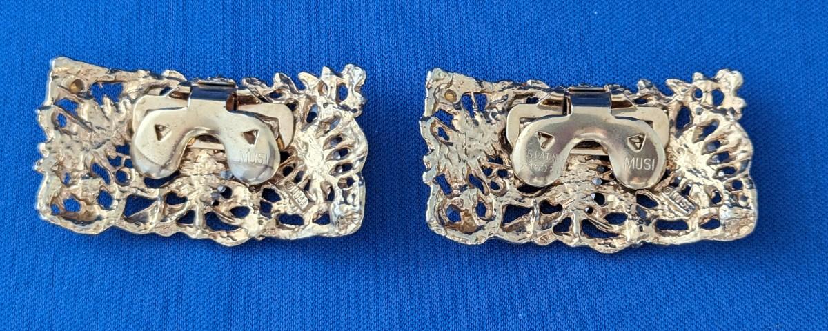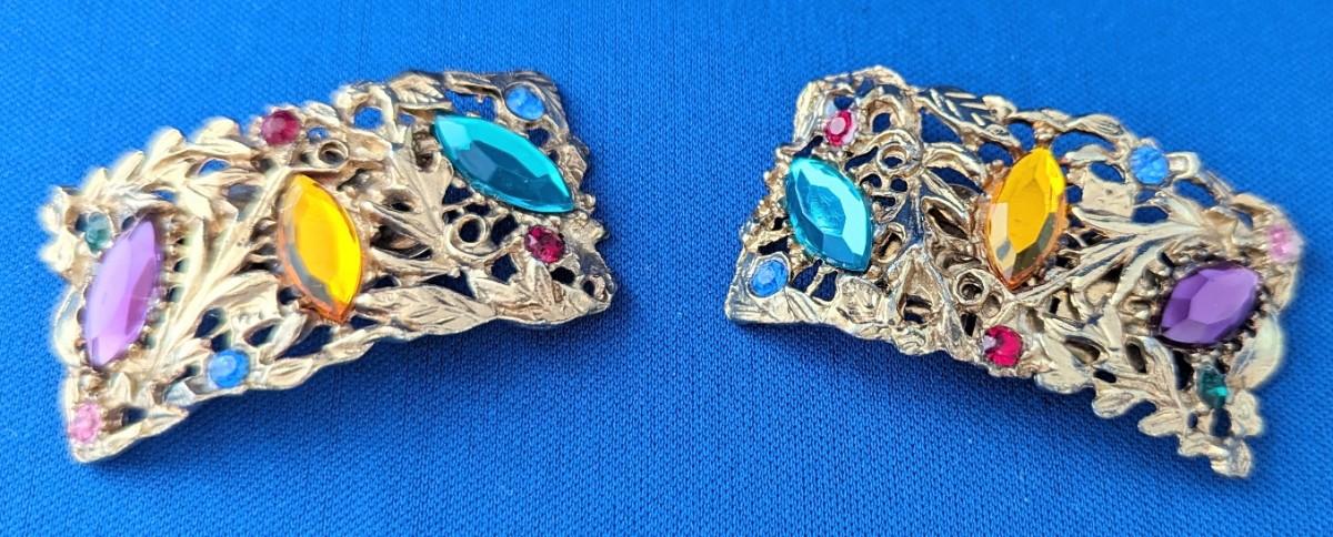 Pair (2) Vintage 1940-1960's Musi brand shoe clips. Gold tone with colored rhinestones.