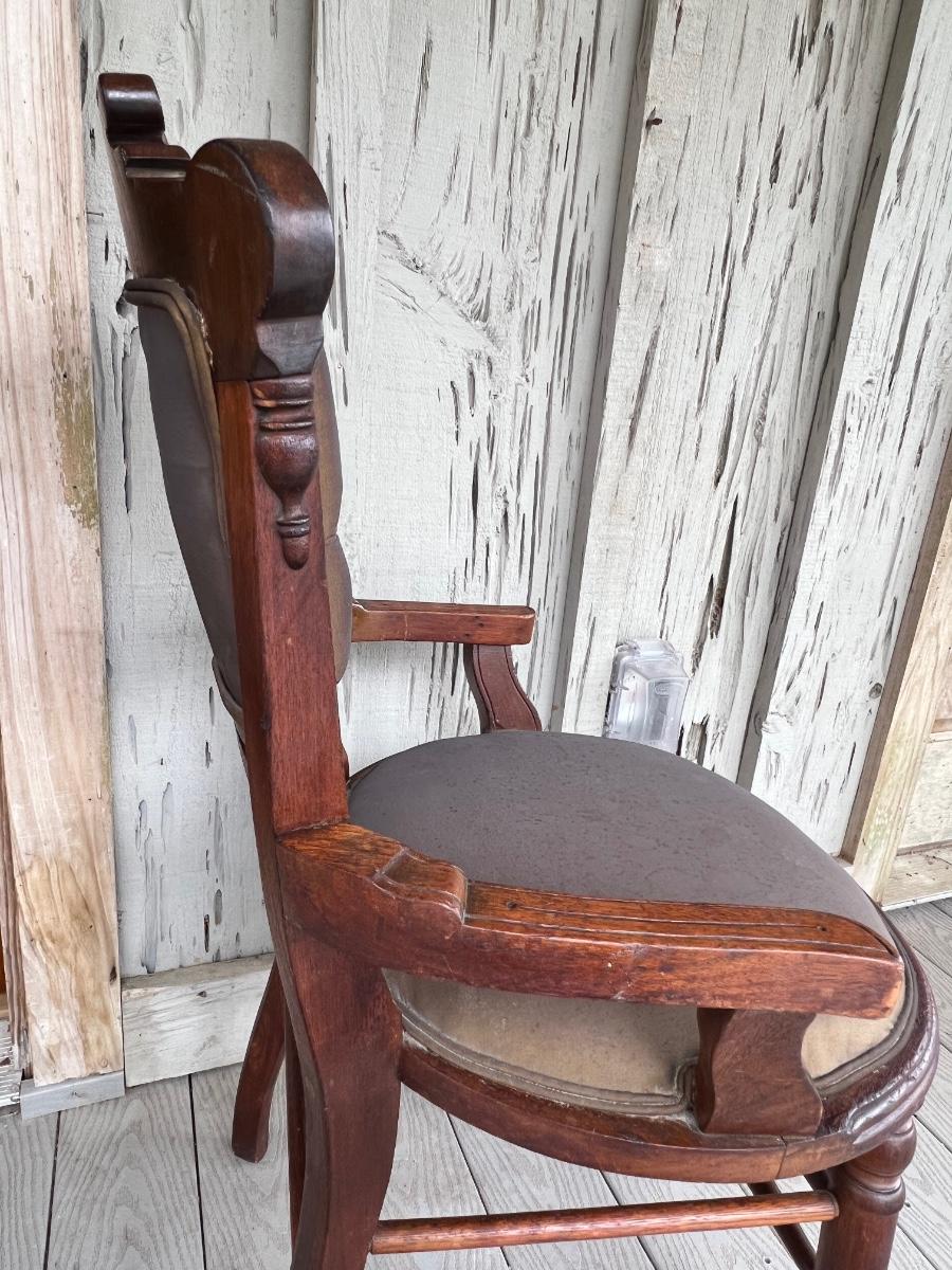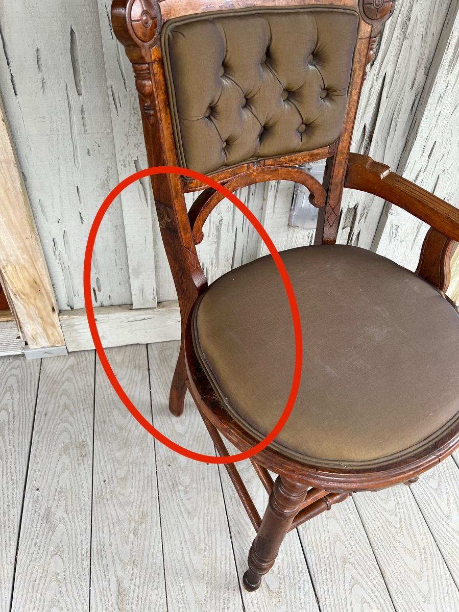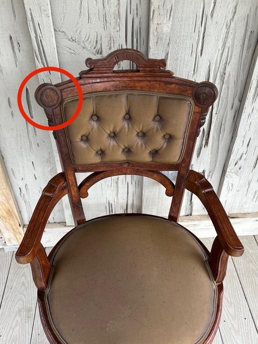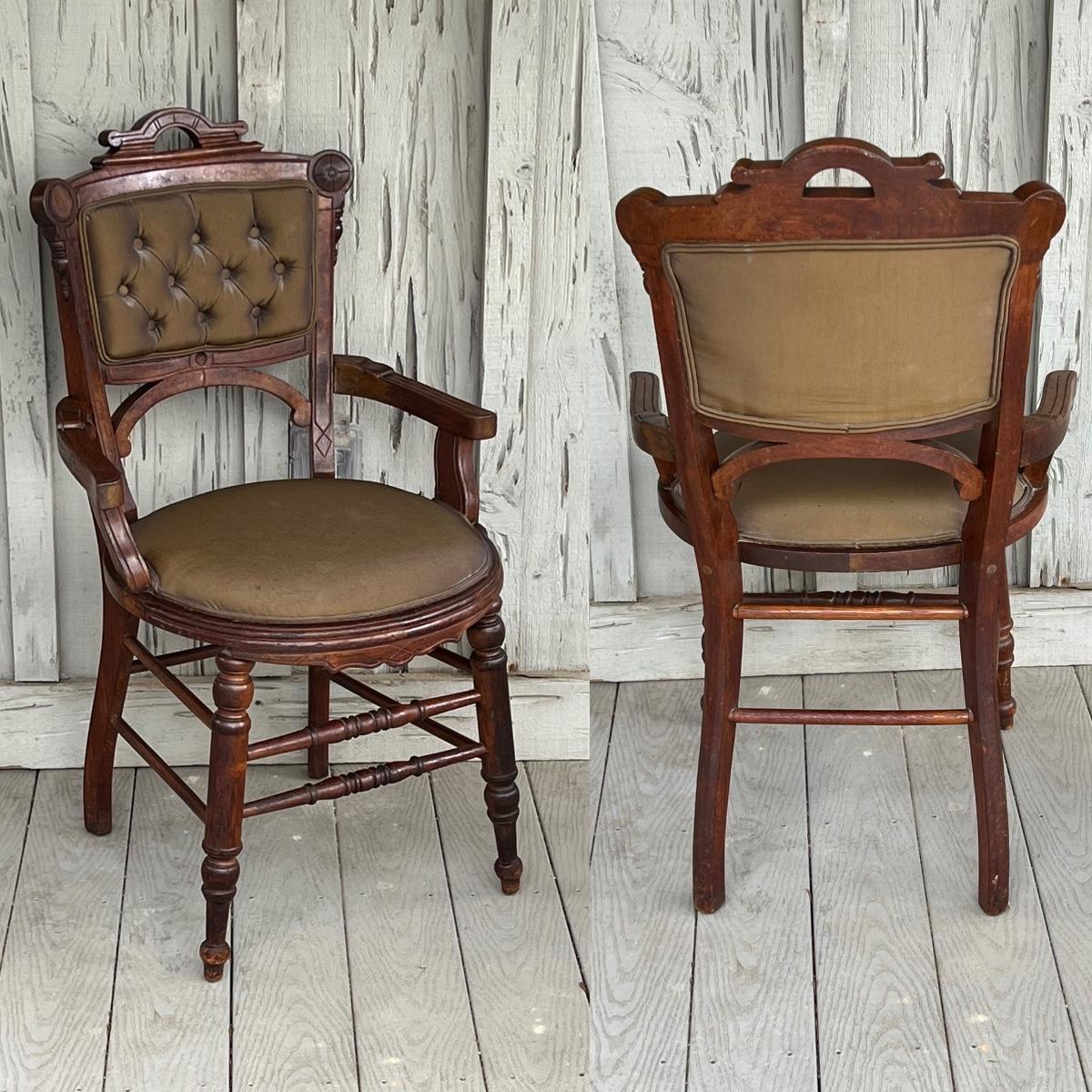 Really cool vintage chairs need some love & restoring. One chair is missing an arm. One chair is missing a small round detailed piece at the top left corner of the chair. See photos. The chair is 18” from floor to seat. No Brand Found. 36” H x 21” W x 21.5” D.
