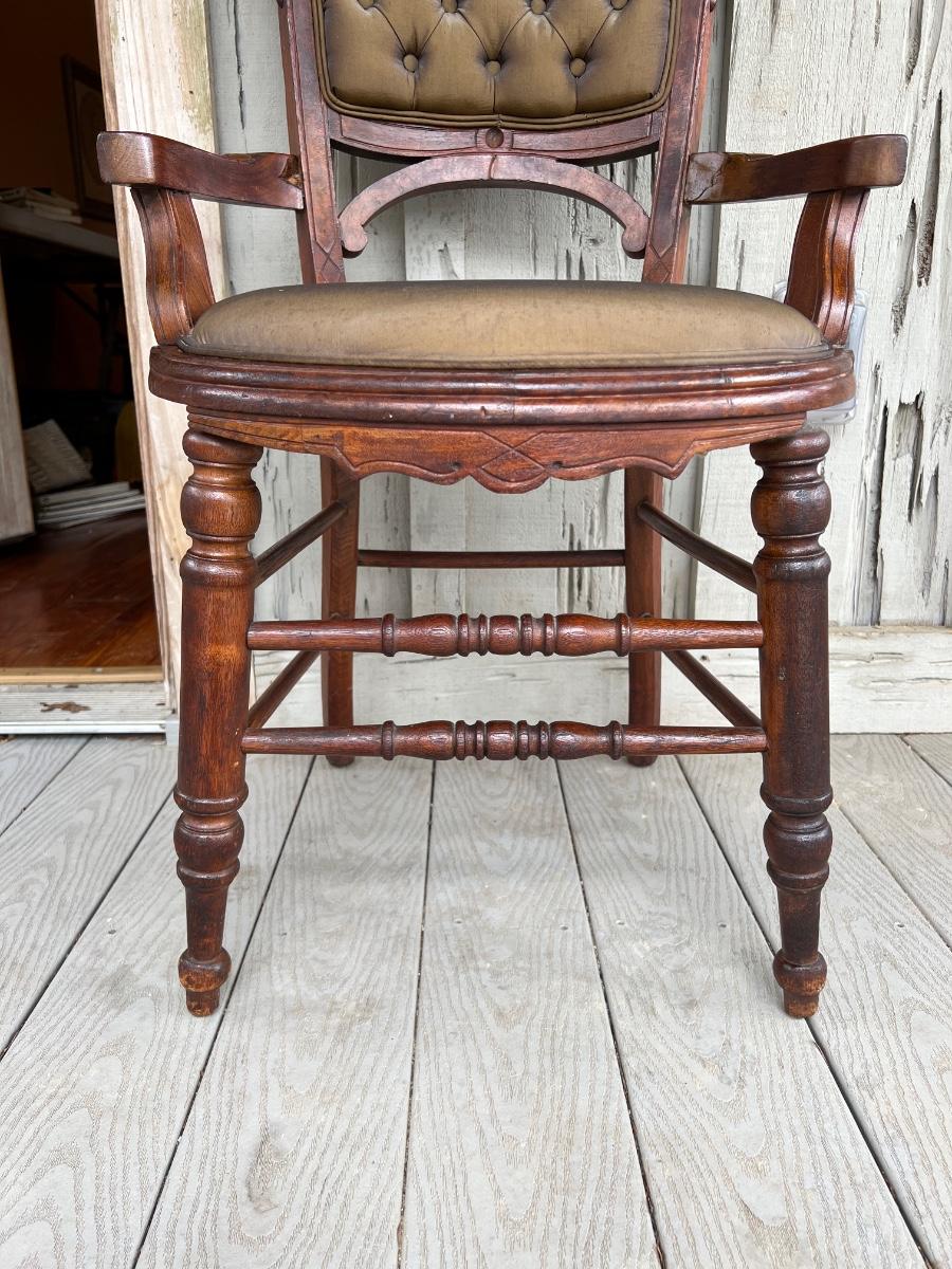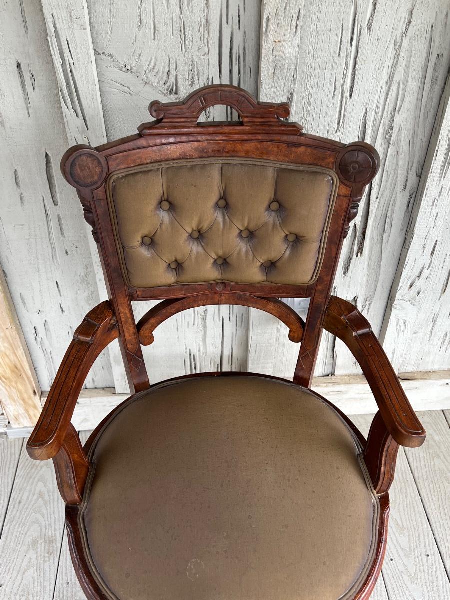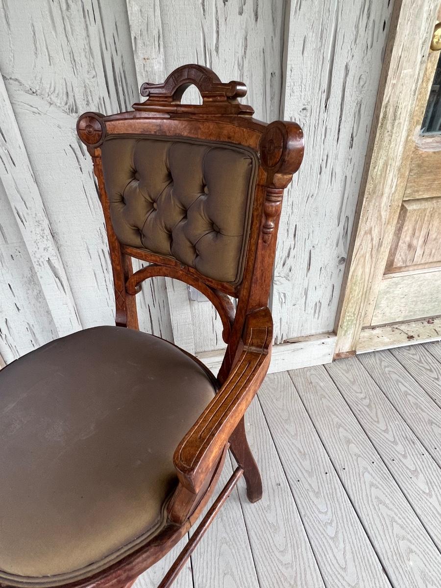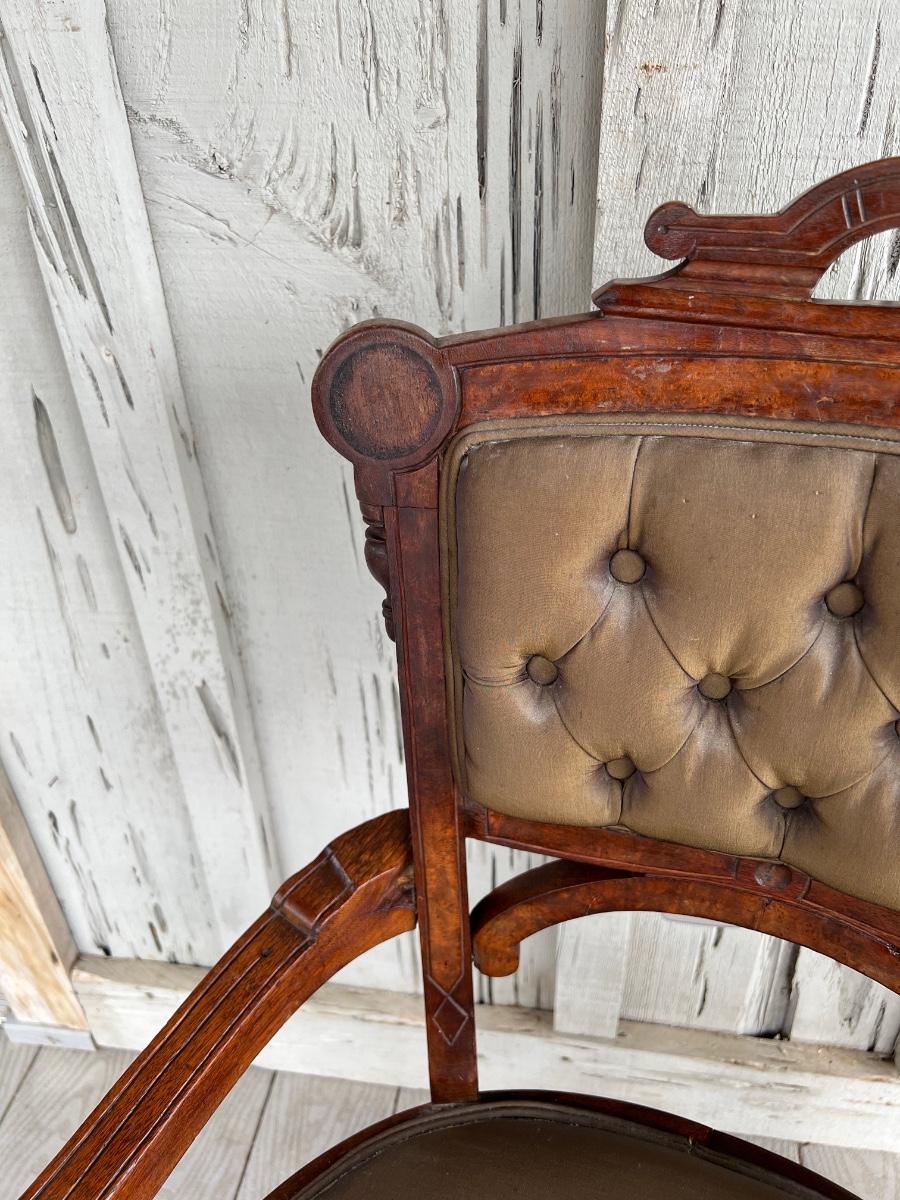 Really cool vintage chairs need some love & restoring. One chair is missing an arm. One chair is missing a small round detailed piece at the top left corner of the chair. See photos. The chair is 18” from floor to seat. No Brand Found. 36” H x 21” W x 21.5” D.