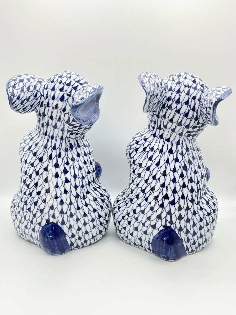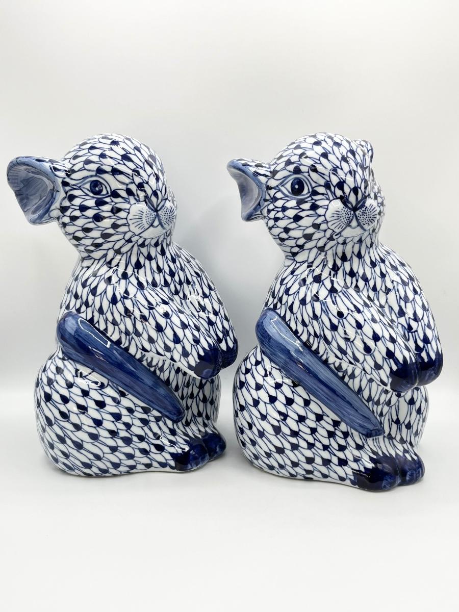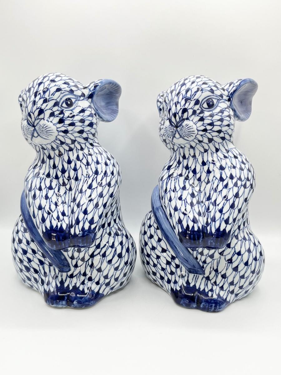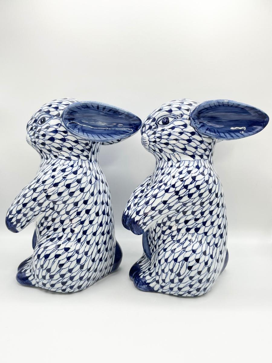 Pair (2) ~ Vtg. 12” Porcelain Herrand Style Blue & White Rabbits