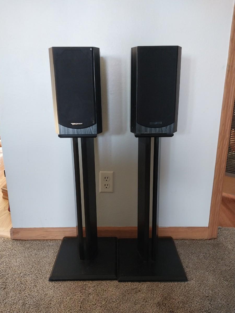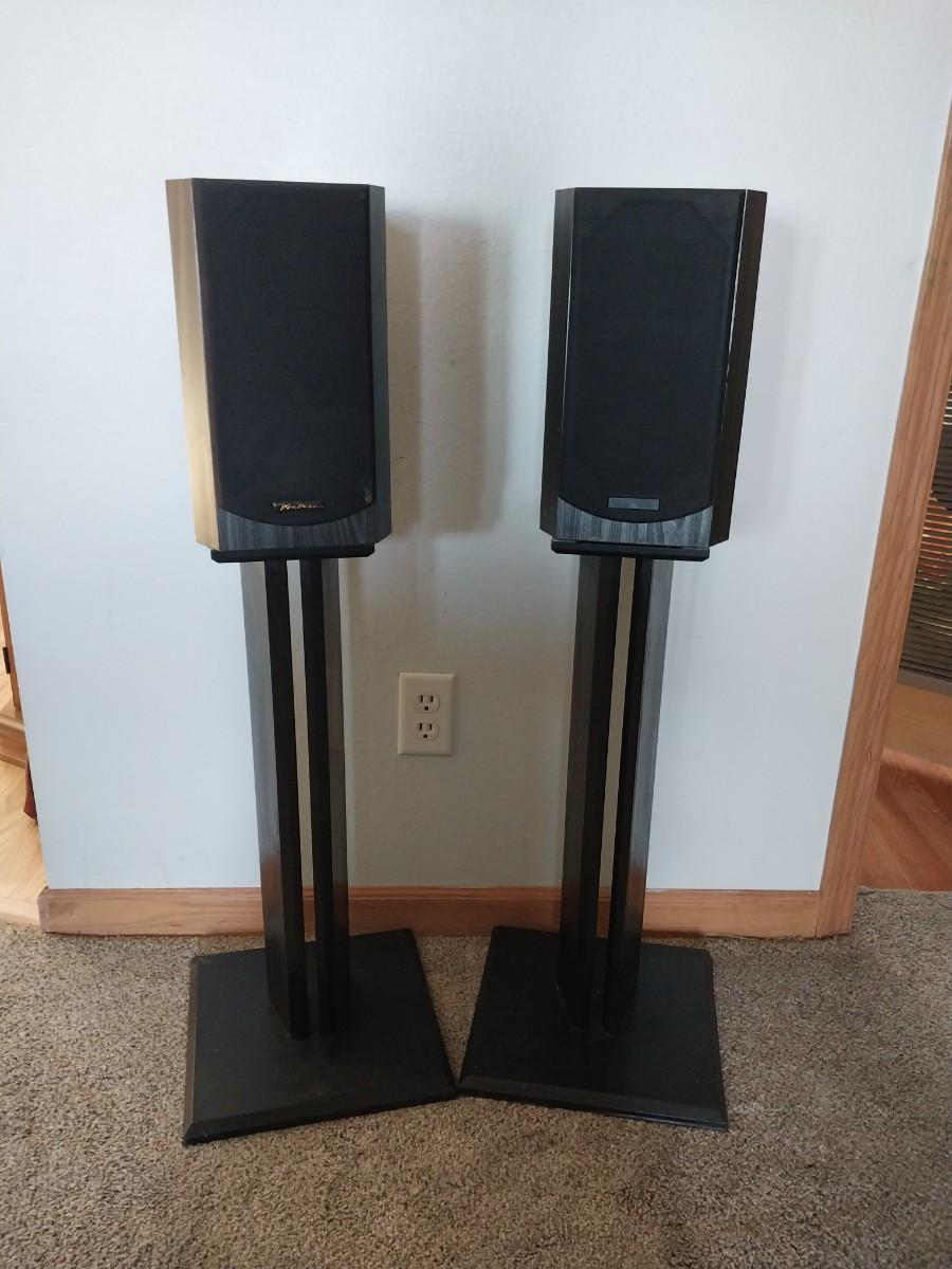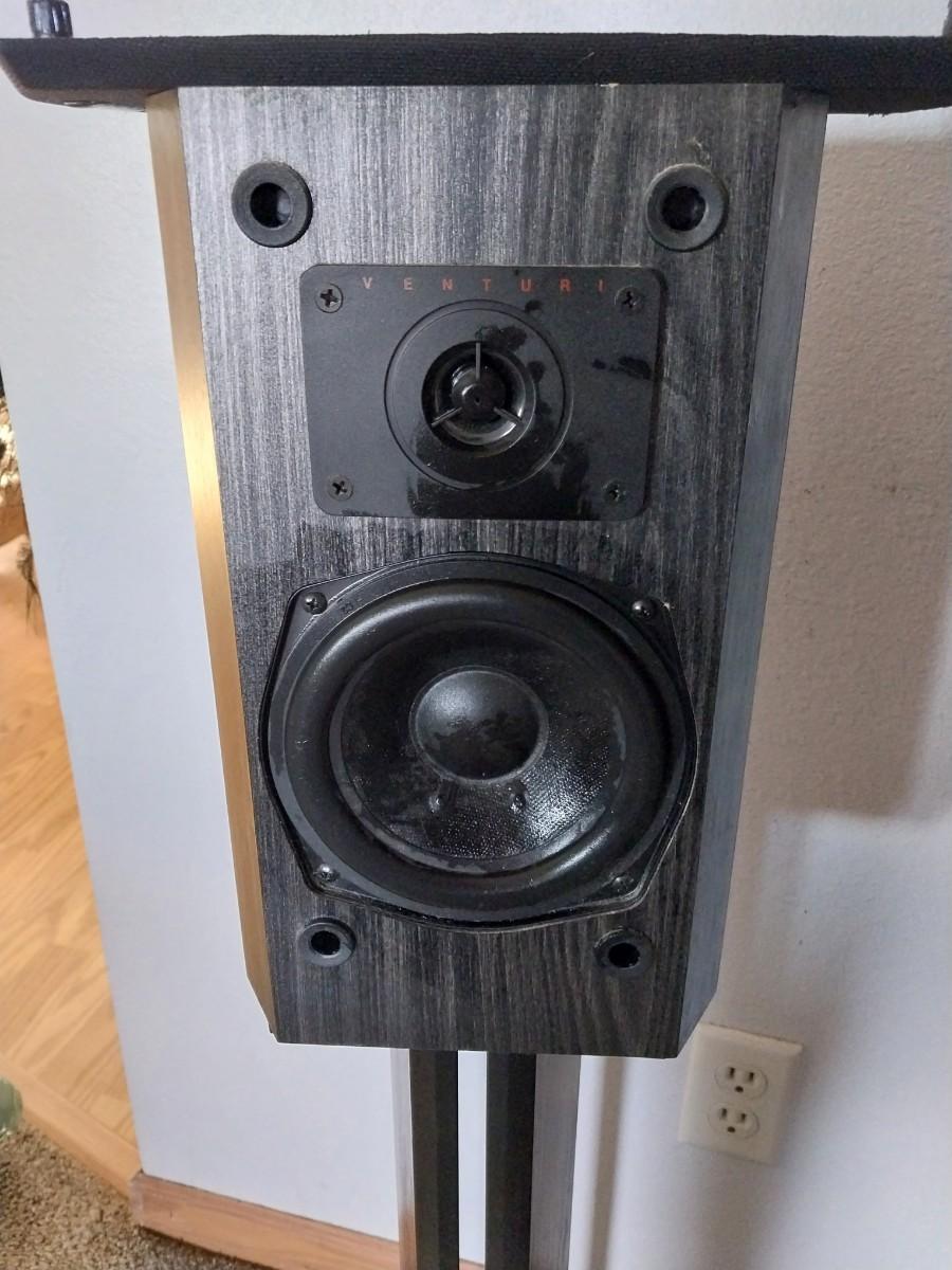PAIR VENTURI SPEAKERS ON FREE STANDING STANDS