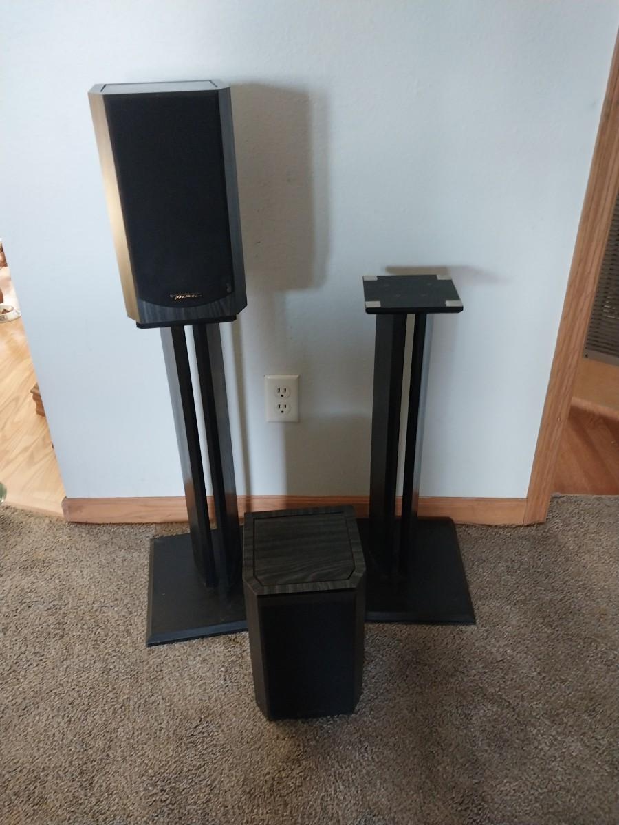 SPEAKERS ARE REMOVABLE FROM STAND (TESTED /WORKING) STANDS APPROX. 24" X12" WITH SPEAKER 36" H MODEL DV52