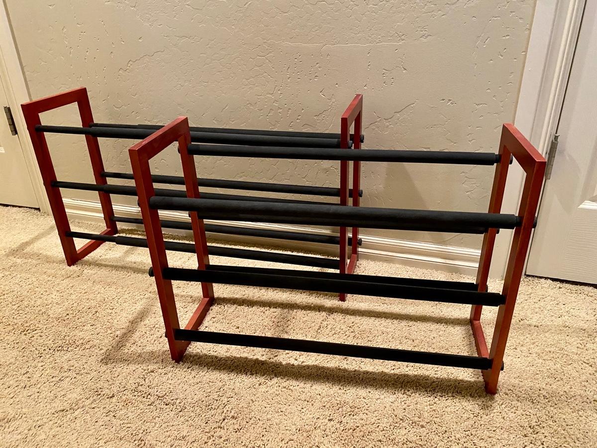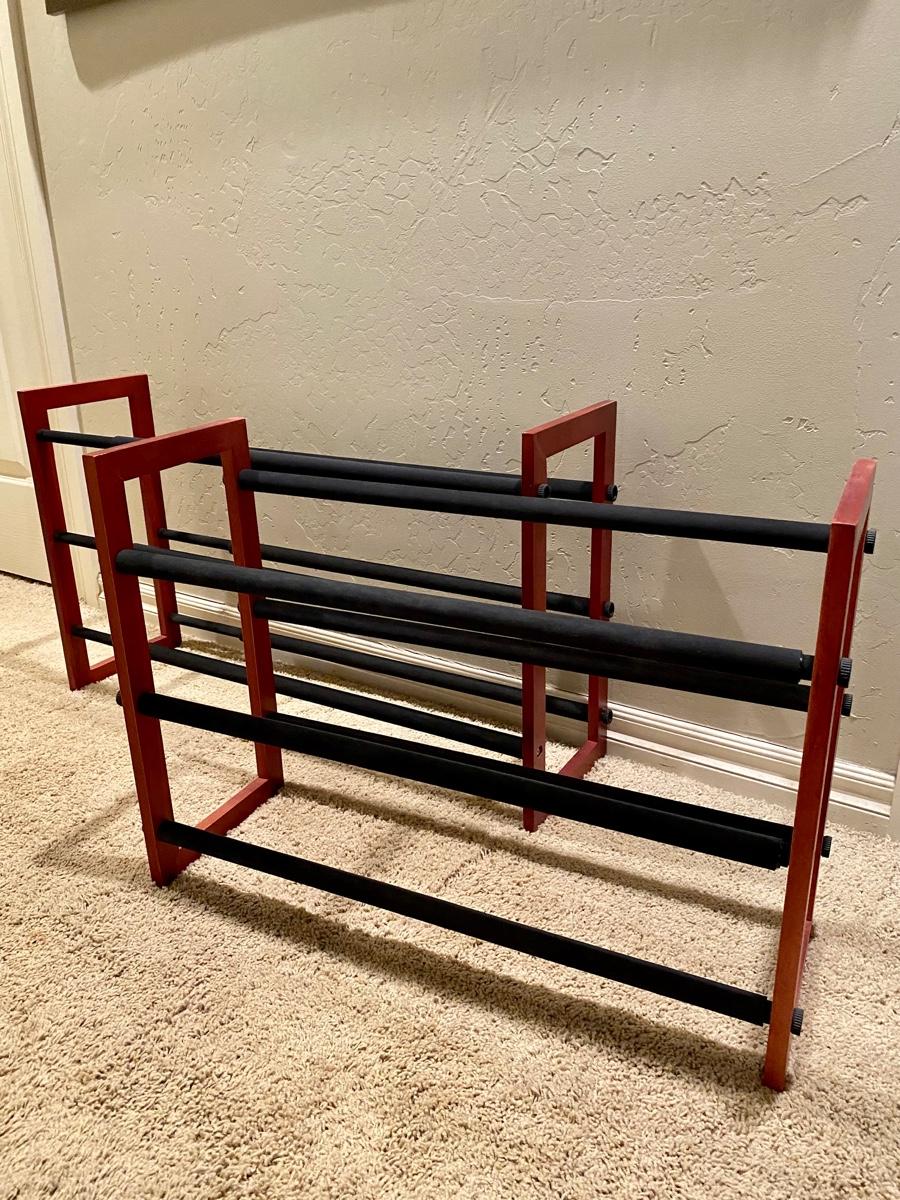 Foam adjustable bars for resting shoes with wood sides for stability, 18" H x 8.5" D x 25" L (at smallest length)
