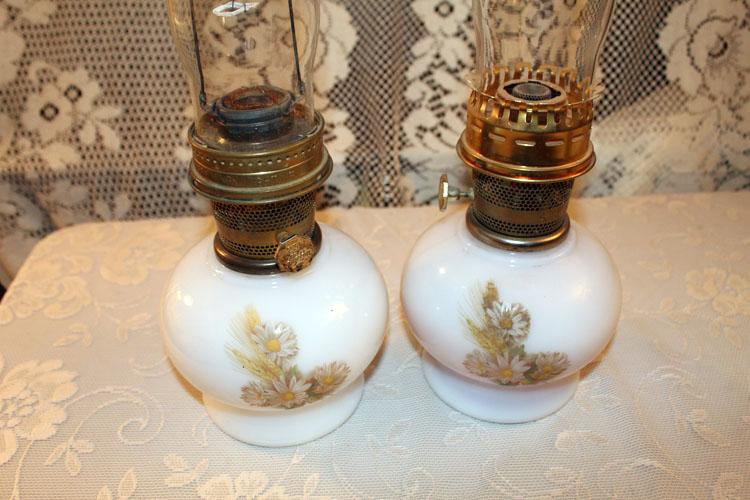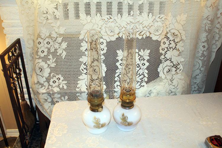 Pair Aladdin oil lamps, painted milk glass bases, 9" with 12" chimneys (#45)