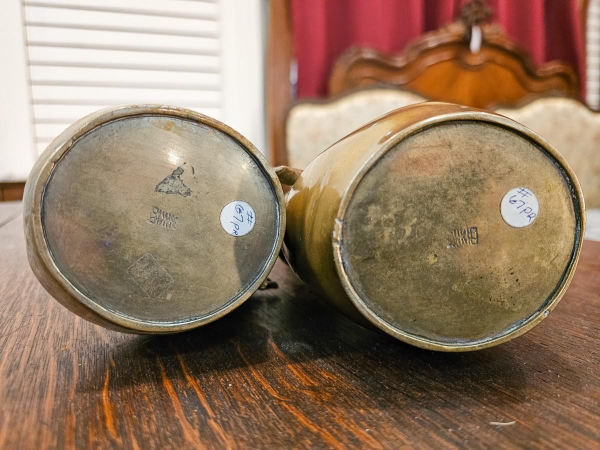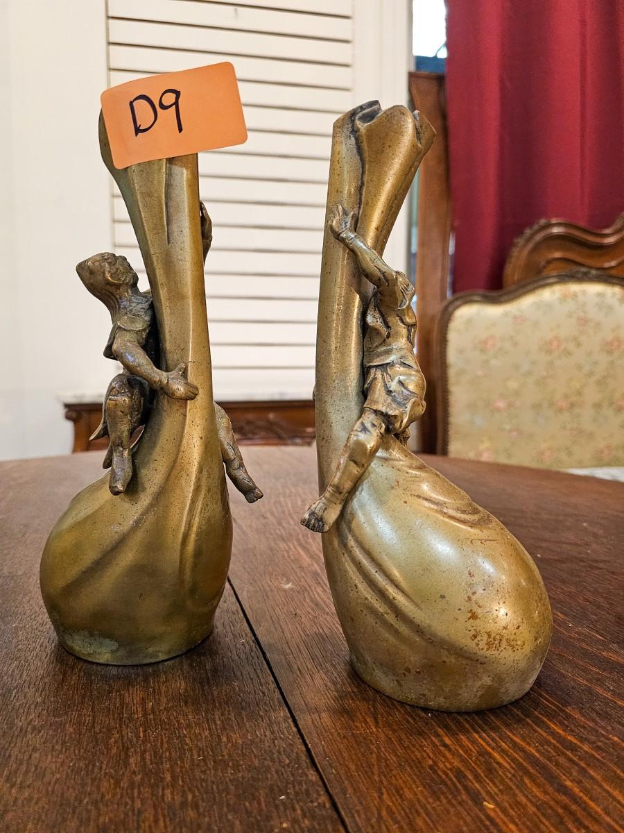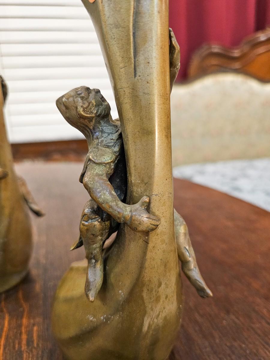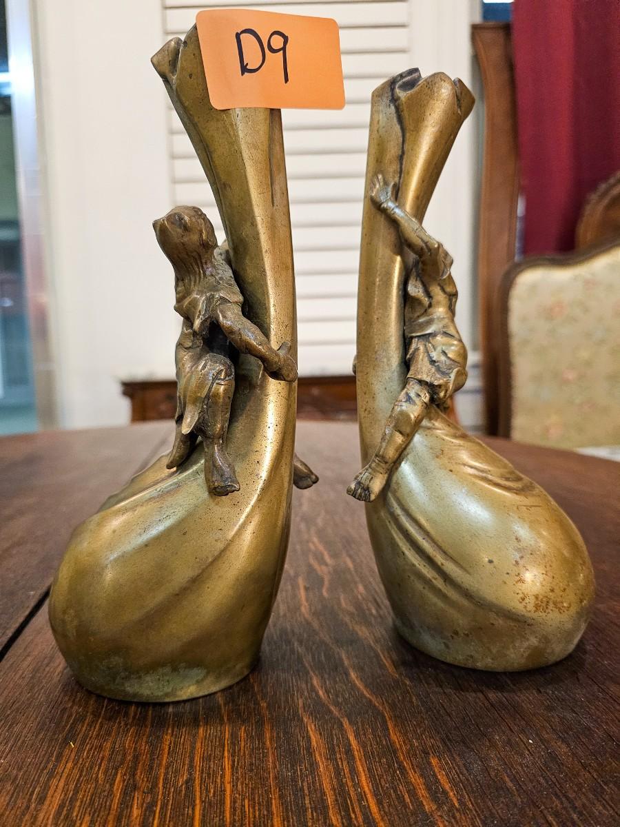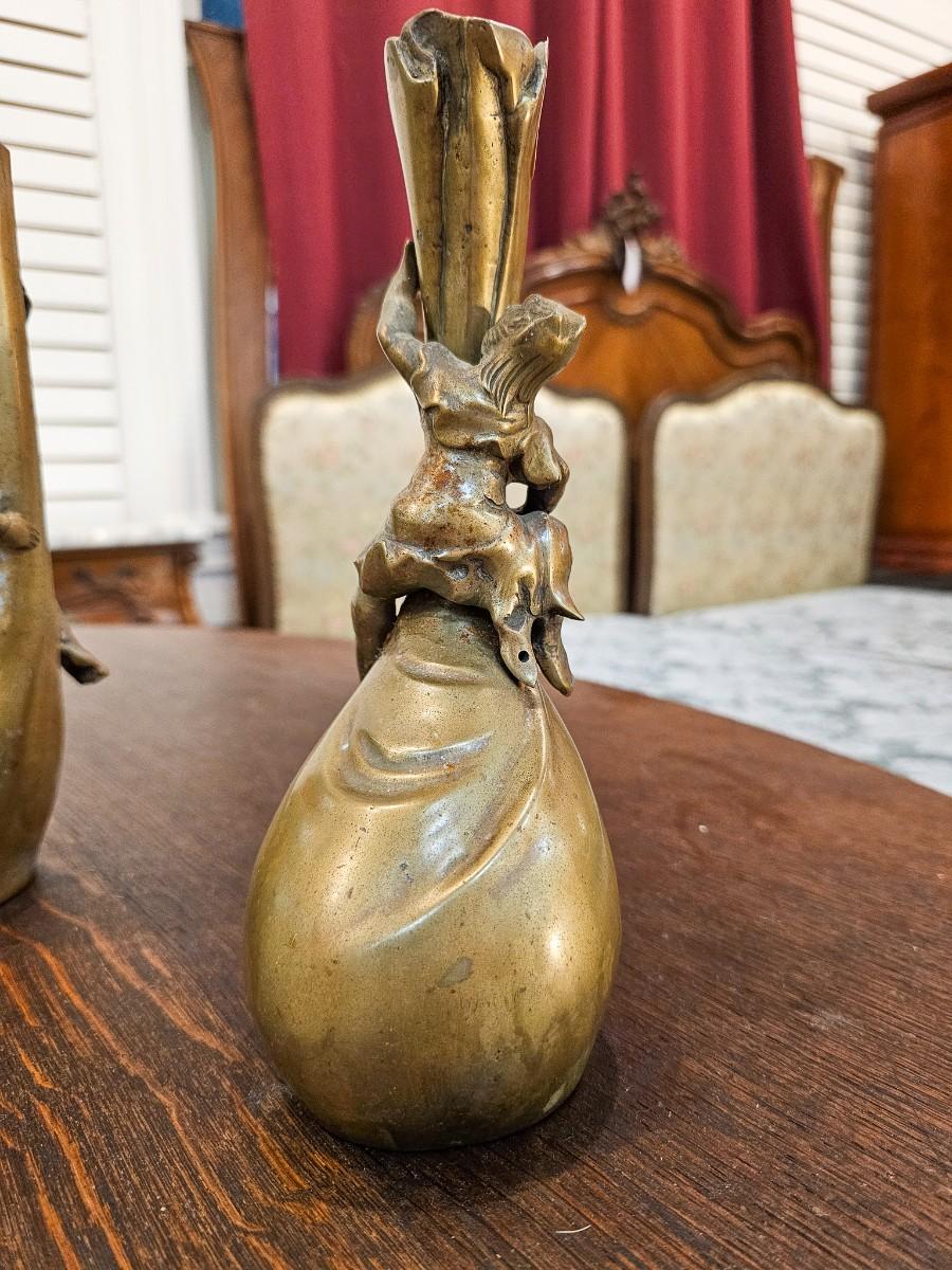 Pair of antique Meiji period brass vases, with figures, Japenese. C. 1900