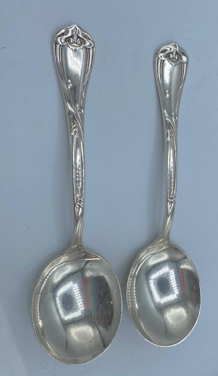 Gorgeous heavy c. 1904 Reed & Barton Art Nouveau 7” spoons with huge round bowls . Wonderful patina and decoration. Not marked sterling so I assume plated
