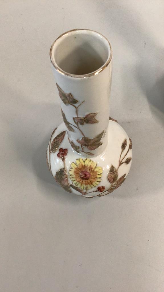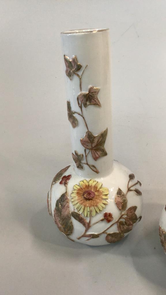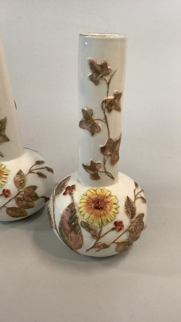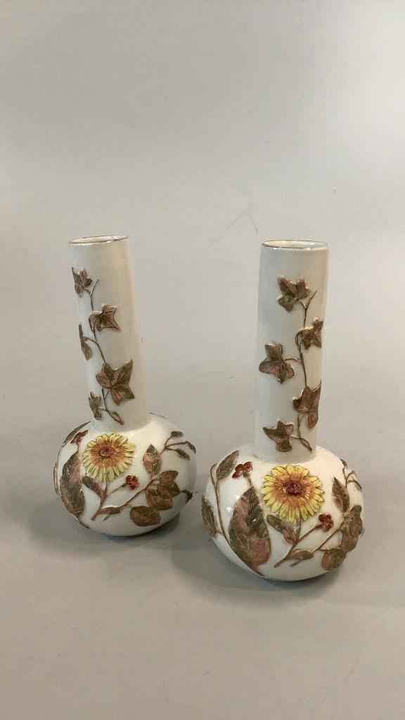 Bottle form 9 inch vases with relief designs of flowers and vines, hand painted in yellow, pinks and green on a glazed bisque body, gilt rim, glazed foot rings..no marks..Minton?