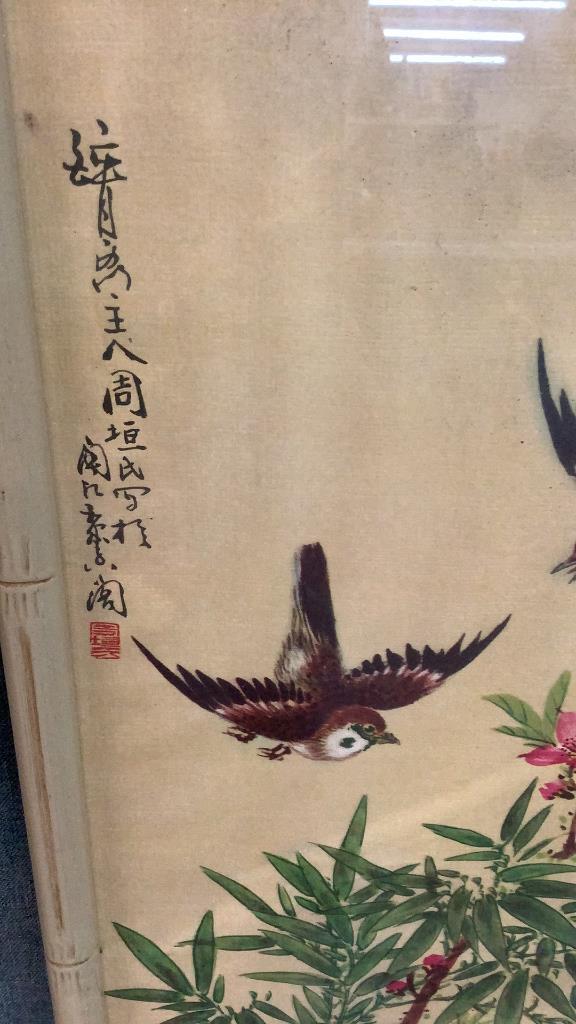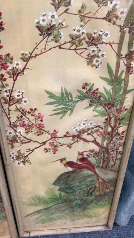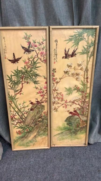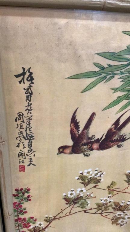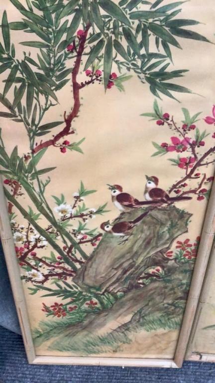Birds, Bamboo and flowering branches Â…On a yellow groundÂ…38 x 12 inches each, with a notation at upper left