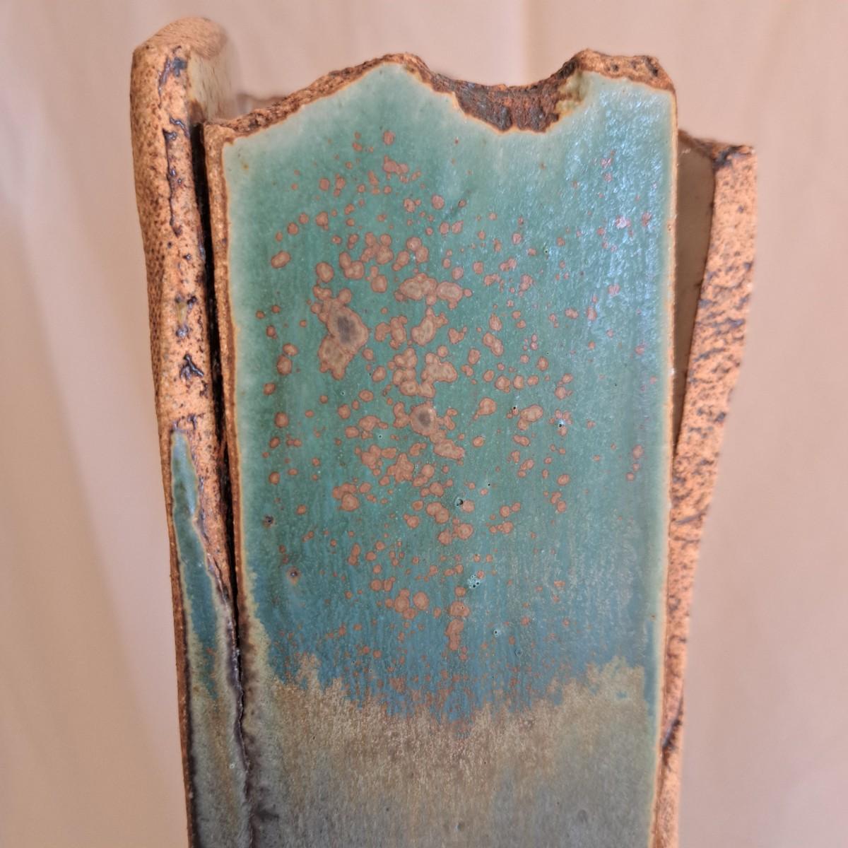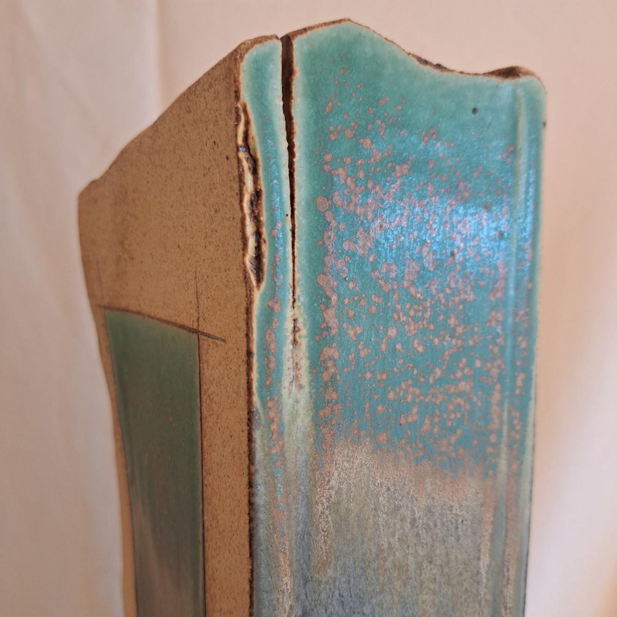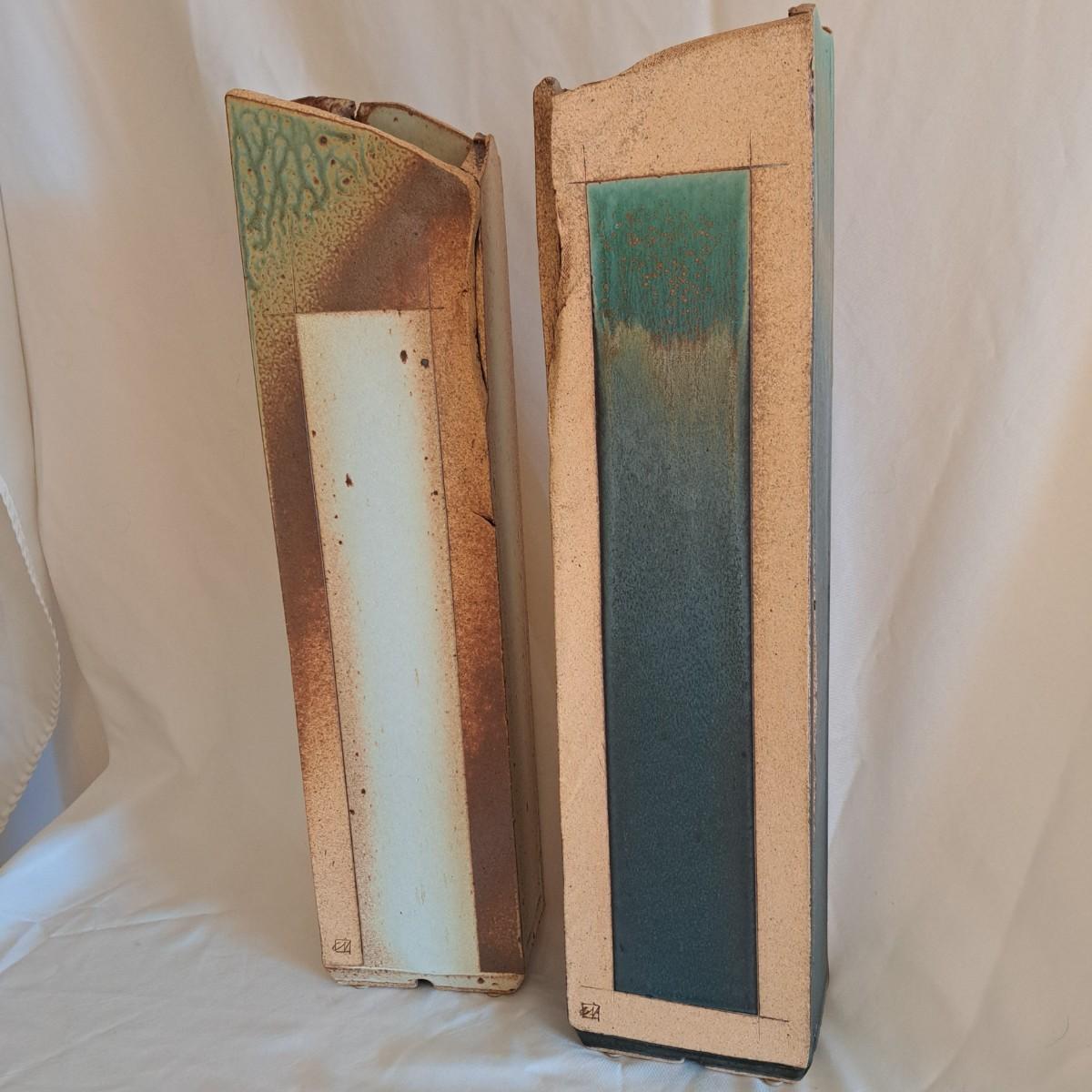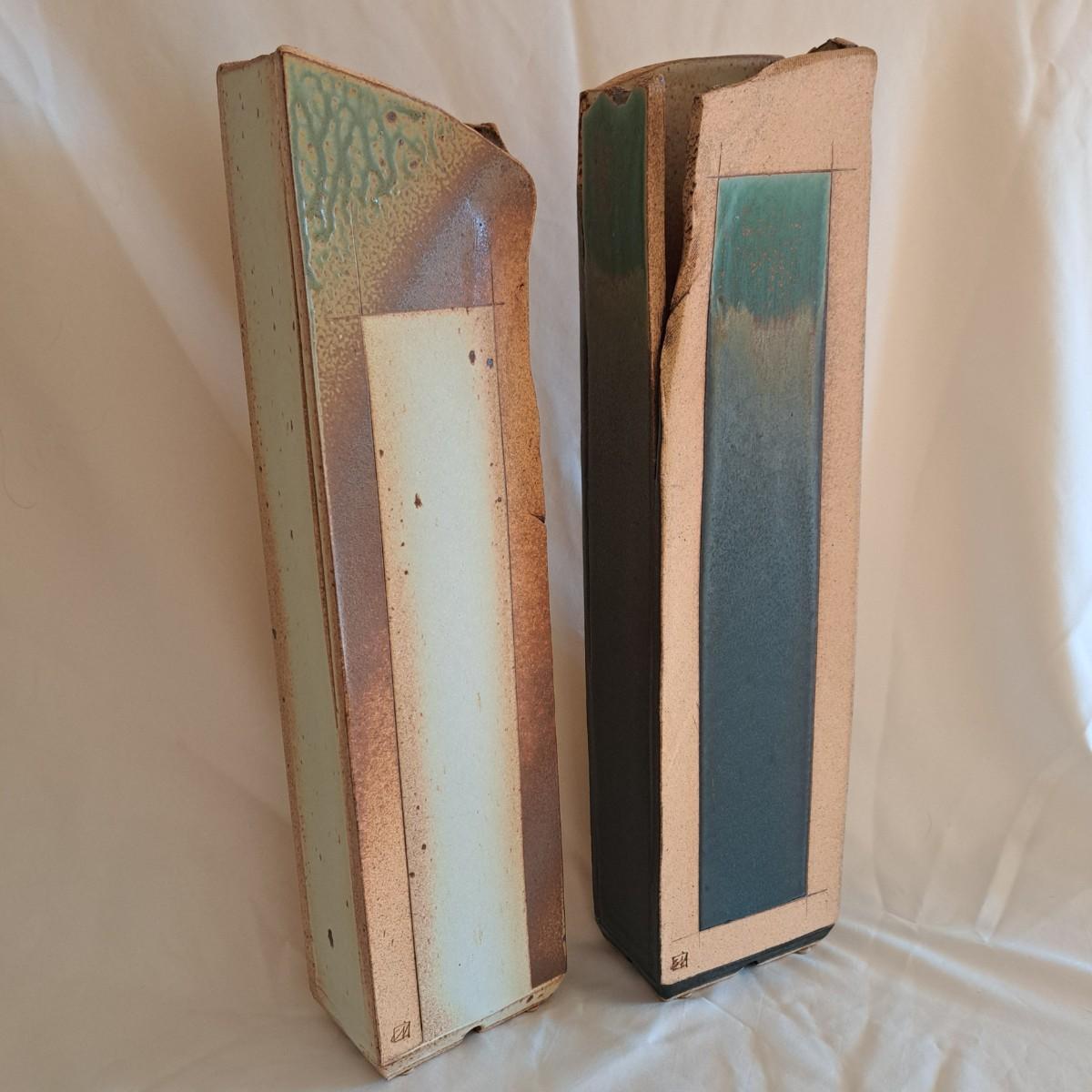 Two tall, handmade sculptural vases, 5" x 3.5" x 21"H, constructed of stoneware slabs in rich earth tones with a green Celedon textured matte glaze. Cuts to edges are purposely a part of design. Both bear a rectangular Asian character at bottom left corner as shown. Shipping available. Shipping can be costly. We suggest contacting our preferred local shipping provider, Postage Express, with dimensions and getting an estimate before bidding: (828) 255-9250 or shipping@postageexpressnc.com.