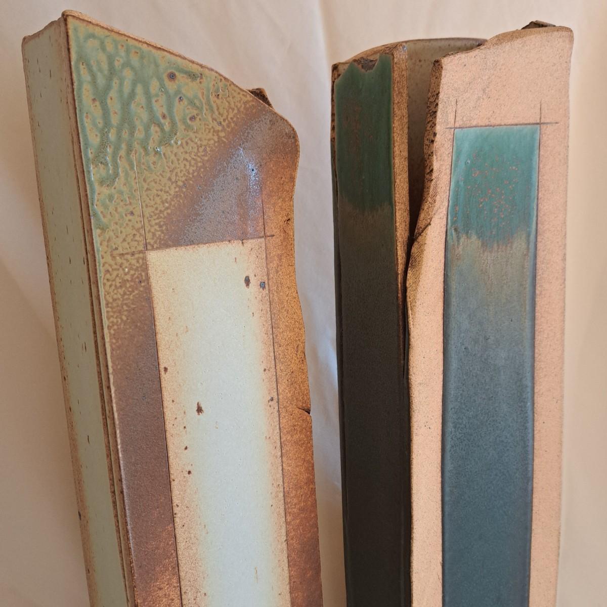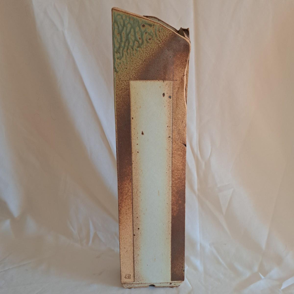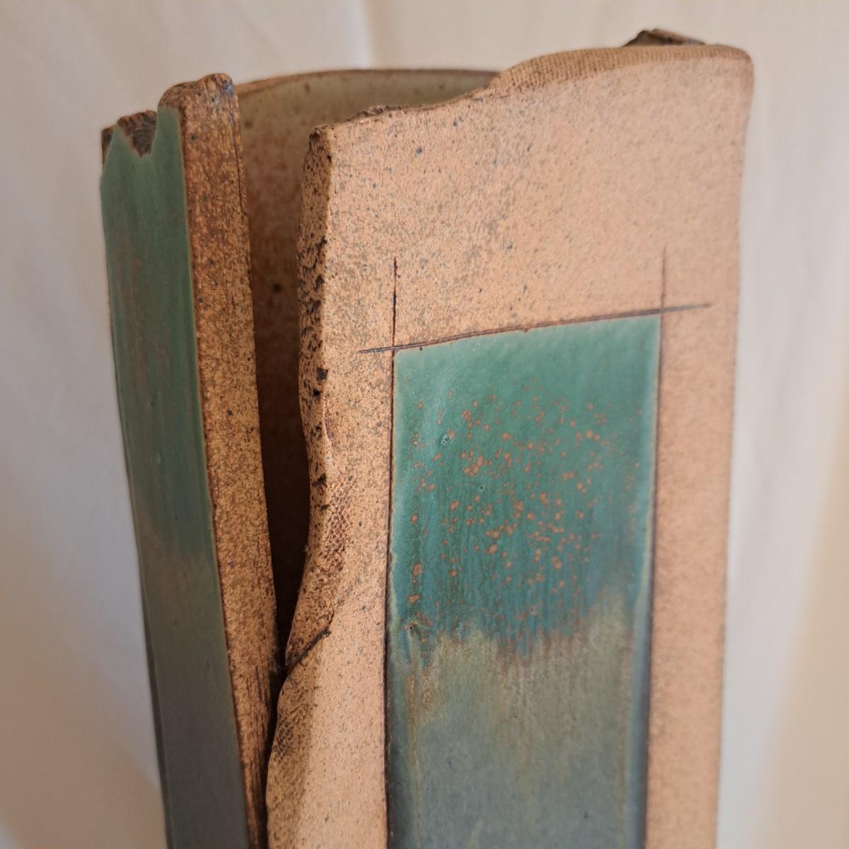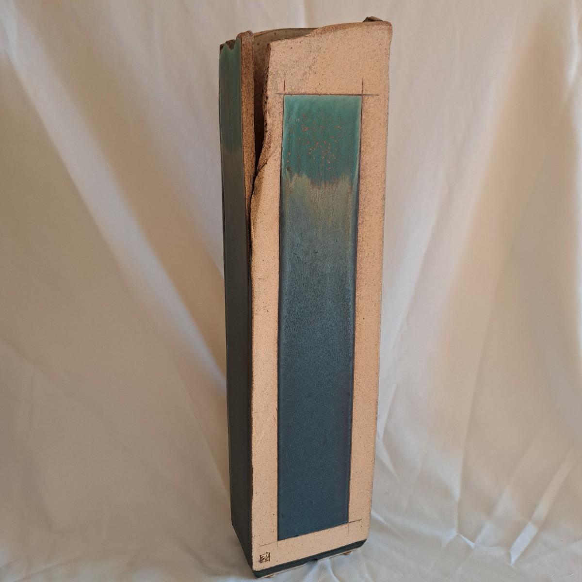 Two tall, handmade sculptural vases, 5" x 3.5" x 21"H, constructed of stoneware slabs in rich earth tones with a green Celedon textured matte glaze. Cuts to edges are purposely a part of design. Both bear a rectangular Asian character at bottom left corner as shown. Shipping available. Shipping can be costly. We suggest contacting our preferred local shipping provider, Postage Express, with dimensions and getting an estimate before bidding: (828) 255-9250 or shipping@postageexpressnc.com.