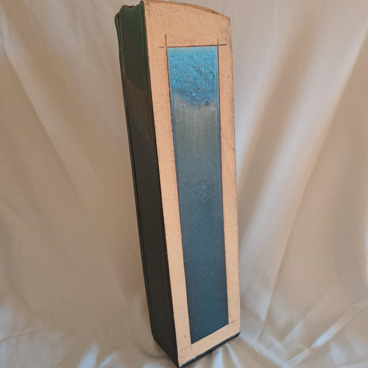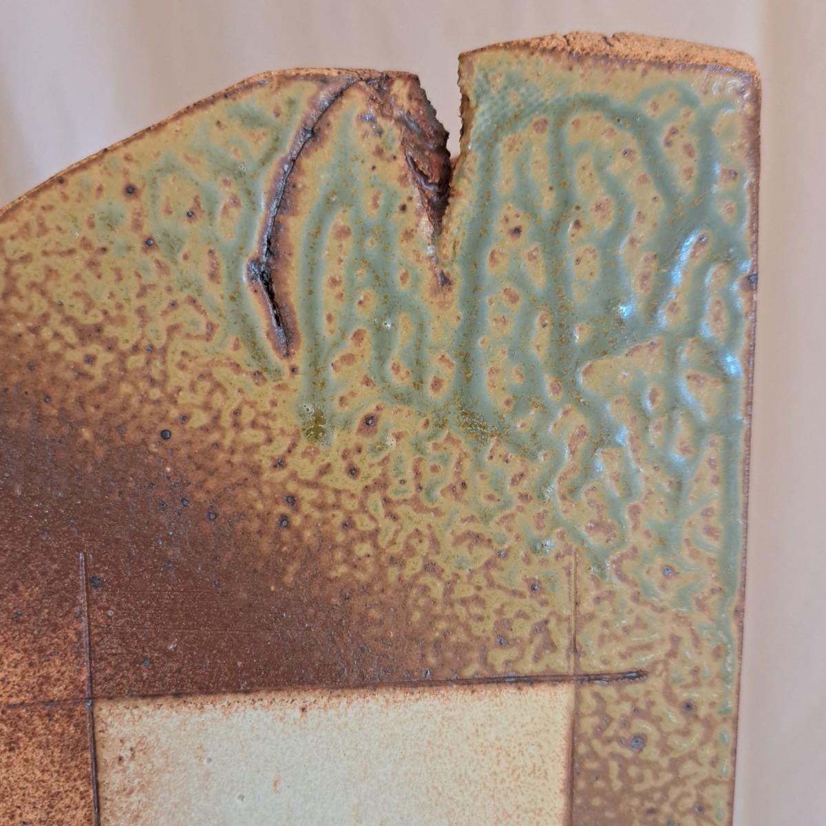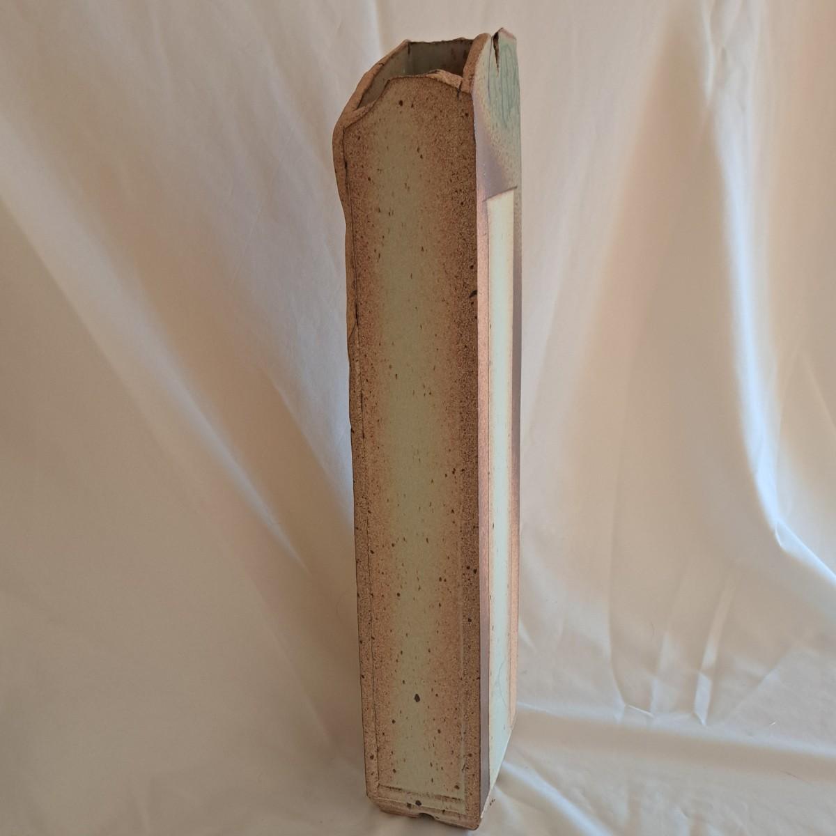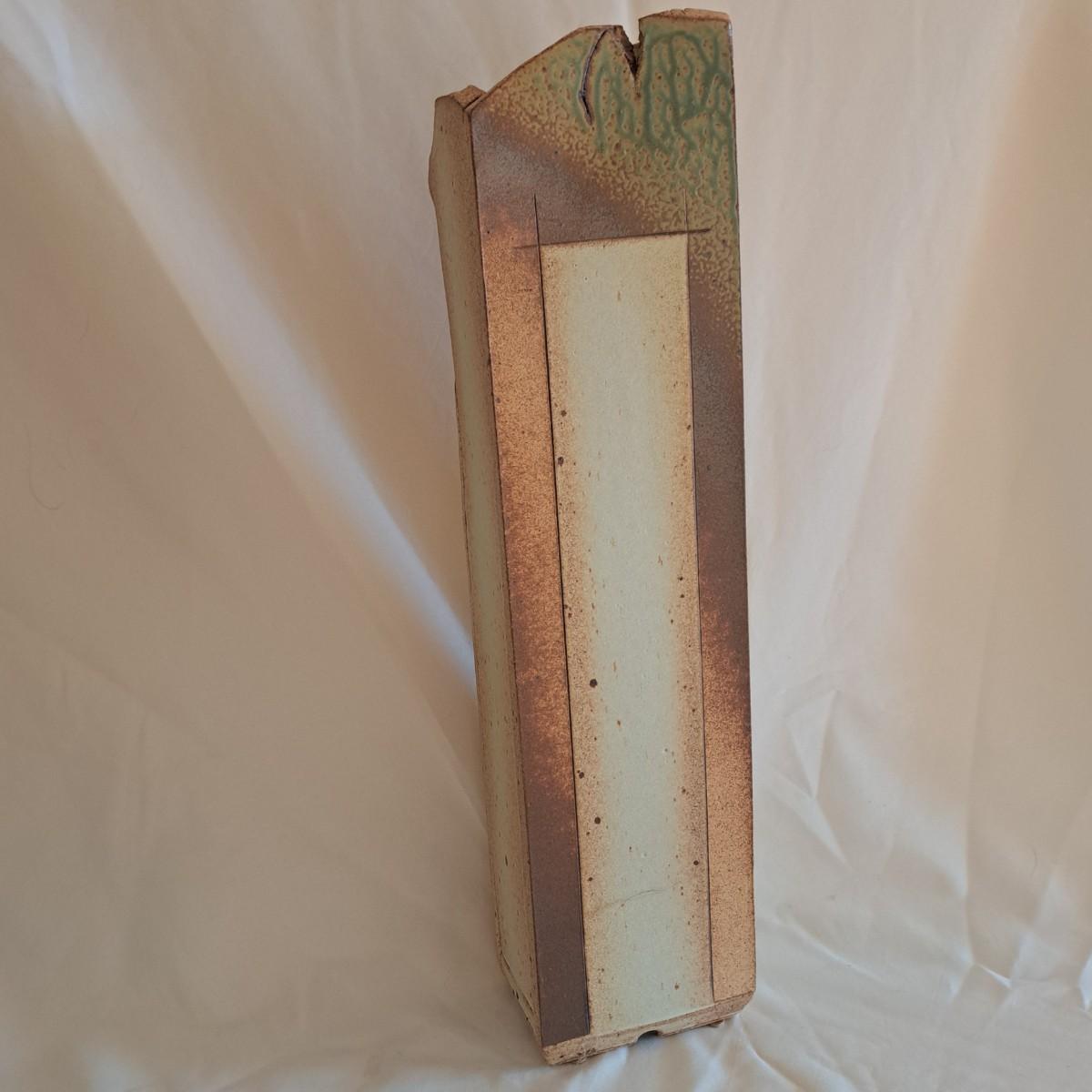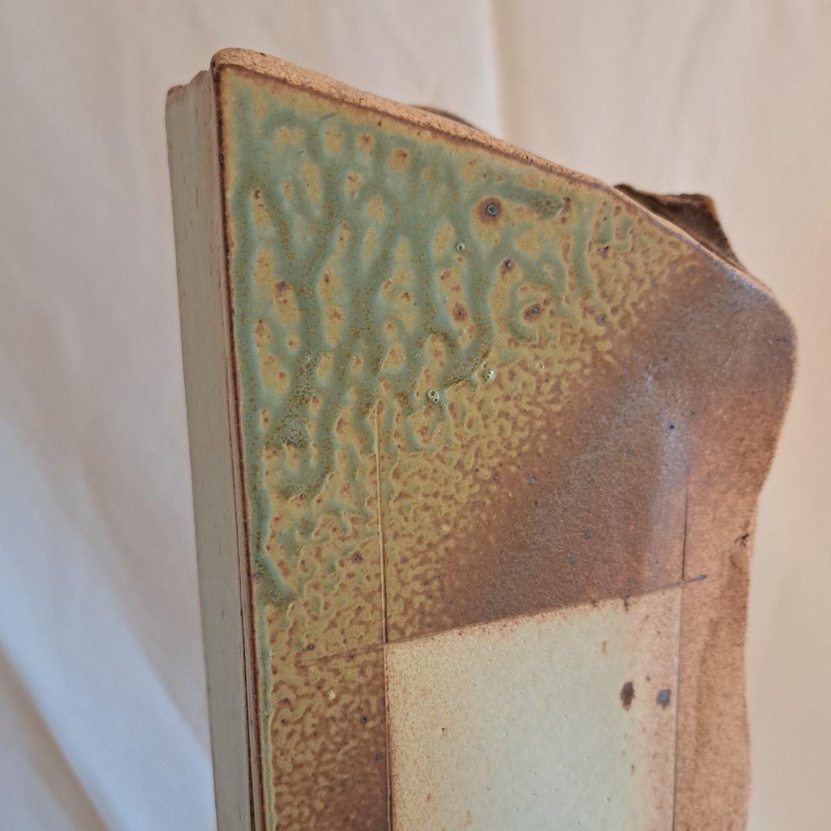 Two tall, handmade sculptural vases, 5" x 3.5" x 21"H, constructed of stoneware slabs in rich earth tones with a green Celedon textured matte glaze. Cuts to edges are purposely a part of design. Both bear a rectangular Asian character at bottom left corner as shown. Shipping available. Shipping can be costly. We suggest contacting our preferred local shipping provider, Postage Express, with dimensions and getting an estimate before bidding: (828) 255-9250 or shipping@postageexpressnc.com.