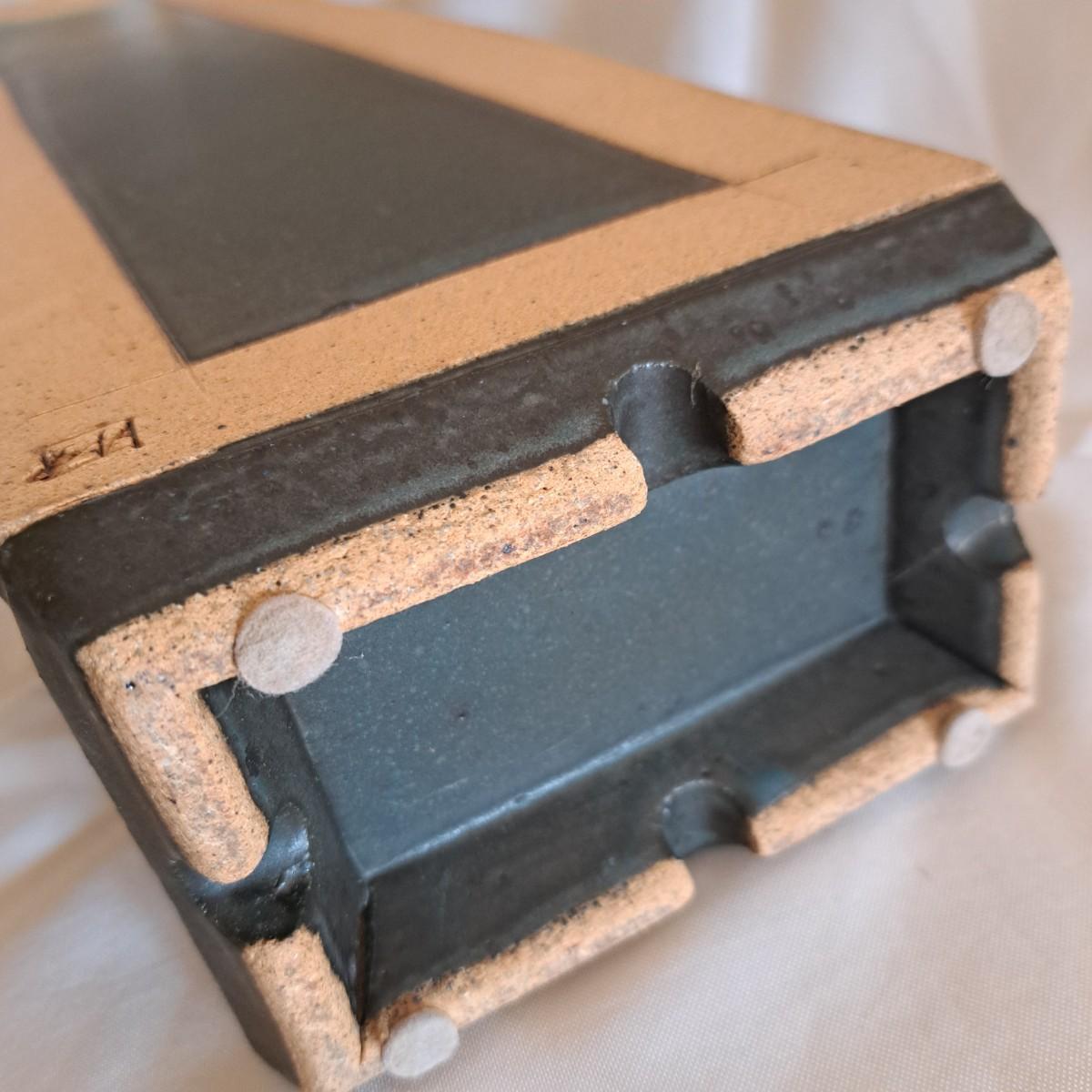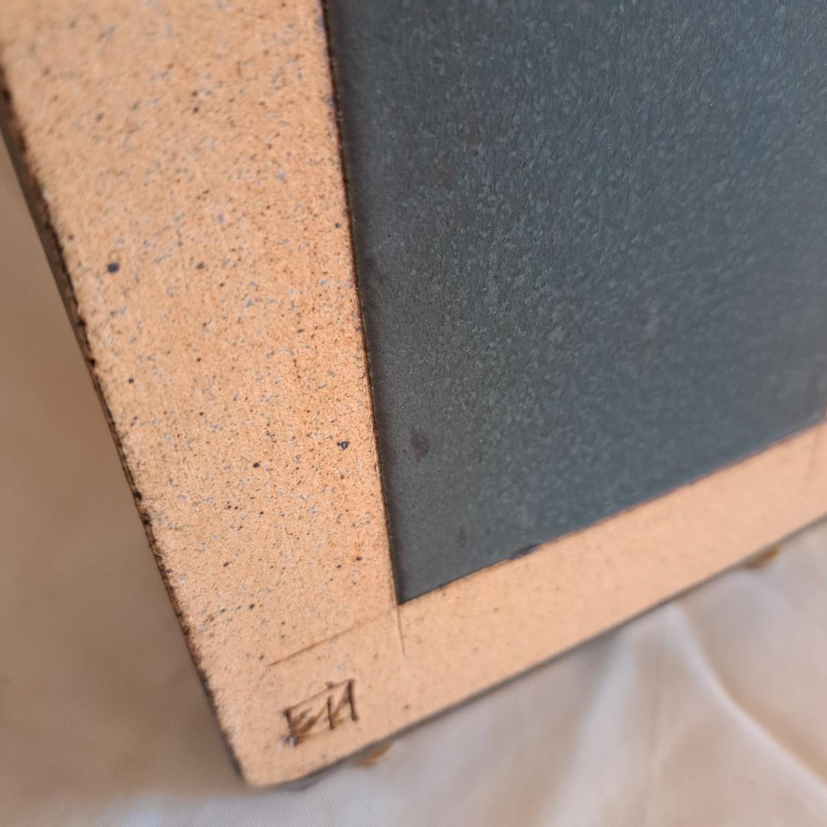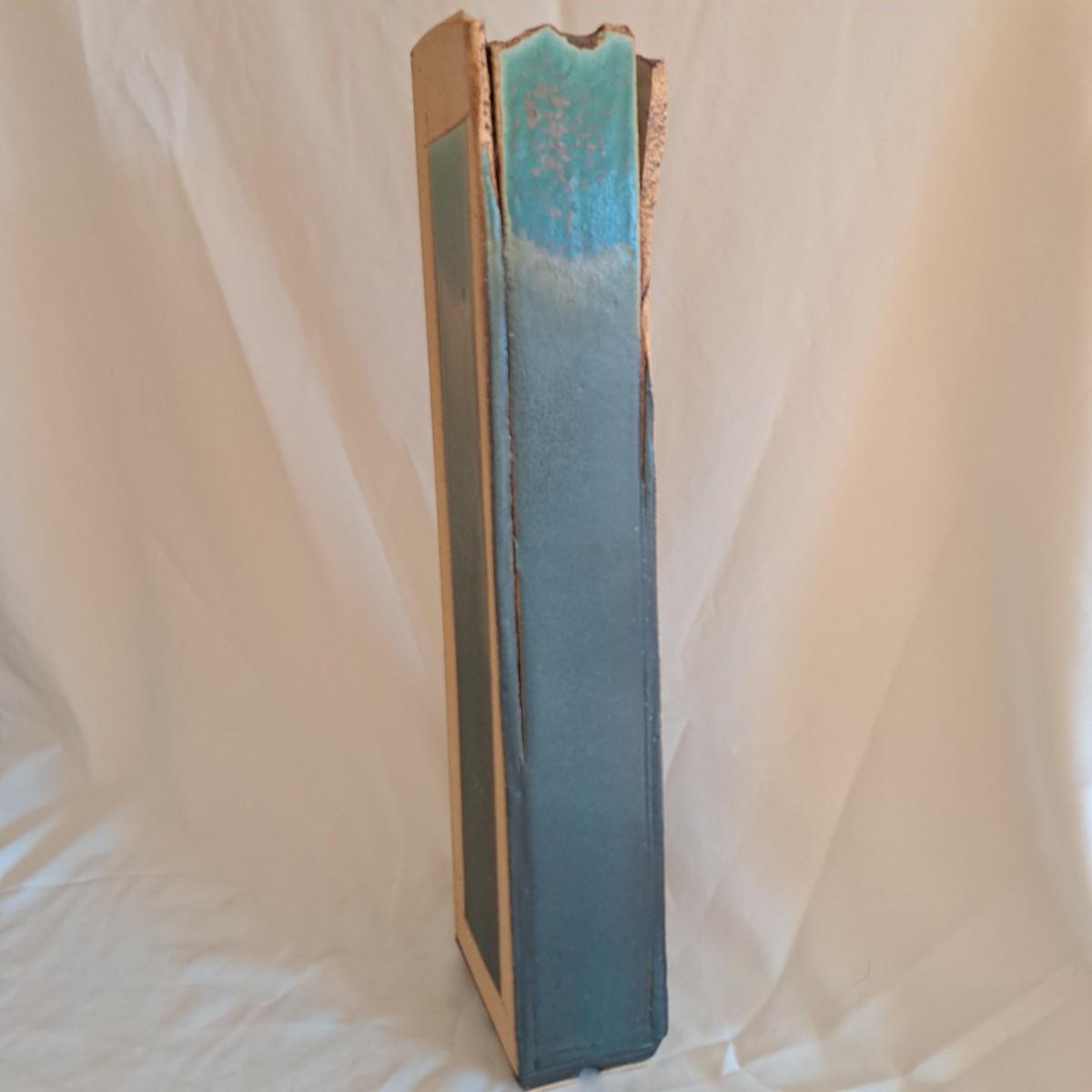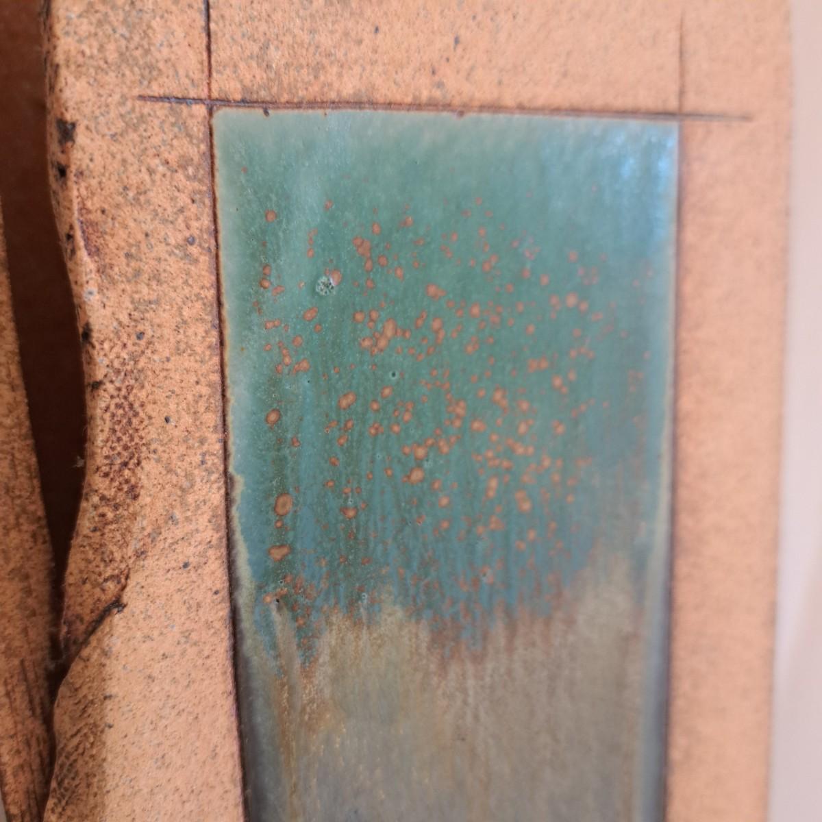 Two tall, handmade sculptural vases, 5" x 3.5" x 21"H, constructed of stoneware slabs in rich earth tones with a green Celedon textured matte glaze. Cuts to edges are purposely a part of design. Both bear a rectangular Asian character at bottom left corner as shown. Shipping available. Shipping can be costly. We suggest contacting our preferred local shipping provider, Postage Express, with dimensions and getting an estimate before bidding: (828) 255-9250 or shipping@postageexpressnc.com.