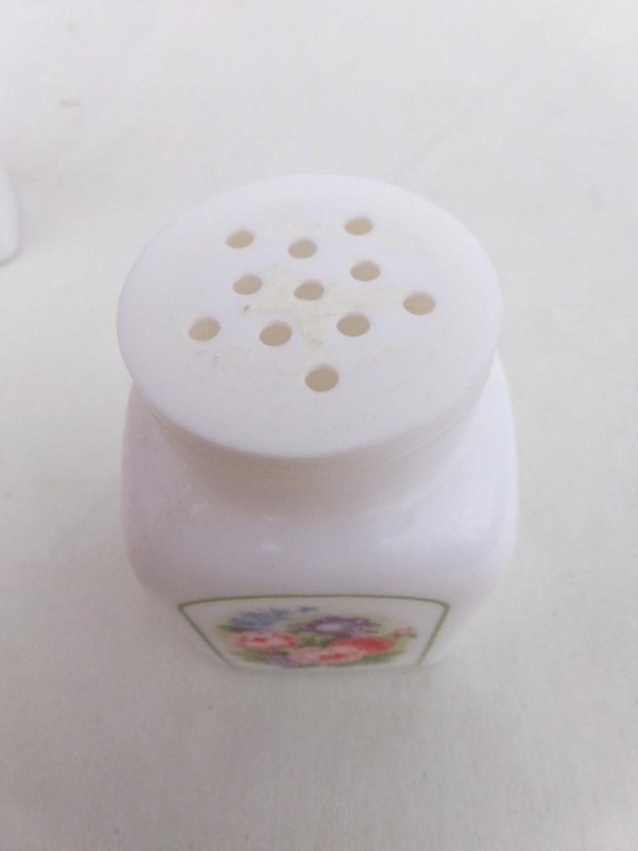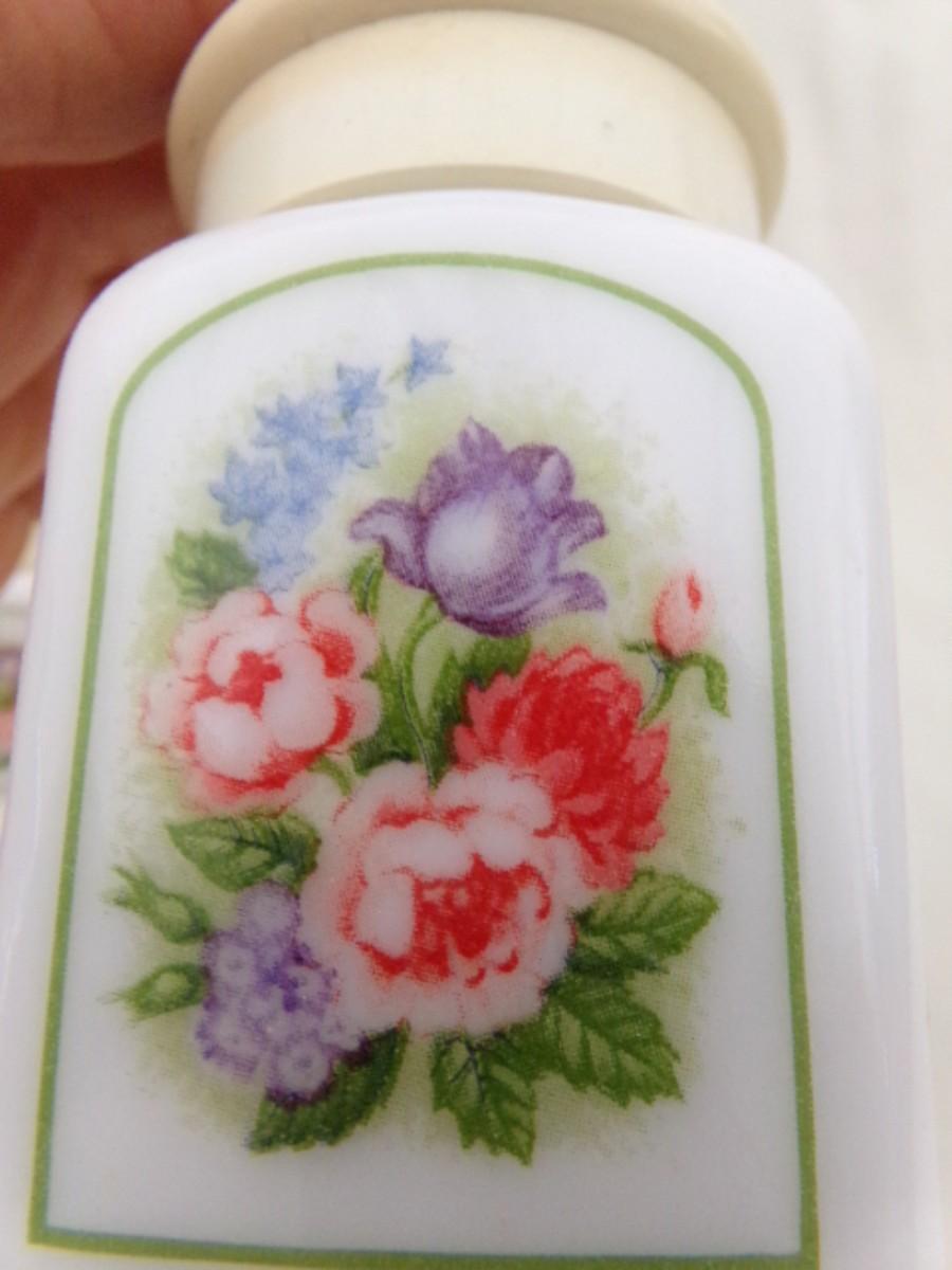 pair Avon “Country Garden” powder sachets. Milk glass w/lift off caps, about 3-1/4" tall.
