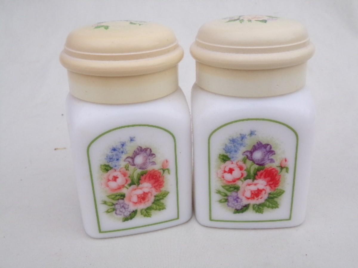 A pair of Avon “Country Garden” powder sachets. Milk glass w/lift off caps, about 3-1/4" tall.