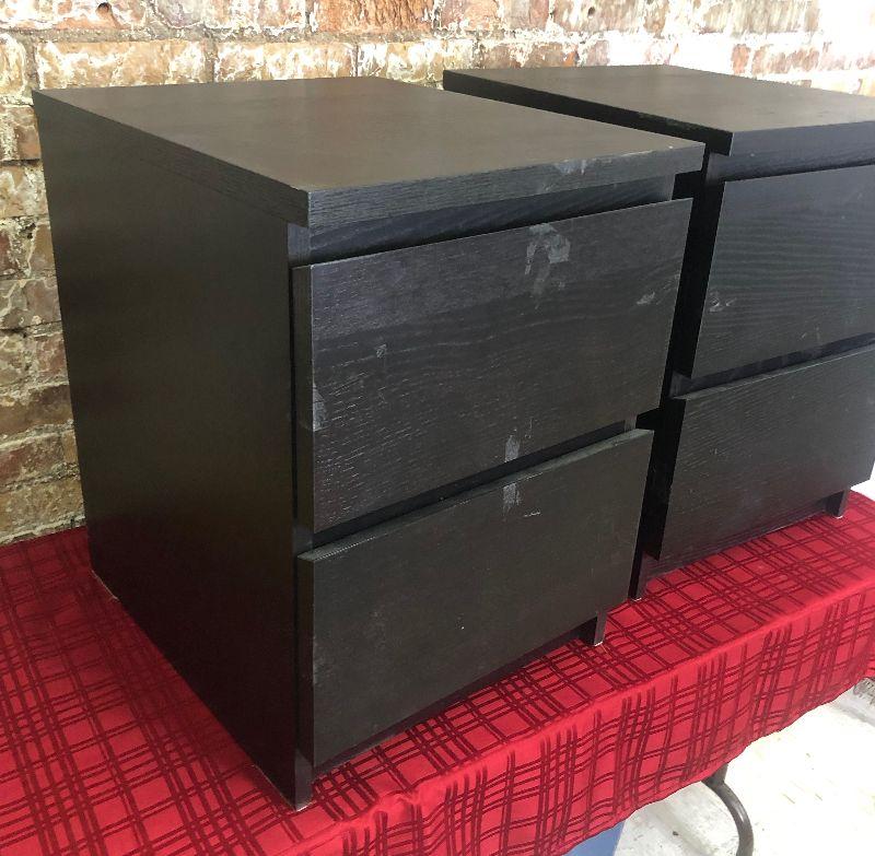 Here are a pair of contemporary night stands in black....Light normal use...19 x 16 x 22"...