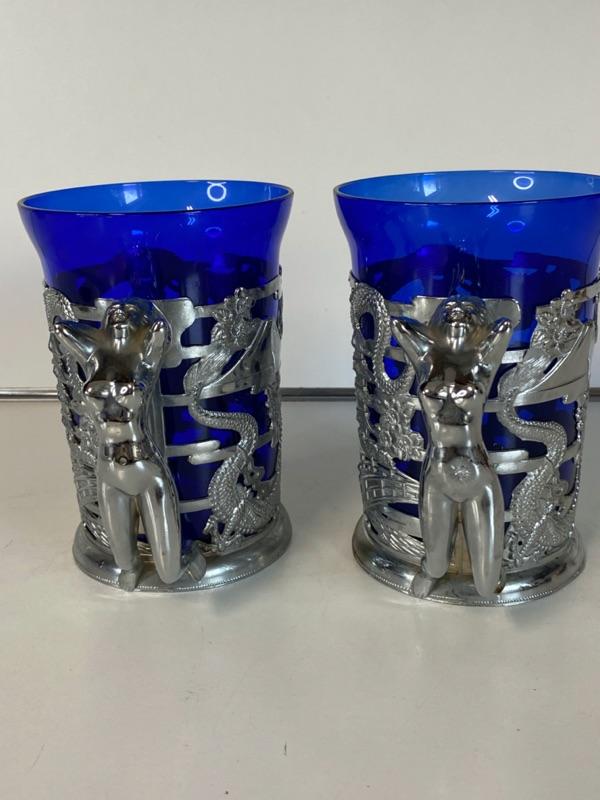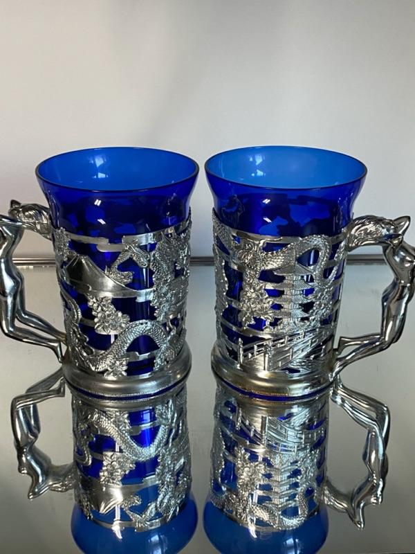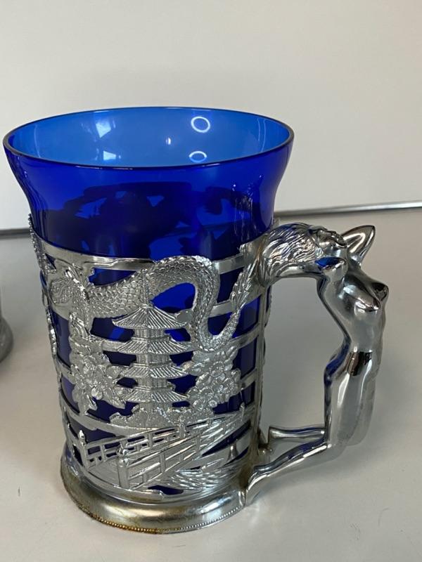 Pair Blue Japanese Glass & silver Plate Sailor's Tankard
