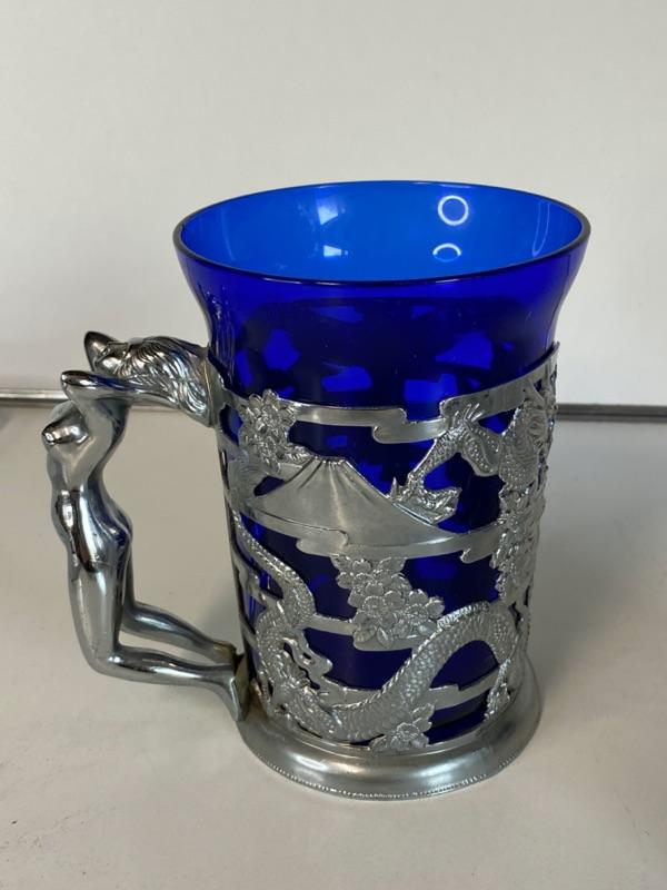 Rare colbolt blue glass tankard rests inside silver plate sleeve with deco style female figure handle. Images of Mt. Fuji and Five Storied Pagoda "Fujiwara"