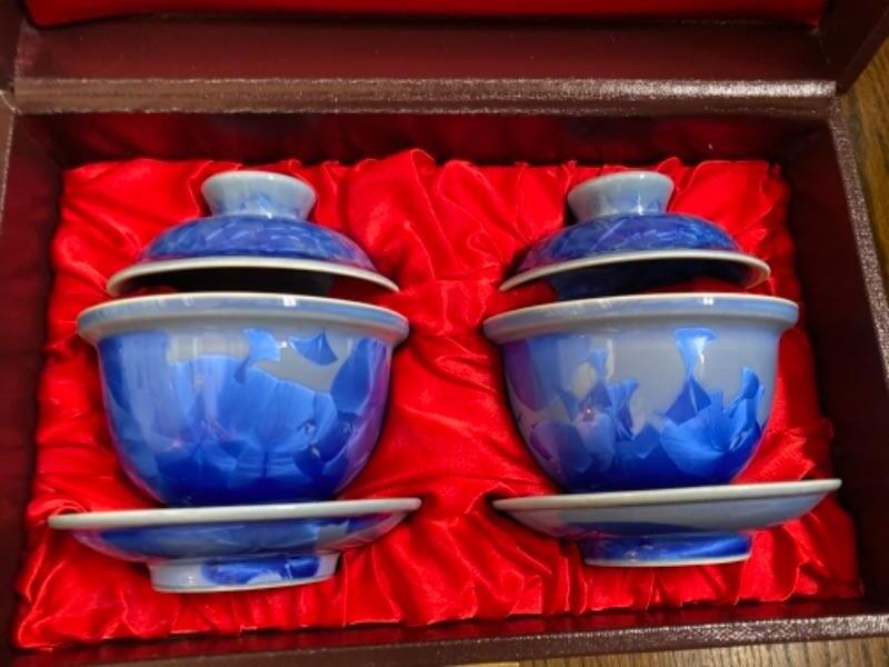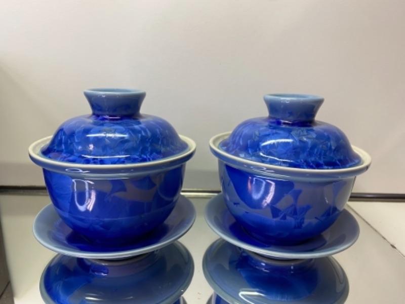 Pair Boxed Chinese Crystalline Blue Glazed Bowls/ lids/ saucers