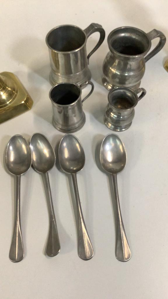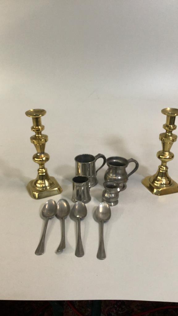 10 Inch Tall Candlesticks, 4- Pewter Serving Spoons, 4 Pewter Tankards/ Measure