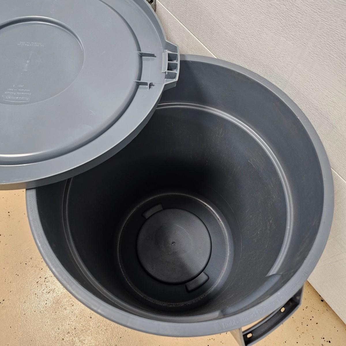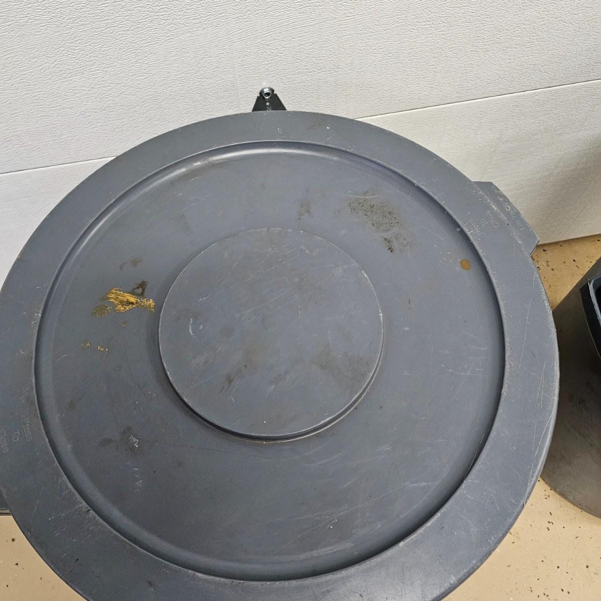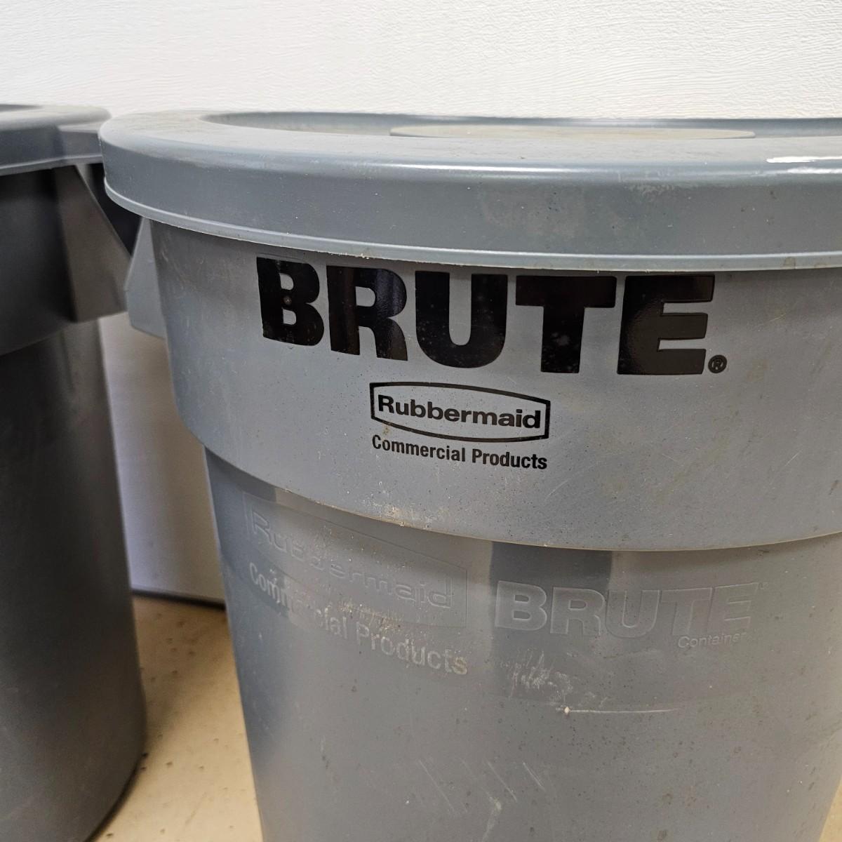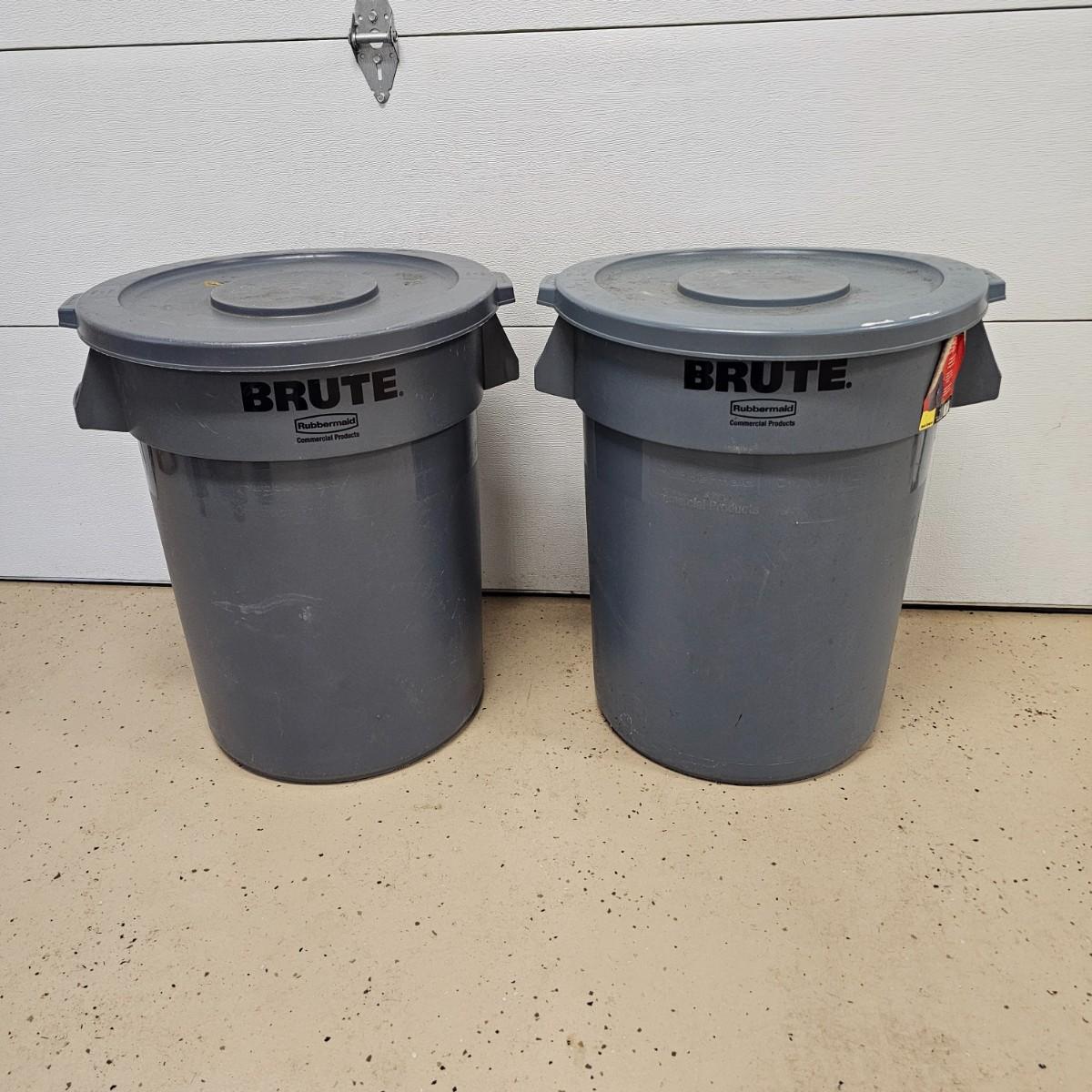 Two dark grey Brute by Rubbermaid trash cans and lids. Cans are used but in good condition. Measure 24" D x 27"H. See photos for details. Local pickup only.