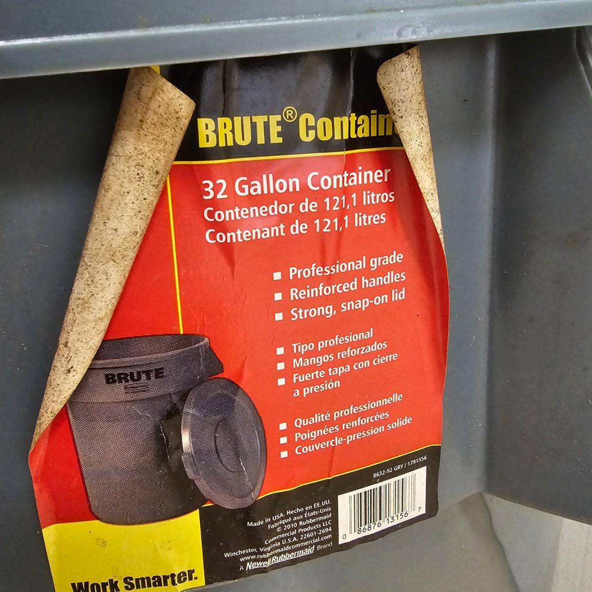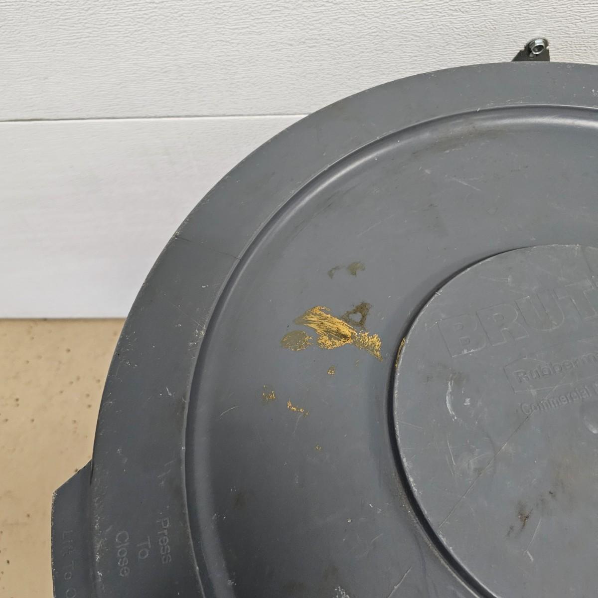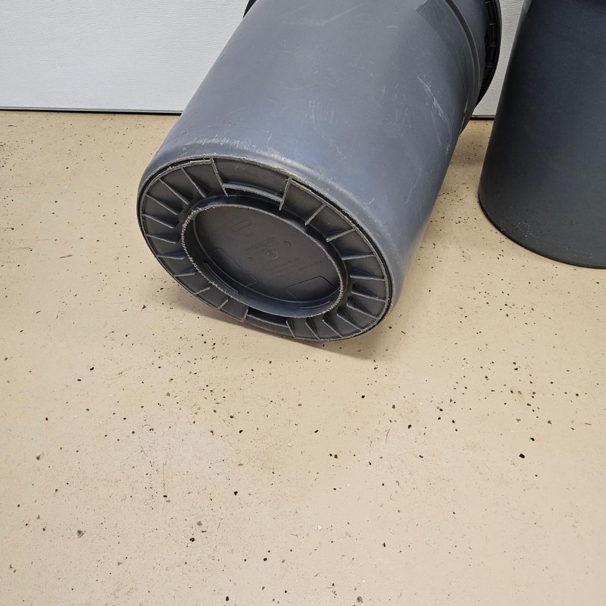 Two dark grey Brute by Rubbermaid trash cans and lids. Cans are used but in good condition. Measure 24" D x 27"H. See photos for details. Local pickup only.