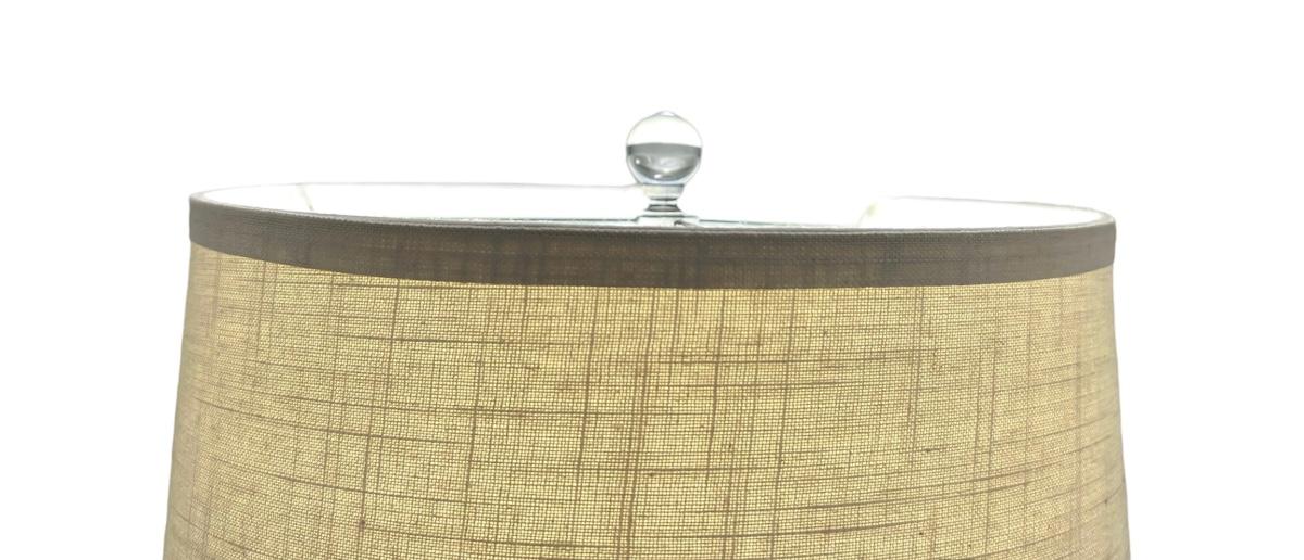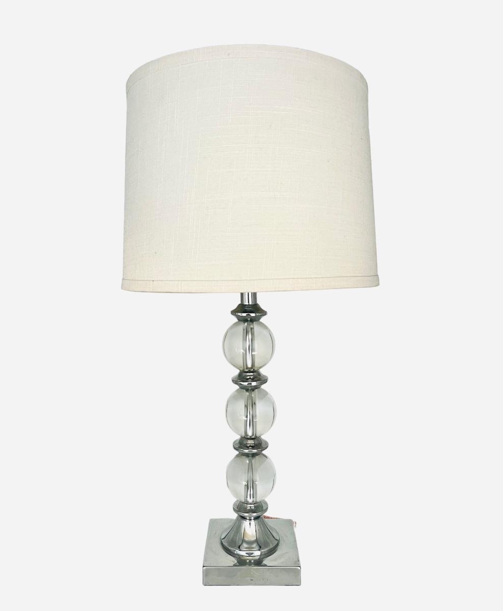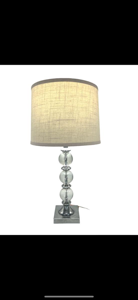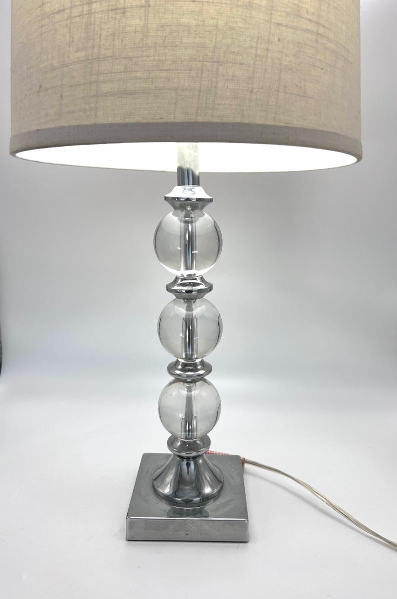 Pair of Crystal ball table lamps with chrome color base. Shades are light off white linen color. Measures 28 inches tall. Bulbs not included.