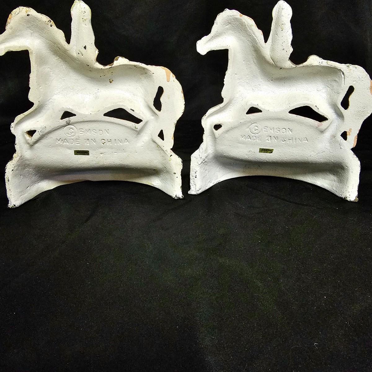 Pair of cast iron doorstops in carousel horse style. Each measures 6" x 2.5" x 7"h. Some discoloration on bases. See photos for details. Shipping available.