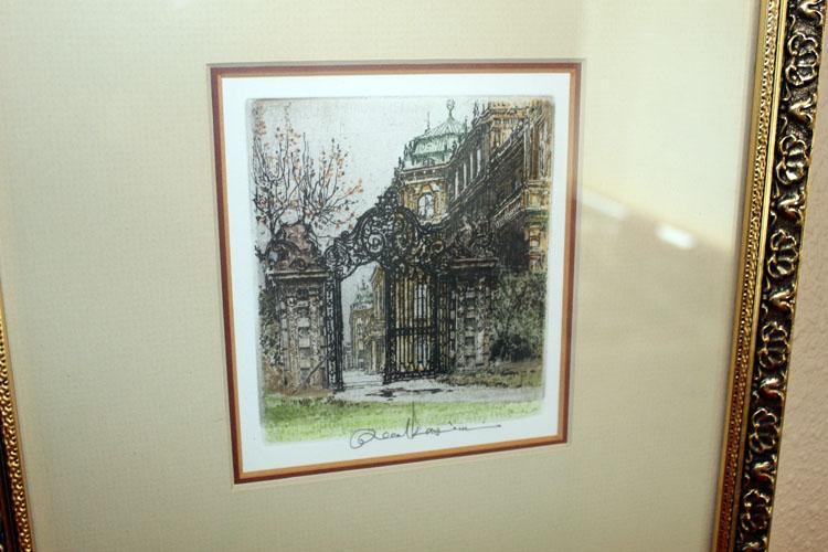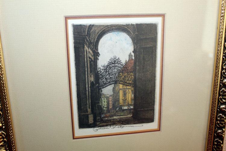 Pair etchings of ornate metal gates, sight size 4" x 6", framed