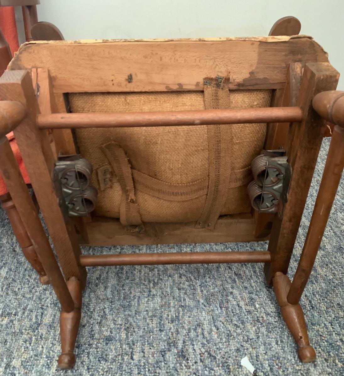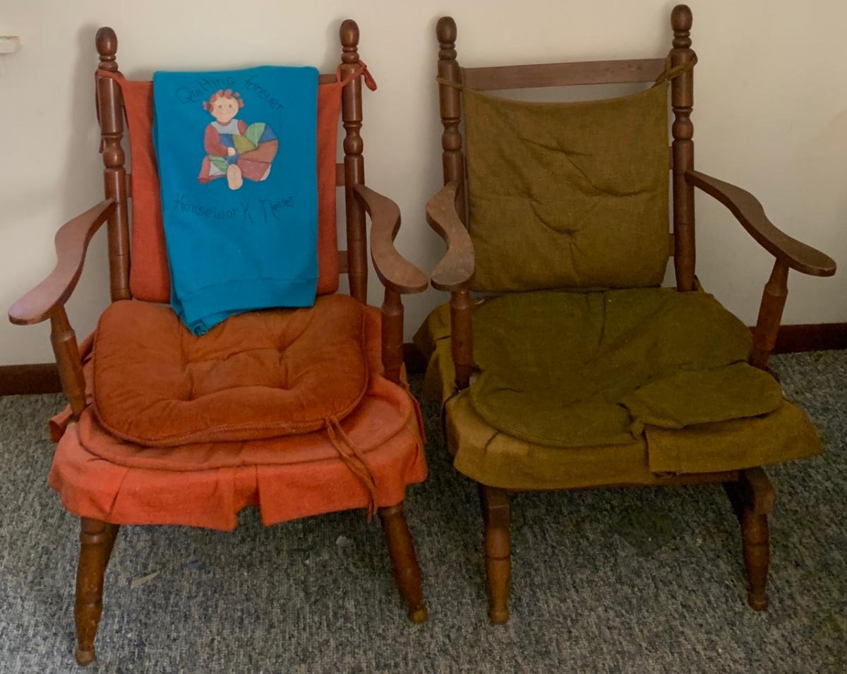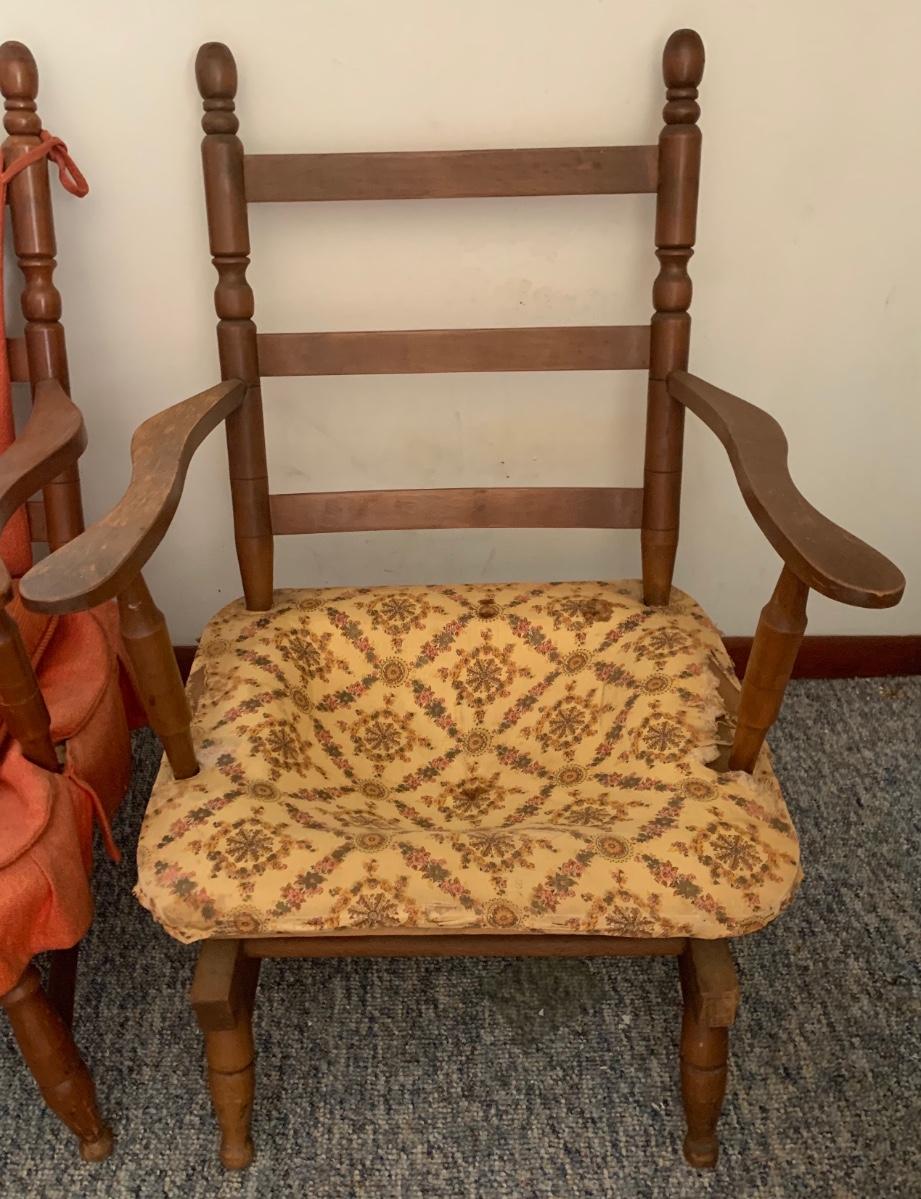 Pair of vintage Ethan Allan wooden armchairs. One with green upholstery is is a stationary chair, the one with orang upholstery is a rocker. Both need their seats re-strapped.