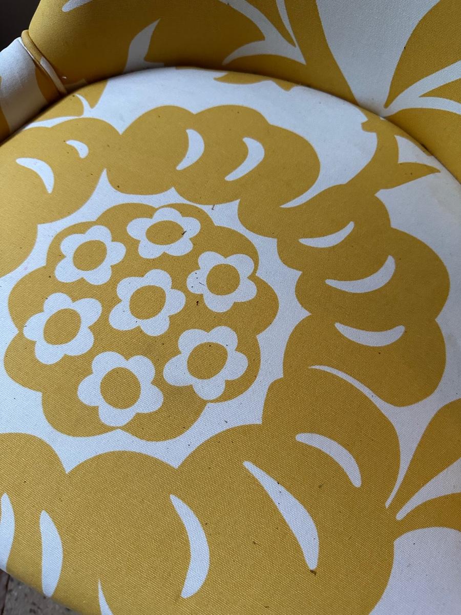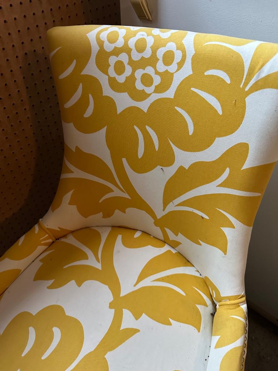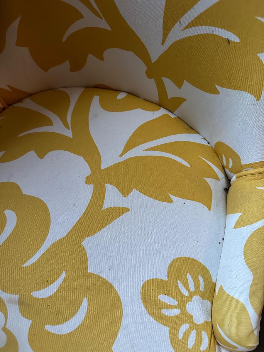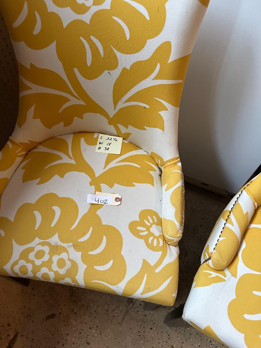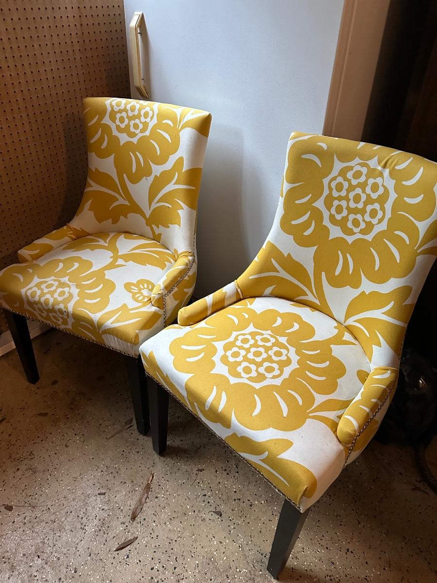 PAIR GOLD WHITE ACCENT CHAIRS, A FEW SPOTS, NEEDS CLEANING