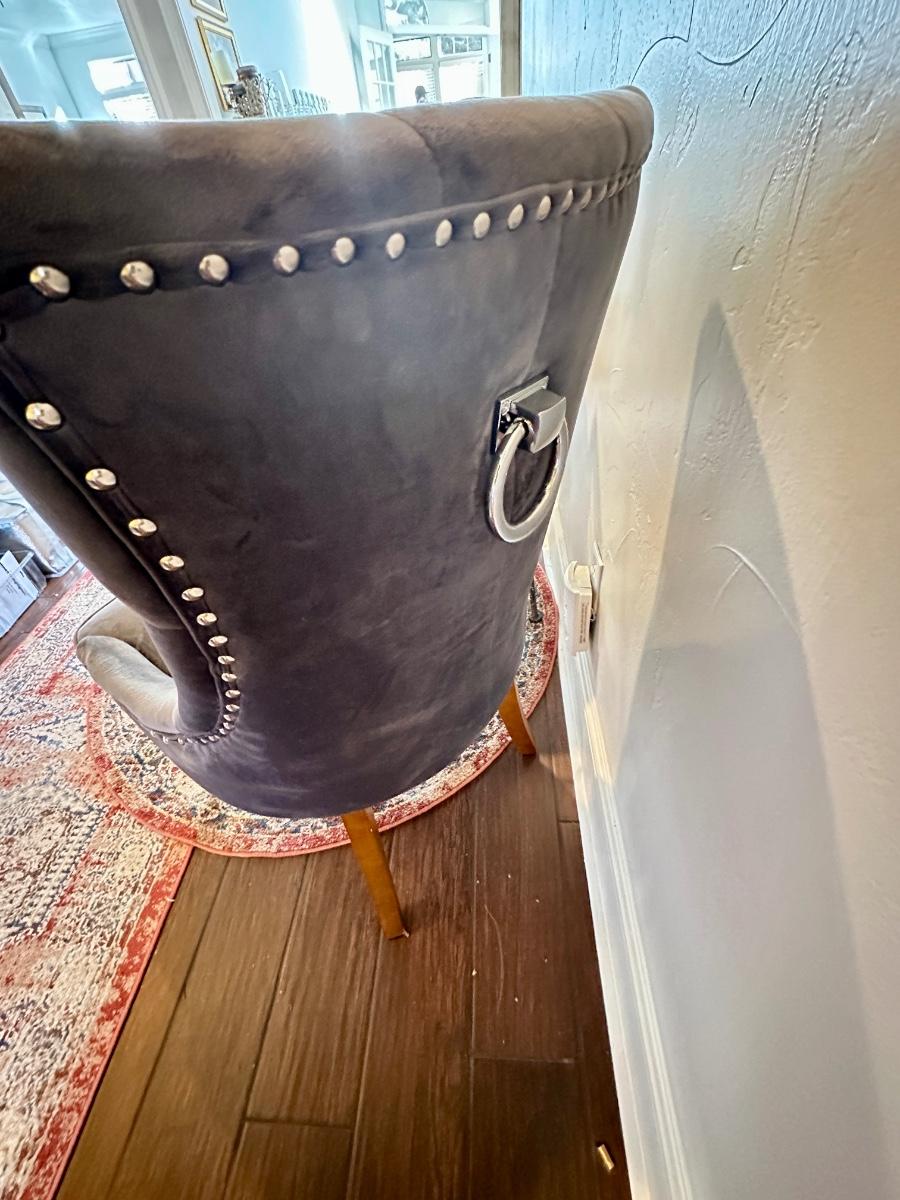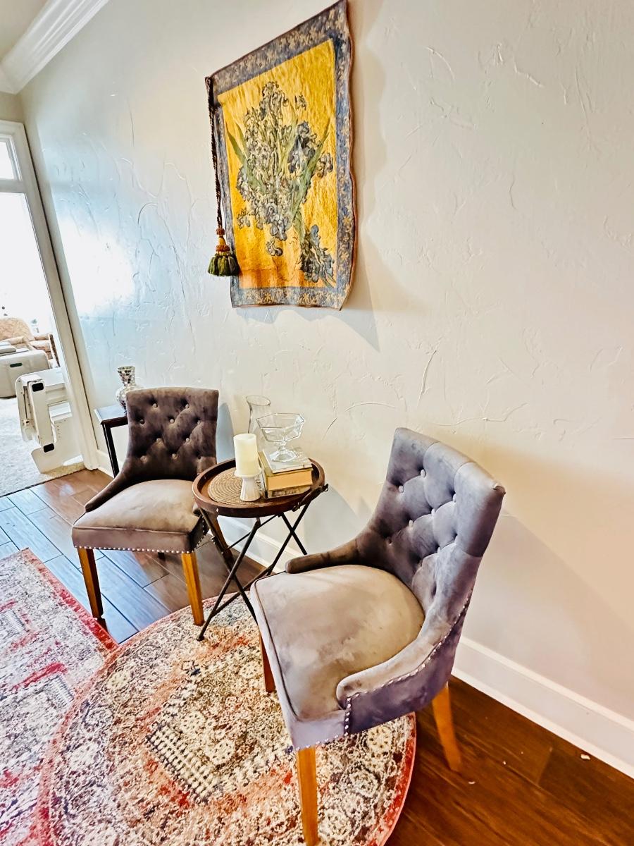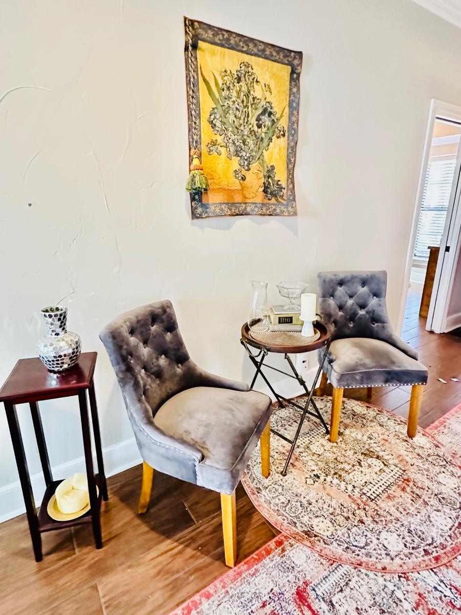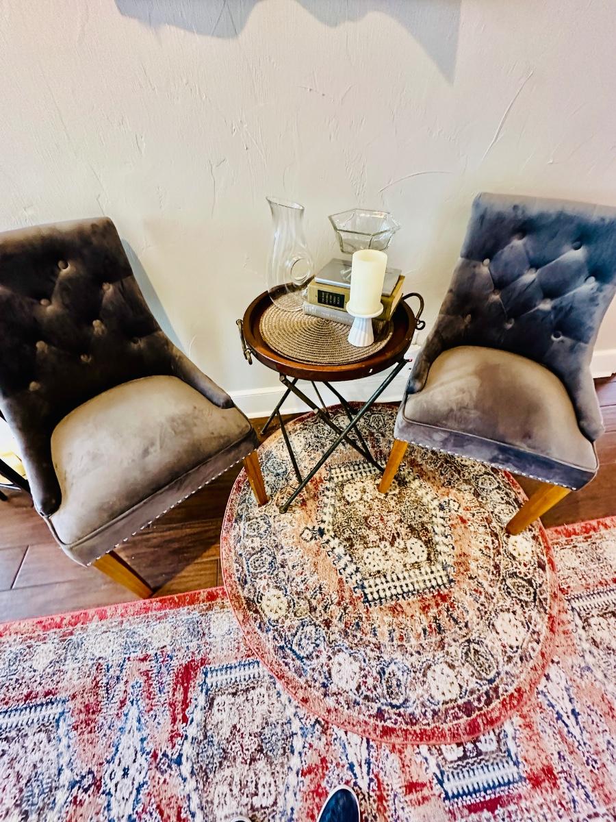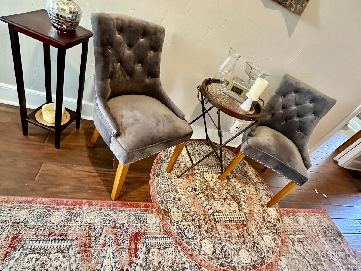 Pair Gray Velvet Chairs, 2 rugs, 2 Side tables + Decor