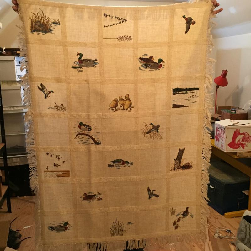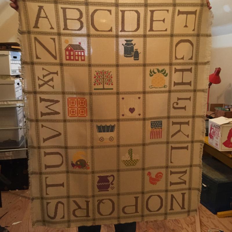Pair of tan background counted cross stitch block throws. One is alternating blocks of ducks. 42" x 62" The other has an alphabet border with alternating blocks of colonial motifs. 44" x 55"