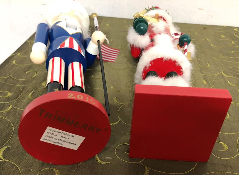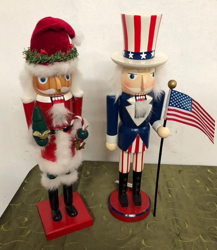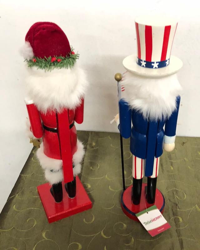 You're covered with this holiday pair of decorative handmade nutcrackers...one for Christmas the other for the 4th and 24th of July...Very good condition...they stand 15" high...