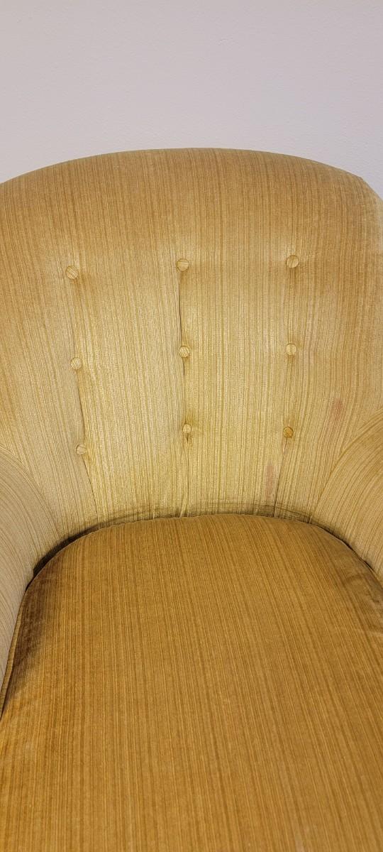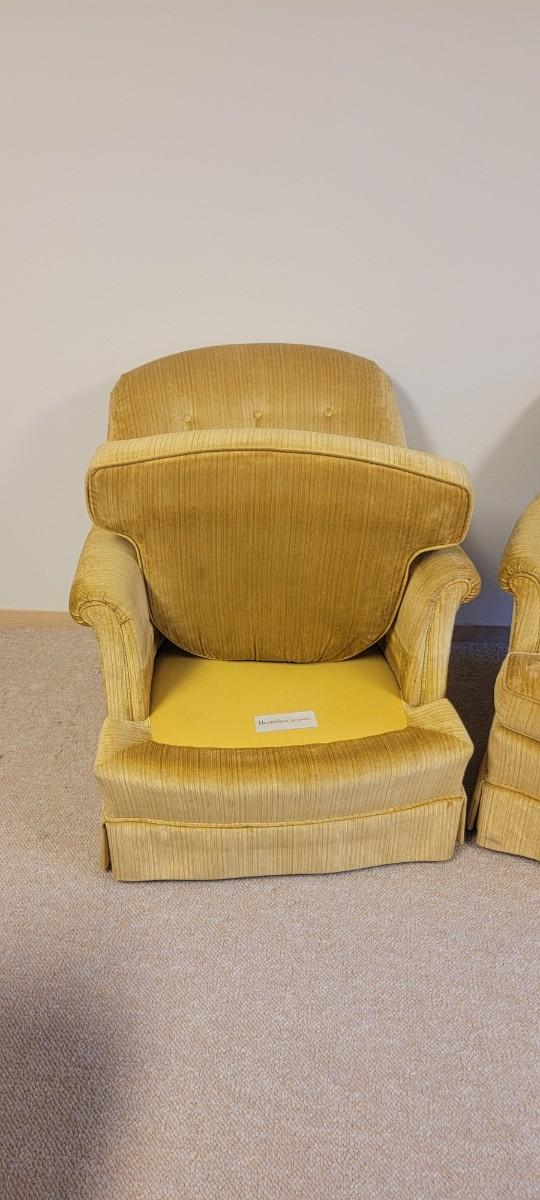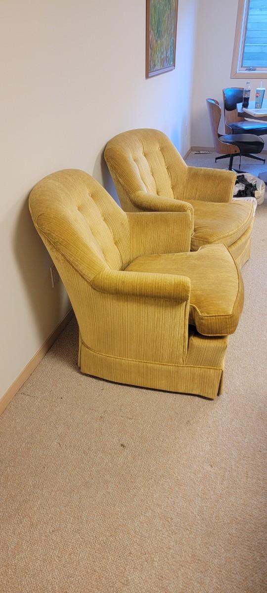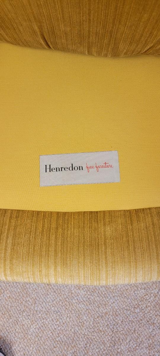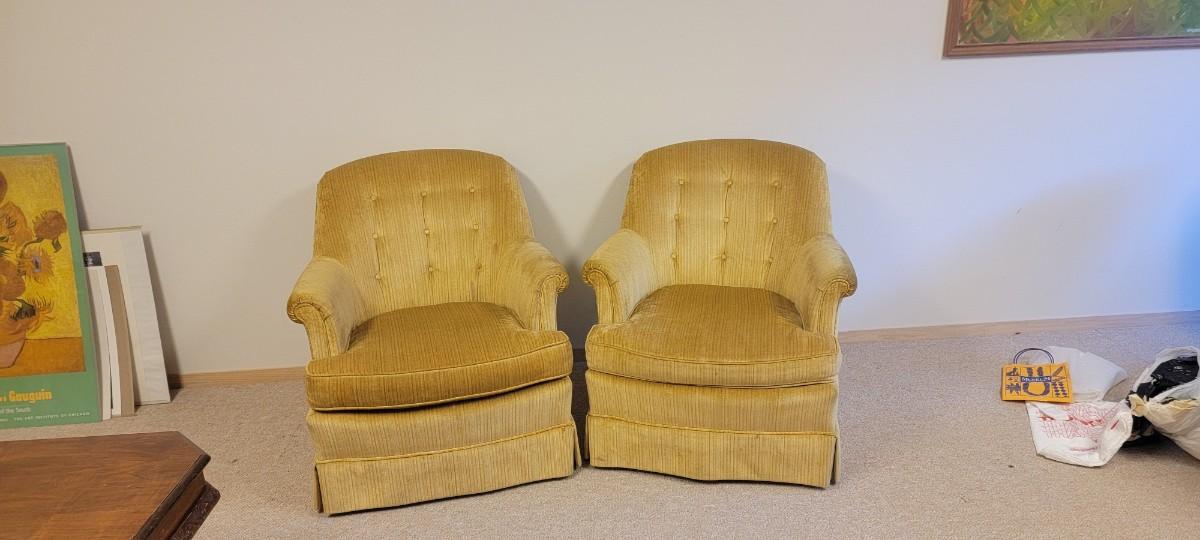 Pair upholstered Henredon fine furniture chairs. Rich gold color. Fabric velvet like. Button back. 28" across, 16" H seat 33" H back