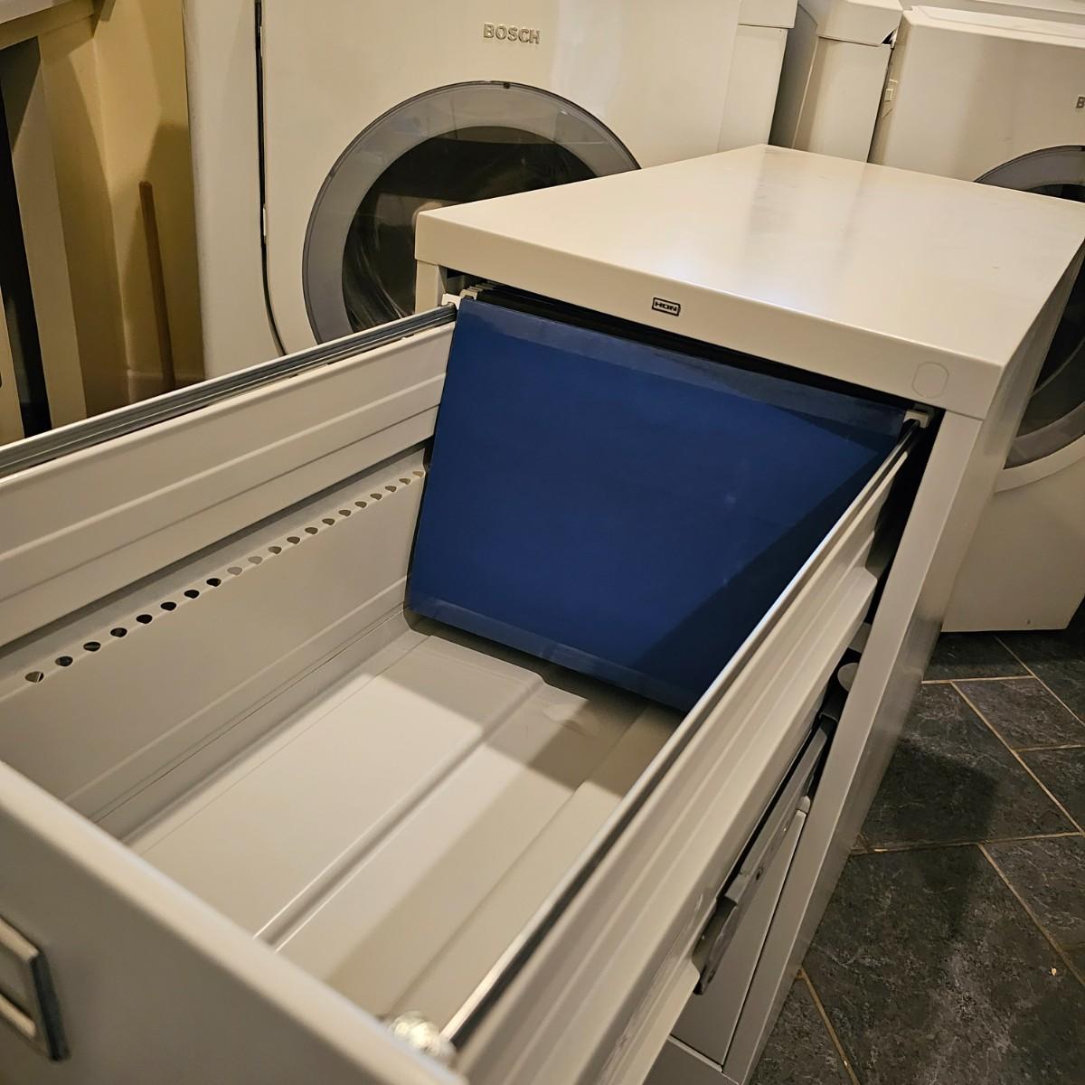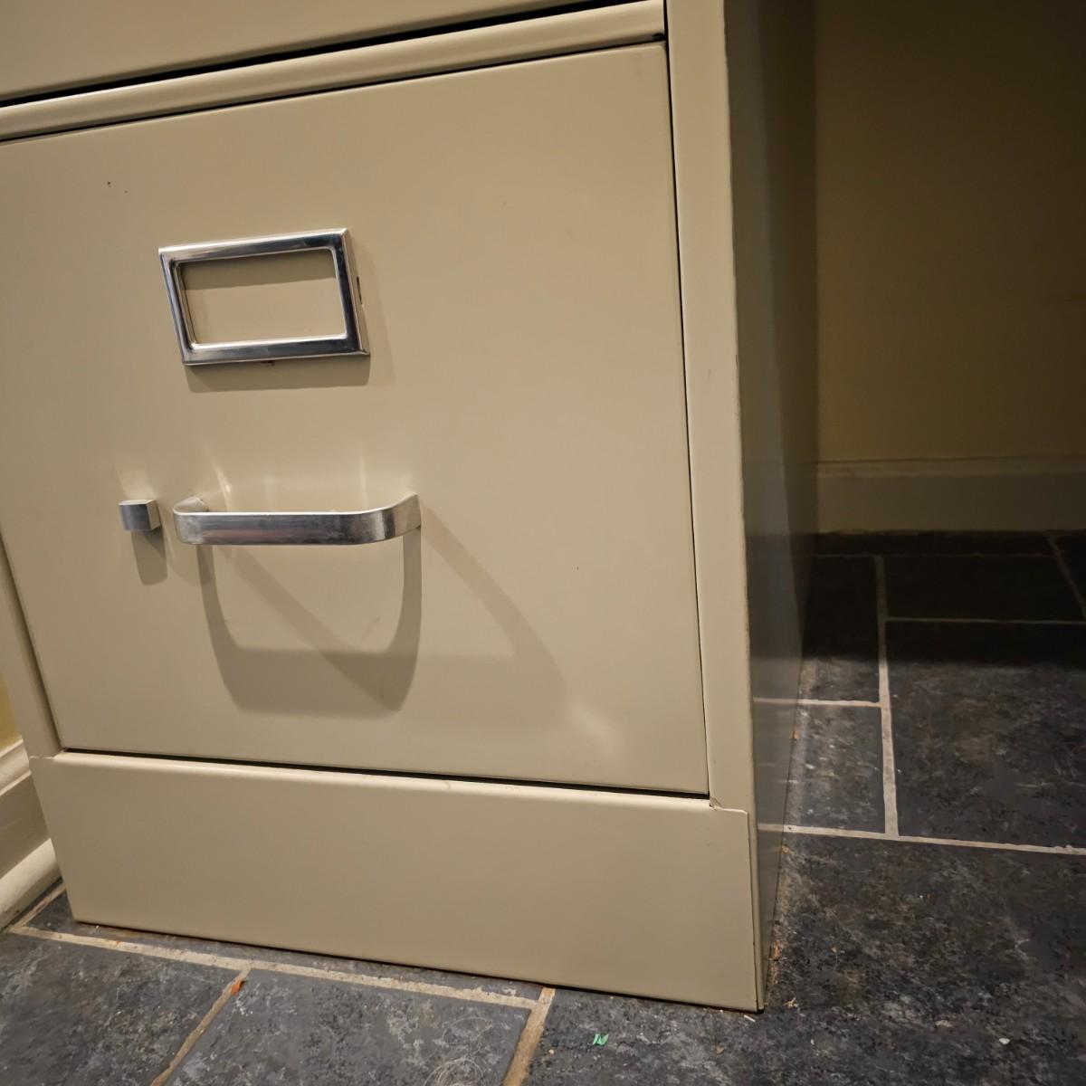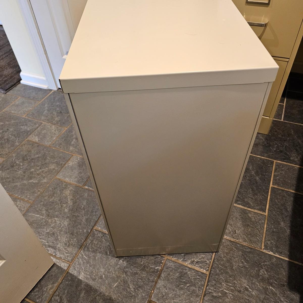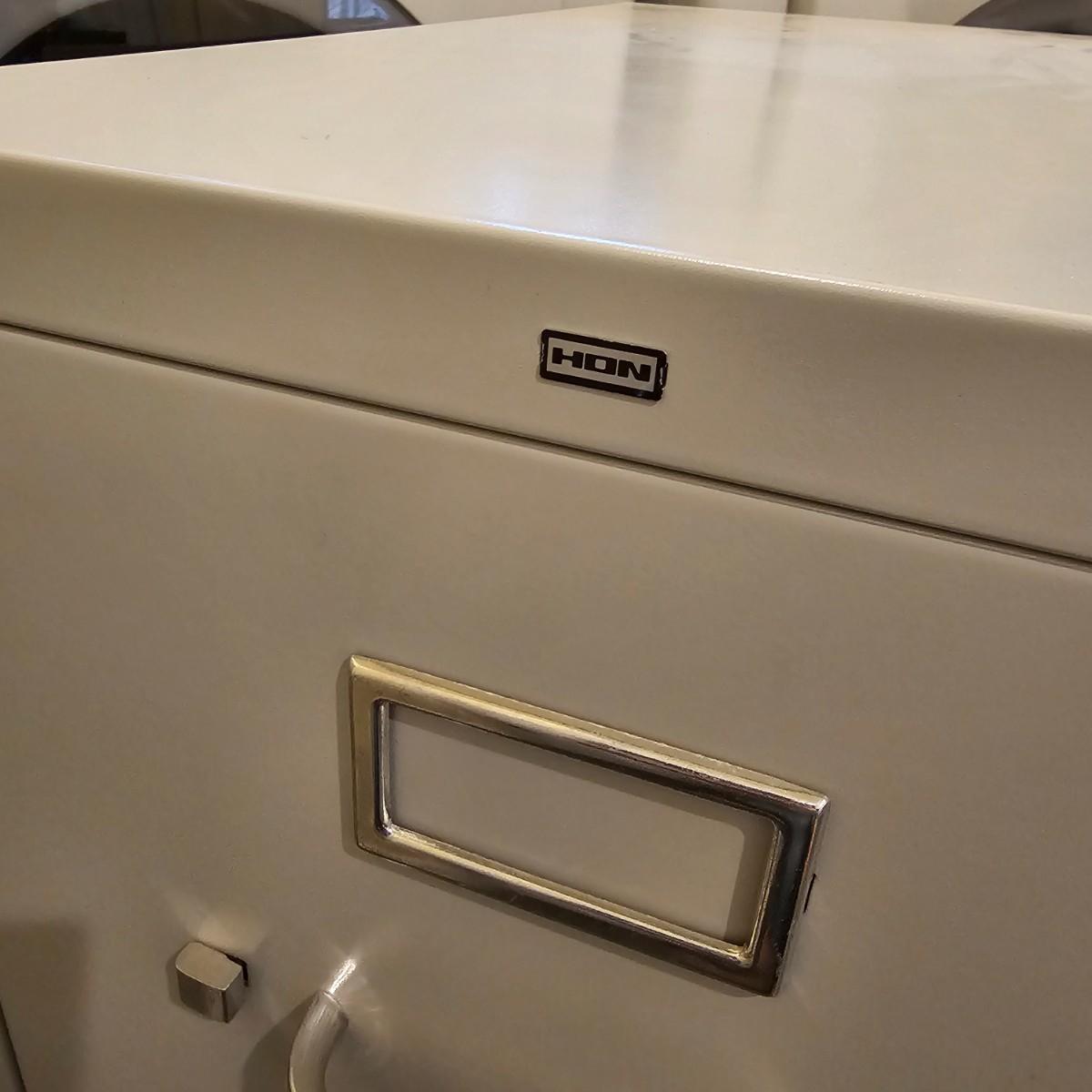 Two steel Hon brand filing cabinets, each with two drawers. One putty color, the other taupe, each cabinet measures 26.5" x 15" x 29"H. See photos for details. Local pickup only.