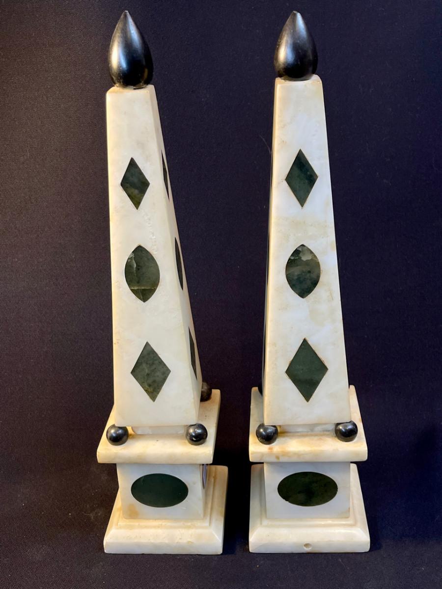 The subject item for sale is a pair of classic standing obelisks rendered from a white marble stone and inlaid with black geometric shapes. The classic base supports the obelisk in ball feet and is finished with stepped edging. The pieces are both drilled and fitted as a lamp base. The.loose tops could then double as shade finials.