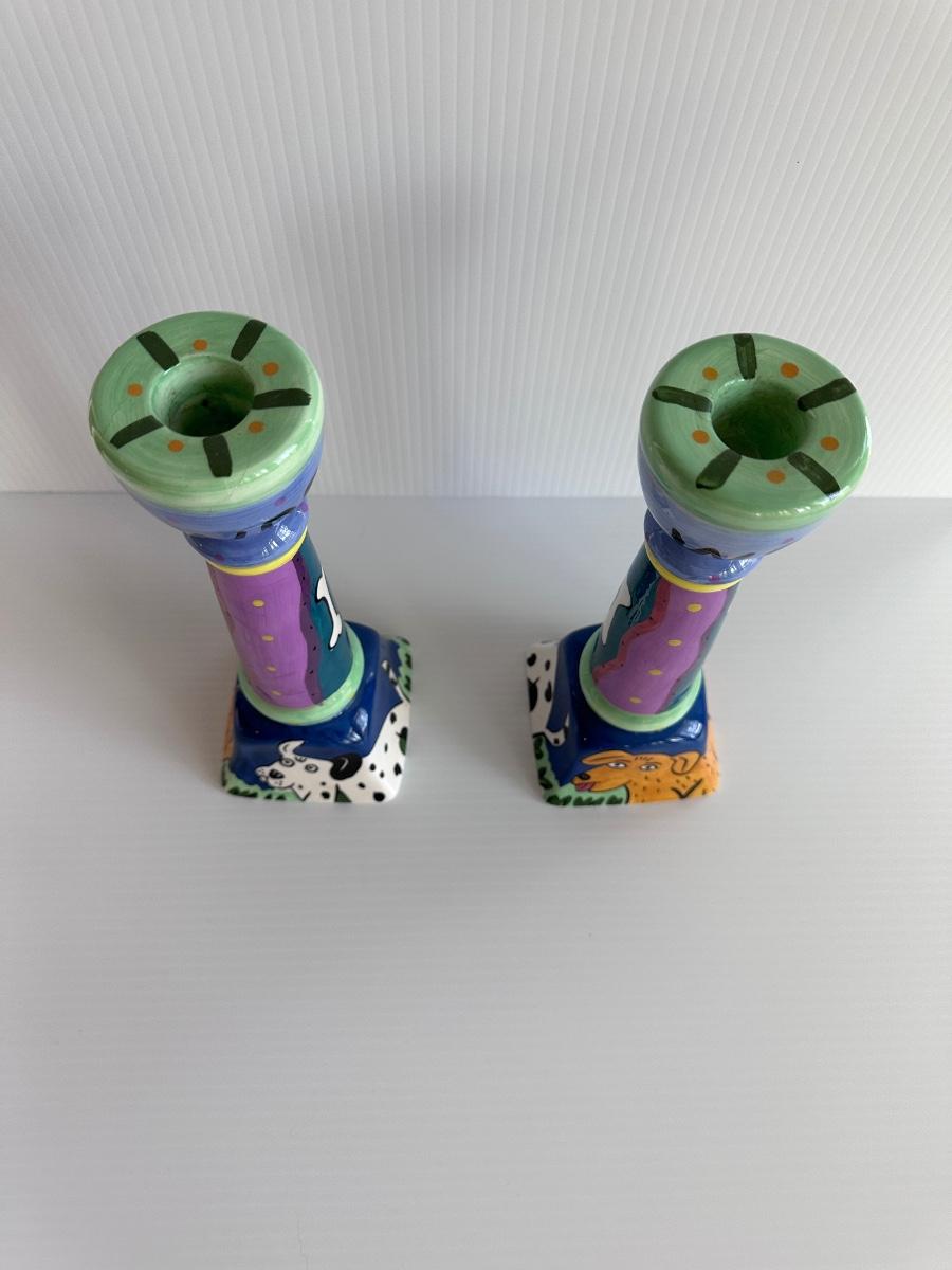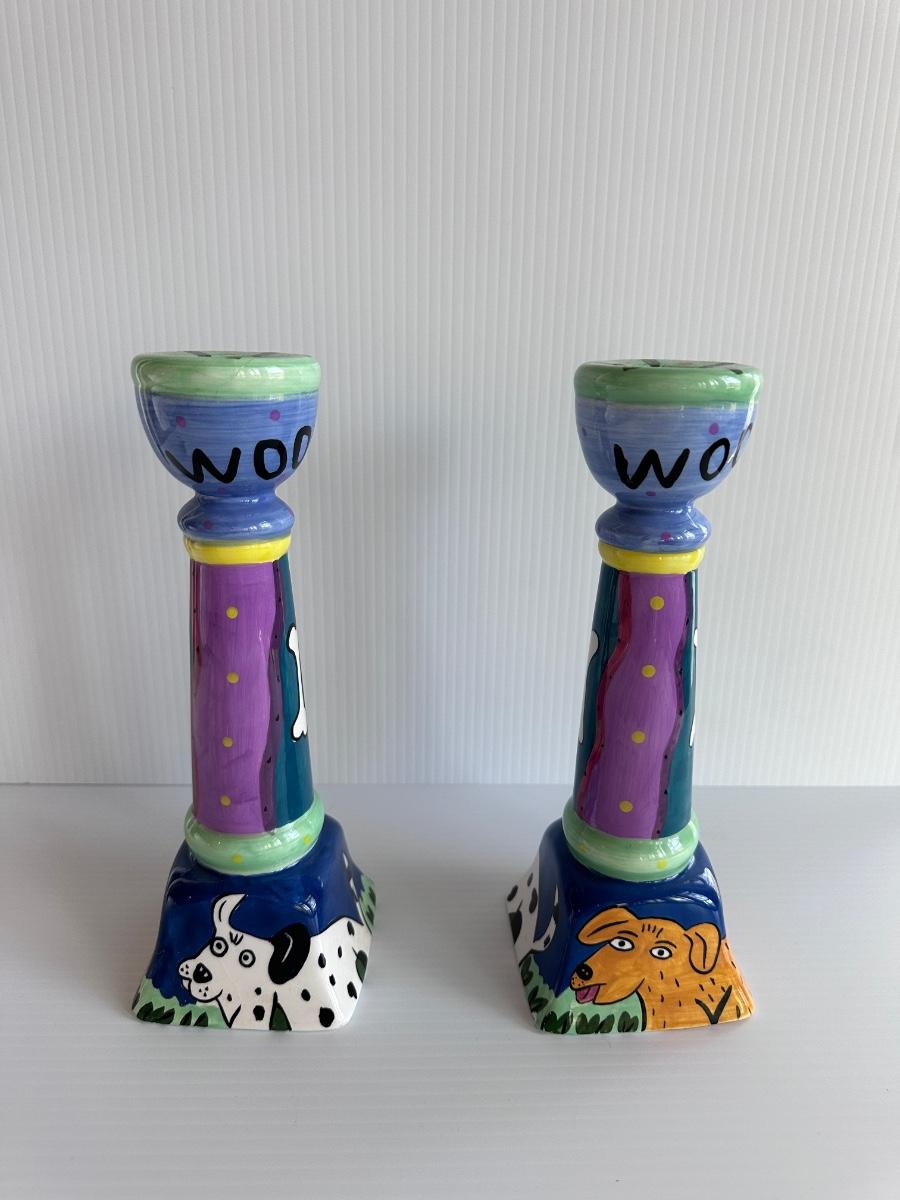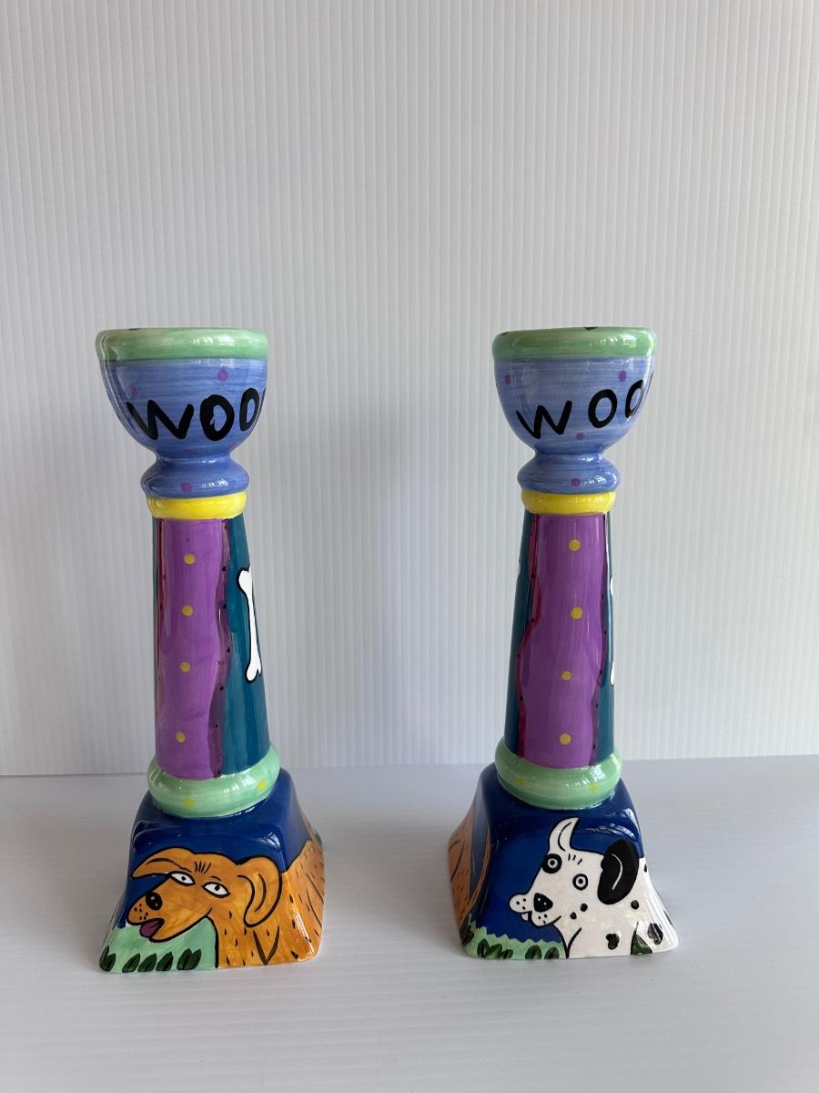 Pair of Happy Dog & Cat Choler candlesticks by Karen Gelff.