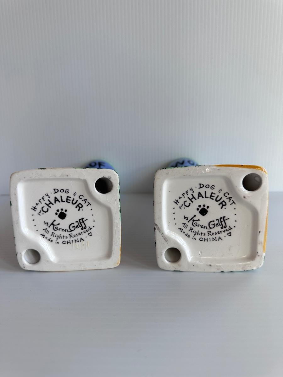 PAIR, KAREN GELFF HAPPY DOG & CAT CHALEUR CANDLESTICKS