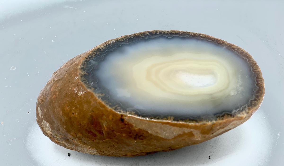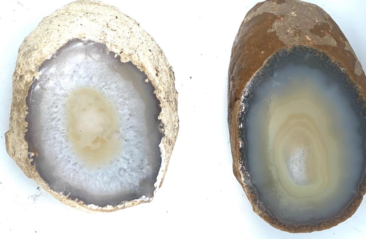 Two large sliced minerals with wonderful luminous crystalline interior, one like a robins egg blue, the other a bubbly white. About 5 x 4 x 2”