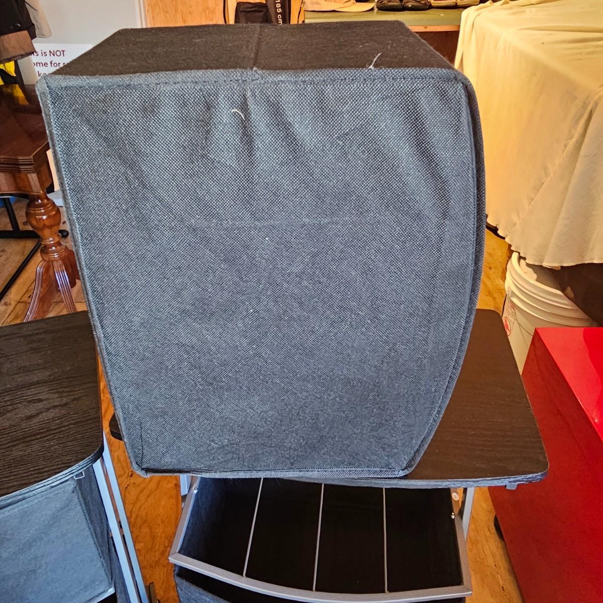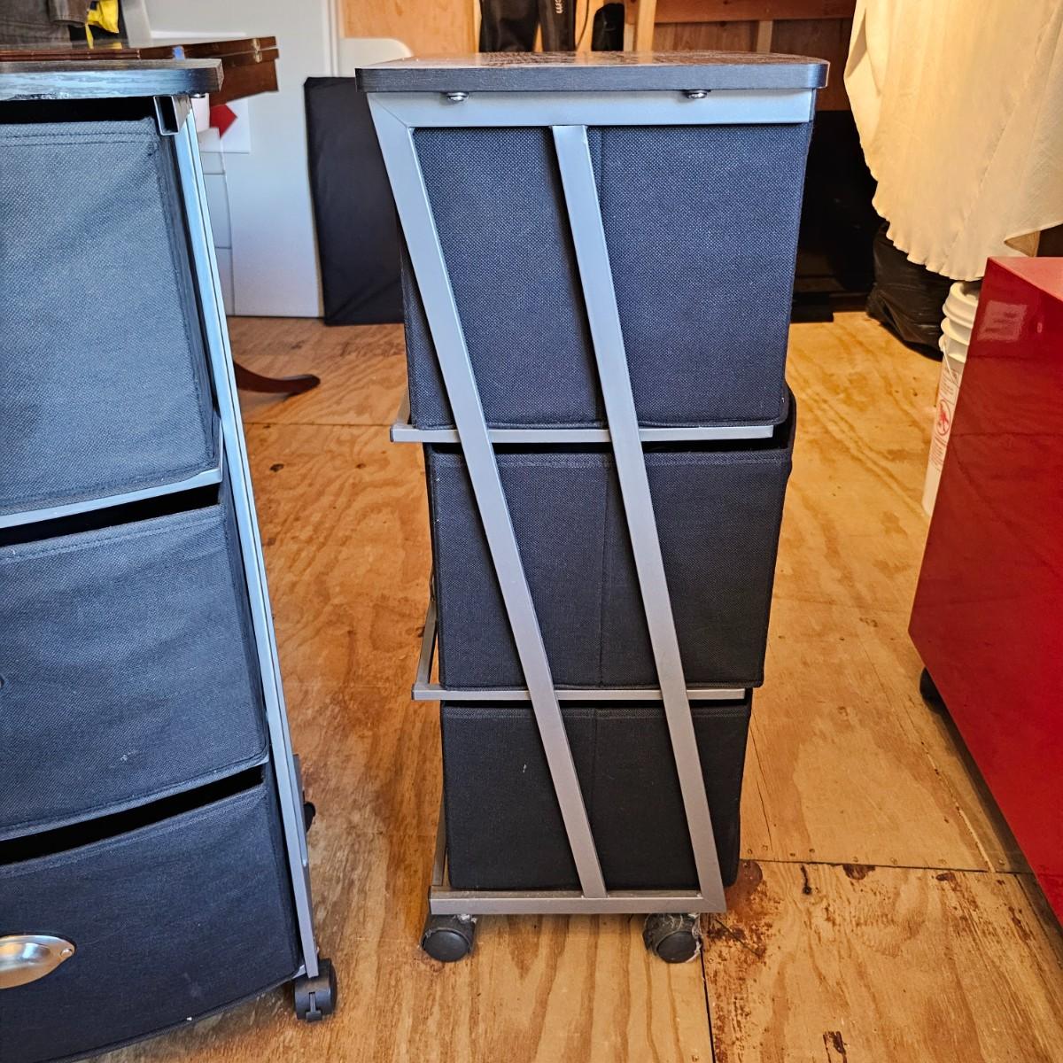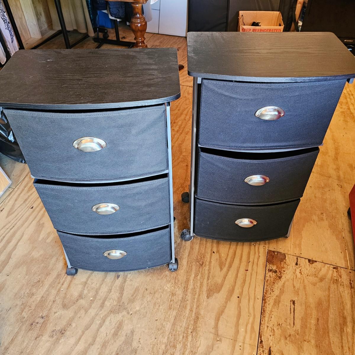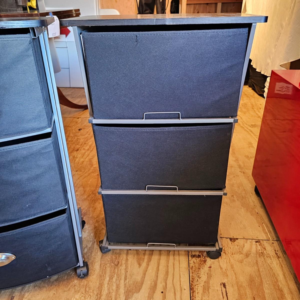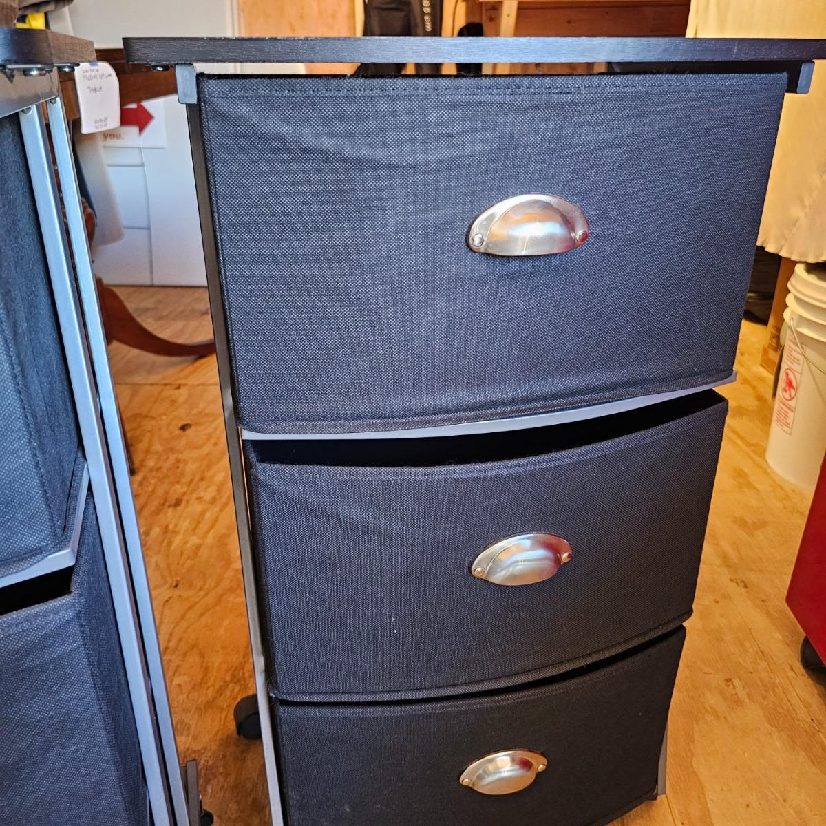Two black matching three drawer softside storage racks. Metal frame with fabric covered drawers and metal handles. Each unit measures 18" x 12" x 30"H, has rolling casters. See photos for details. Local pickup only.