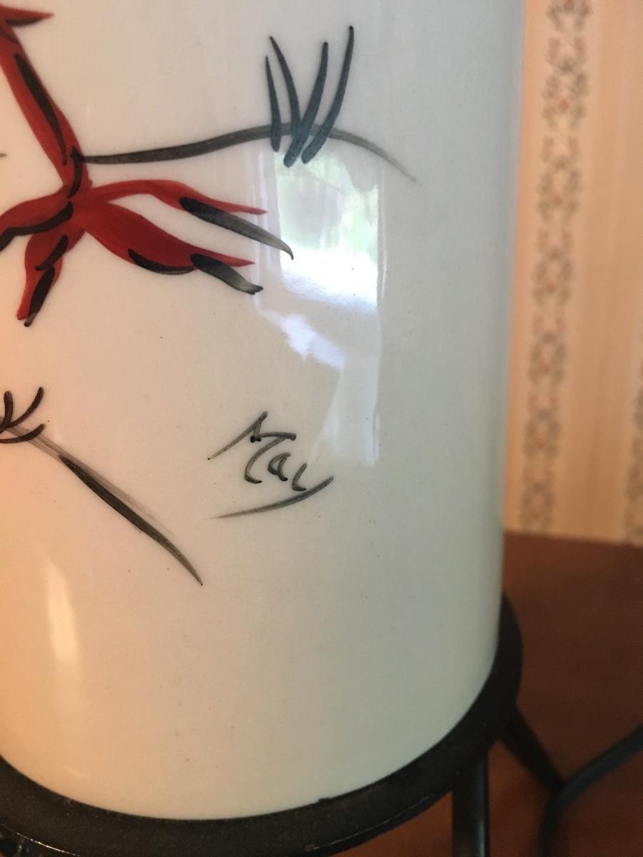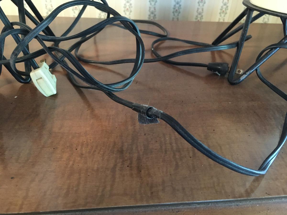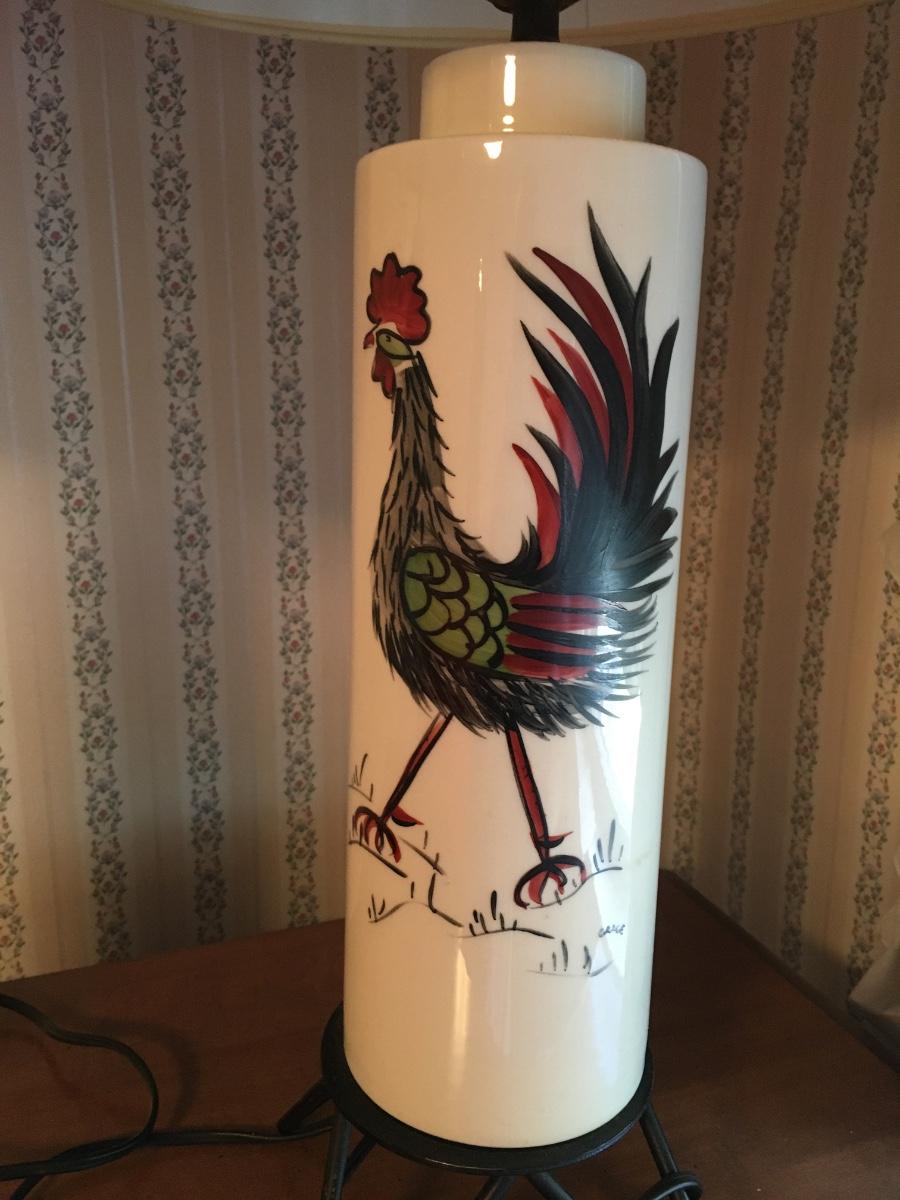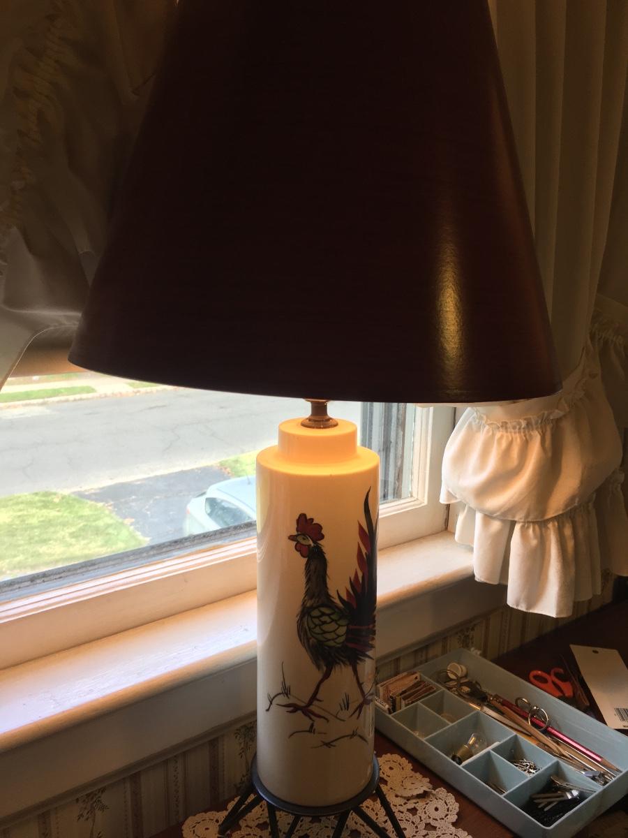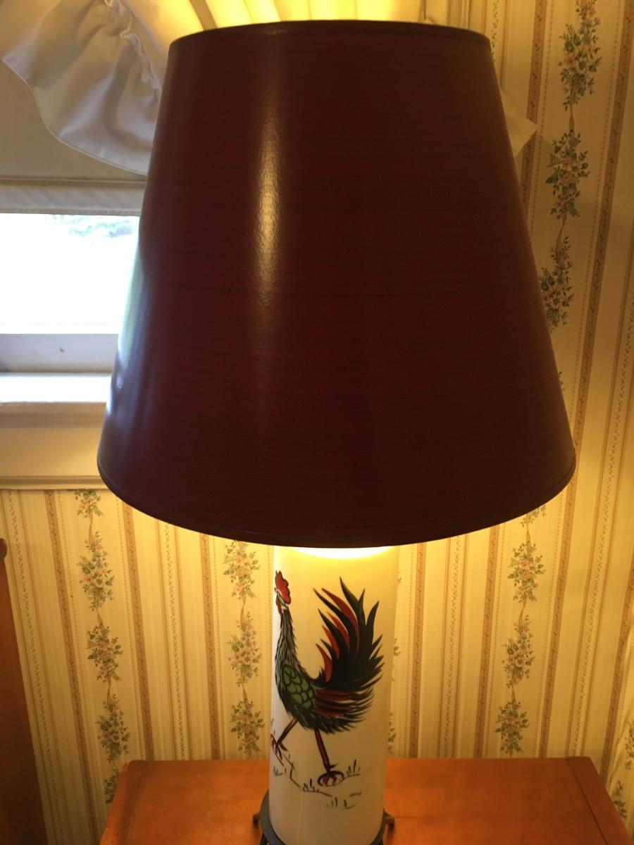 Very cool pair of rooster painted lamps with wire base. Old cords which would be beter if replaced. Lamps and shades in excellent condition.