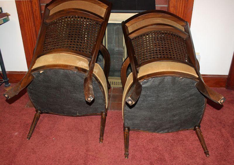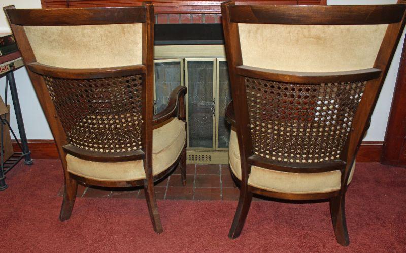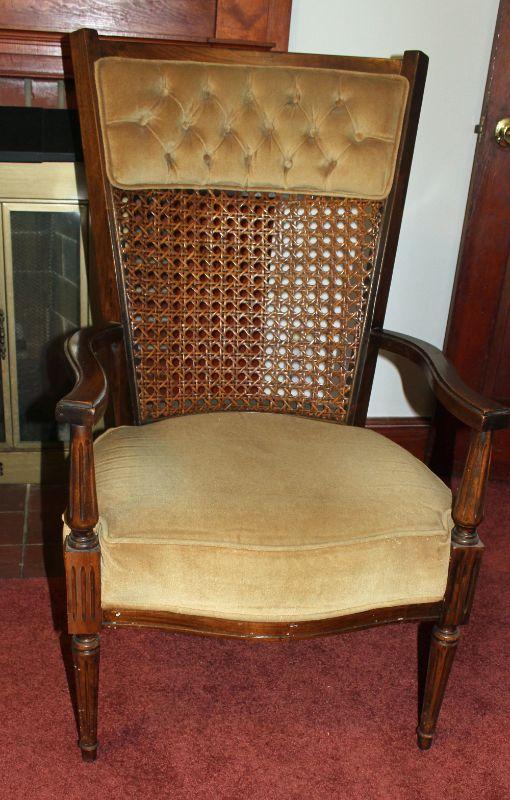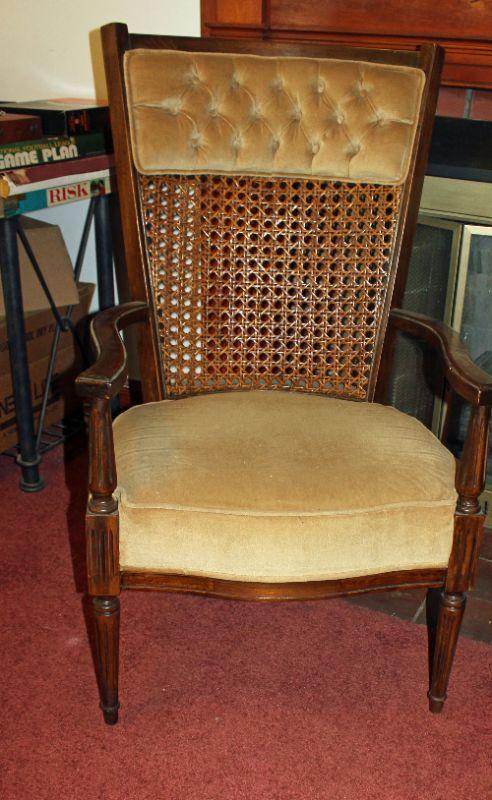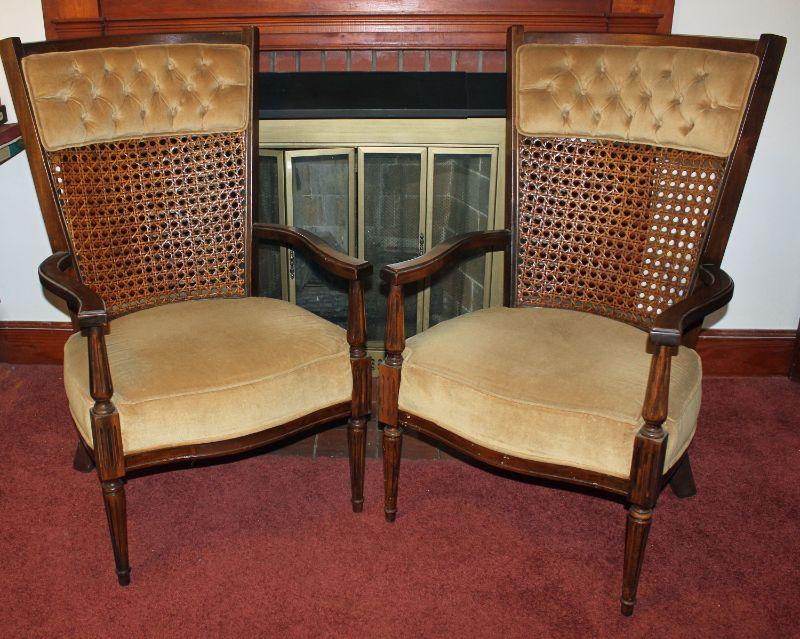 Pair of wood chairs with cane backs and gold velvet head rests and seats. In excellent vintage condition. Each chair is 21" from front to back, 25" side to side and stands 40" high