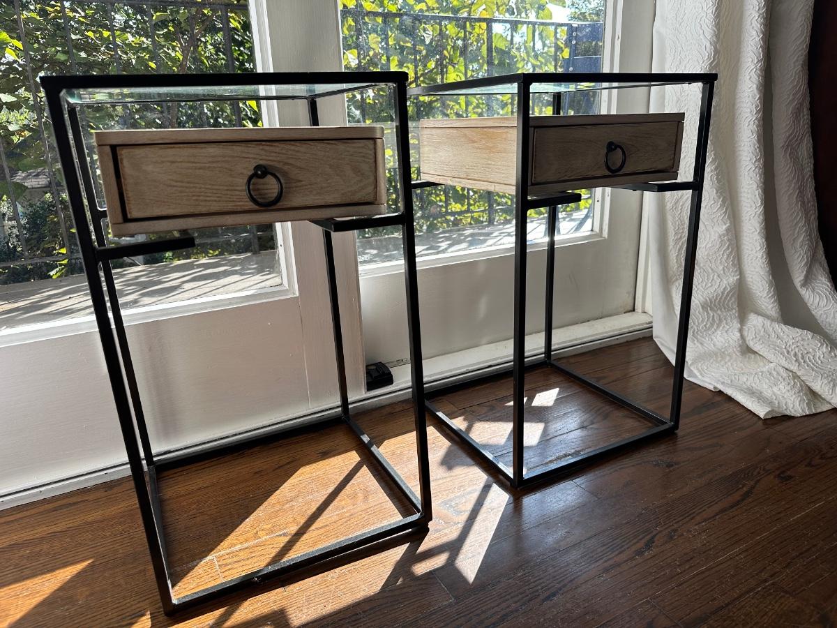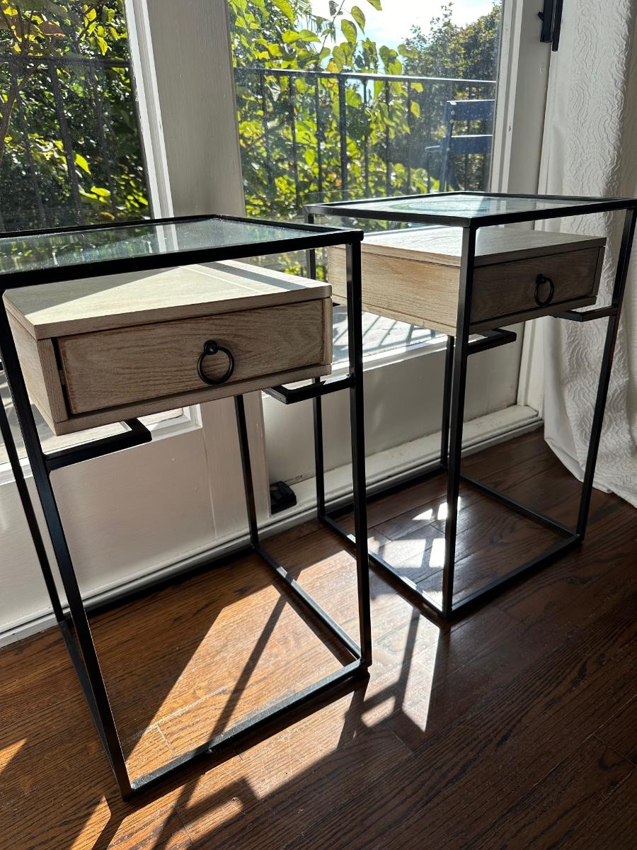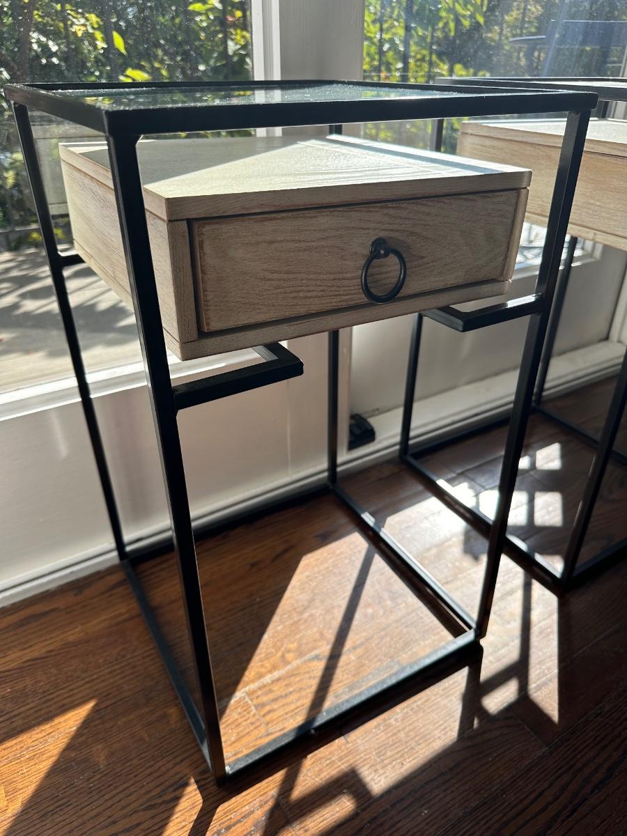 PR MODERN END TABLES, IRON BASE, GLASS TOP, 1 DRAWER 14X14X23 1/2" TALL